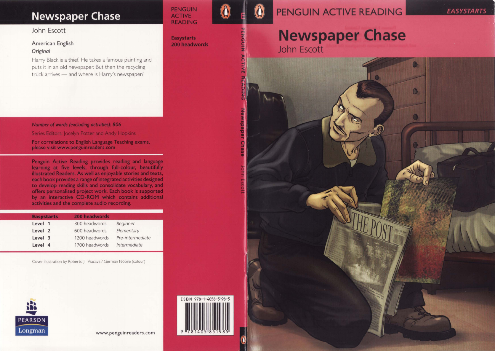American English Original Harry Black is a thief. He takes a famous painting and puts it in an old newspaper. But then the recycling truck arrives - and where is Harry's newspaper? Level Level 2 Level 3 Level 4 600 headwords 1200 headwords Pre-intermediate 1700 headwords Intermediate Cover illustration by Roberto J. V,acava I German Nobile (colour) .1. III ..... www.penguinreaders.com IS B N 978-1-4058-5198-5 9 LJ J985 Pearson Education Limited Edinburgh Gate, Harlow, Essex CM20 2)E, England and Associated Companies throughout the world. Pack ISBN: 978-1-4058-5198-5 Book ISBN: 97S-1-4058-5095-7 CD-ROM ISBN: 978-1-4058-5096-4 First edition published 2002 This edition published 2007 57910864 Text copyright © John Escott 2002 Illustrations by Roberto). Viacava I German N6bile (colour) Set in 12.5/16.5pt A. Garamond Printed in China SWTC/04 Produced for the Publishers by AC Estudio Edirorial S.L. All rights reserved; no part of this publication may be reproduced. stored in a retrieval system, or trammitted in any form or by any means, electronic, mechanical, photocopying, recording or otherwise, without the prior written permission of the Publishers. Published by Pearson Education Ltd in association with Penguin Books Ltd, both companies being subsidiaries of Pearson Pic. For a complete list of the tides available in the Penguin Active Reading series please write to your local Pearson Longman office or to: Penguin Readers Marketing Department, Pearson Education, Edinburgh Gate, Harlow, Essex CM20 2JE, England. Newspaper Chase John Escott Easystart Series Editors: Andy Hopkins and Jocelyn Potter Activities 1 What's the book about? look at the picture on the front of this book. What do you think? Write answers. 1 Where is the man? 2 What is the man doing? 3 What is he putting in the newspaper? 4 Where is he putting the newspaper? 5 Why is he doing this, do you think? lIB What happens first? look at the pictures on page 1. 1 Are the sentences right (v') or wrong (X)? a The building is closed. o o o o o o b It is late at night. c The man works in the building. d The lights in the building are on. e The picture is small and new. f The man buys the picture. 2 Talk about the man. Is he a good man or a bad man? How do you know? II Newspaper Chase T he time is one o'clock in the morning. The place is the Ritesville town art gallery. A window opens and a man comes in. His name is Harry Black, and he is a thief. It is dark in the art gallery, but Harry has a light. He looks across the room at a painting. art gallery I'ort ,greldri l (n) There are beautiful pictures in the art gallery. thief laifl (n) The thief has my bag-and my money. painting l 'pem!I!)1 (n) It is a very expensive painting of a young man. "There it is!" he says. Harry moves quickly across the room. He stands and looks at the pallltlng. ''A million dollars for this?" he thinks. "I don't understand it." But he takes a knife from his coat. Then he takes the painting very, very slowly from its frame. million I 'mli y:ml There are sixty million people in the UK. frame Ifrelml (n) There is no frame on that picture. 2 Newspaper C hase Harry goes back across the room to the window, but he walks into a table. There is a beautiful blue glass vase on the table. It falls on the floor and breaks into a hundred pieces. Harry smiles. "Is that a million-dollar vase?" he thinks. "It isn't now!" He runs across the pieces of glass to the window. glass Iglresl (n) There is glass from the window on the kitchen floor. vase IYeIS , yeI Z, yozl (n) Please put some water in the vase. break Ibrelkl (v) The children break a window and then they run away. piece Ipisl (n) Can I have a piece of fruit, please? 3 Harry has a room in Mrs. Allen's rooming house. He goes quietly up to his room and closes the door. Mrs. Allen and her daughter, Janey, are sleeping. They don't hear him. In his room, Harry takes the painting from his bag. He puts it in a newspaper, then he puts the newspaper under his bed. rooming house l 'rumllJ hausl (n) I live in a rooming house from Monday to Friday. 4 Newspaper C hase In the morning, Janey Allen is in the kitchen. She is putting old bottles into a box. "Recycling is important," Janey thinks. On the TV; a reporter is at the Ritesville art gallery. He is talking about the painting. "It's a million-dollar painting," he is saying. "Here's a photo of it." box Iboksl (n) Her letters are in a box on the table. recycle Iri' sa lk;,11 (v) We recycle bottles. There are two places for recycling in this town. reporter In 'p:)qa-I (n) She is a reporter for a U.S. newspaper. 5 Now the reporter is talking about the blue glass vase. "It's in a hundred pieces "h now, e says. Janey looks at the photo of the vase, then she asks her mother, "Do you have any old bottles?" "No," Mrs. Allen says. "That's all, Janey. But the newspaper recycling truck is coming today." "Of I" J "I ' F'd I" course. aney says. t s nay. truck I [ rA kl (n) We are moving the beds to our new house in a friend 's truck . 6 Newspaper C hase Harry isn't in his room. He is talking on his telephone to a man in Seattle, The man wants the painting, but Harry isn't happy. "Five thousand dollars?" Harry says. "No! It's a million-dollar painting! ... What? ... No, I want fifty thousand, not five! ... What? ... The painting? Yes, I have it, and it's OK." thousand 1'9auz;)ndl The big televisions are one thousand dollars. 7 Activities 2 l1li Were you right? look at your answers to Activity 1.2 on page ii. Then circle the right answers. 1 The Ritesville Art Gallery is close / open late at night. 2 At one o'clock in the morning the lights are / aren't on. 3 Harry Black goes into the art gallery at one o'clock in the morning / afternoon. 4 No / Some people work in the art gallery late at night. S The painting is / isn't very expensive. 6 Harry buys / doesn't buy the painting. lIB What more did you learn? What comes first? Write 1-6. Then write answers to the questions. o a Harry takes the painti