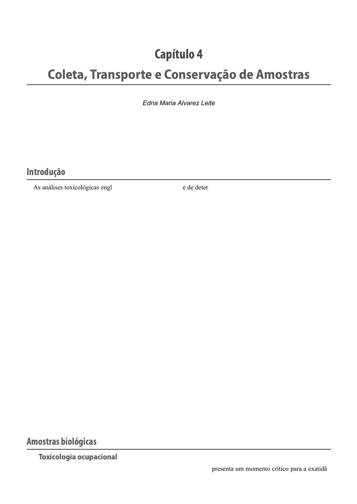 07/01/2019 Minha Biblioteca: Ciências Farmacêuticas - Toxicologia Analítica, 2ª edição https://integrada.minhabiblioteca.com.br/#/books/978-85-277-2860-7/cfi/6/34!/4@0:0.00 1/3 ■ Capítulo 4 Coleta, Transporte e Conservação de Amostras Edna Maria Alvarez Leite Introdução As análises toxicológicas englobam uma grande variedade de determinações envolvendo incontáveis xenobióticos e inúmeras amostras, biológicas ou não. Em geral, essas análises são realizadas em alíquotas de amostras coletadas; no entanto, em alguns casos (p. ex., em certas análises com finalidade forense), a amostra total obtida pode ser utilizada. Sabese que a concentração de um analito em uma amostra pode ser alterada durante a coleta, transporte e conservação (armazenamento) da mesma, caso essas etapas préanalíticas não sejam realizadas de maneira adequada. Condições como o anticoagulante usado em amostras de sangue, o material dos recipientes utilizados para coleta e armazenamento e o uso de conservantes ou de diluentes durante as etapas devem ser cuidadosamente selecionados de modo a não contribuir para a variabilidade analítica. É certo que uma amostragem, incluindo as etapas de coleta, transporte e armazenamento, quando adequadamente realizada, tem papel essencial para a confiabilidade do resultado analítico e contribui, de maneira efetiva, para que a incerteza associada à medida seja minimizada. Em outras palavras, a confiança em um resultado analítico final depende de uma correta e adequada amostragem; essa dependência se tornou maior à medida que o desempenho dos métodos foi aumentando, diminuindo a exigência de uso de grandes quantidades de amostra para uma análise.1–3 Embora existam alguns setores ou organismos nacionais e internacionais que padronizam e divulgam protocolos referentes às medidas apropriadas para se obterem, armazenarem e transportarem amostras analíticas, a experiência prática de cada analista é essencial, frente à grande variedade de analitos e tipos de amostras existentes. A coleta e o manuseio adequado das amostras, para cada análise ou para um grupo de análises, exigem, portanto, a presença e a coordenação de alguém experiente ou especialmente treinado para esse tipo de realização. A maior parte das análises toxicológicas tem sua amostragem realizada fora do laboratório de toxicologia. Assim, quando o responsável pela amostragem não apresentar as condições necessárias para essa atividade, o laboratório deverá fornecer assistência prática, no sentido de tornar essas condições préanalíticas as mais adequadas possíveis. No presente capítulo, serão apresentadas algumas medidas práticas que possibilitarão uma amostragem apropriada à realização de alguns tipos de análises toxicológicas. Serão enfocadas condições gerais para coleta, transporte e conservação de amostras biológicas (p. ex., urina, sangue, ar expirado, cabelo) utilizadas nas análises toxicológicas com finalidade forense, de diagnóstico de intoxicações alimentares e de avaliação da exposição ocupacional. Além disso, informações referentes à amostragem e ao manuseio de amostras de água serão apresentadas neste capítulo. Amostras biológicas Toxicologia ocupacional A amostragem biológica para fins de monitoramento ocupacional representa um momento crítico para a exatidão e a confiabilidade dos resultados analíticos. Sabese que algumas das maiores fontes de erro nas análises 07/01/2019 Minha Biblioteca: Ciências Farmacêuticas - Toxicologia Analítica, 2ª edição https://integrada.minhabiblioteca.com.br/#/books/978-85-277-2860-7/cfi/6/34!/4@0:0.00 2/3 toxicológicas ocupacionais decorrem de contaminações/decomposições das amostras coletadas e dos equívocos ocorridos na escolha da matriz a ser analisada, no horário da coleta, no transporte e na conservação das amostras. Para a realização de um monitoramento biológico de exposição ocupacional, além dos cuidados inerentes a todas as análises toxicológicas, é recomendado o estabelecimento de uma estratégia prévia de amostragem, com a determinação de quantos trabalhadores devem ser monitorados, levandose em consideração, basicamente, o tamanho do setor ocupacional, o tipo de exposição dos trabalhadores, os agentes presentes no meio e o biomarcador a ser analisado. Como medida de segurança para o laboratório e instrumento de auxílio na interpretação clínica dos resultados analíticos, recomendase também que, antes da etapa de amostragem, os trabalhadores selecionados preencham um protocolo toxicológico contendo seus históricos ocupacionais e algumas características e hábitos individuais (p. ex., dieta, tabagismo, consumo de bebidas alcoólicas e refrigerantes, uso de medicamentos, existência de alterações clínicas, entre outras). Além disso, nesse protocolo, devem constar dados referentes à coleta da amostra (data, horário, volume coletado etc.).4 Na maioria das vezes, as etapas préanalíticas para as análises toxicológicas ocupacionais são direcionadas em função das características físicoquímicas e cinéticas dos biomarcadores a serem analisados (tipo e quantidade de amostra, horário da coleta, utilização de conservantes e anticoagulantes). Existem, no entanto, medidas gerais que devem ser implantadas para a coleta, armazenamento e transporte das amostras biológicas ocupacionais, e serão mencionadas a seguir.1–6 Urina Amostras spot de urina, ou seja, aquelas coletadas em um dado período do dia (representam, em média, a urina excretada na bexiga nas 2 a 4 h anteriores) são as mais indicadas para a análise dos biomarcadores. Apenas em casos excepcionais, por exemplo, quando o resultado analítico é questionado ou o valor do indicador biológico encontrado está muito próximo (patamar superior ou inferior) do índice biológico máximo permitido (IBMP), pode ser empregado o exame de urina de 24 horas. Nesse caso é 