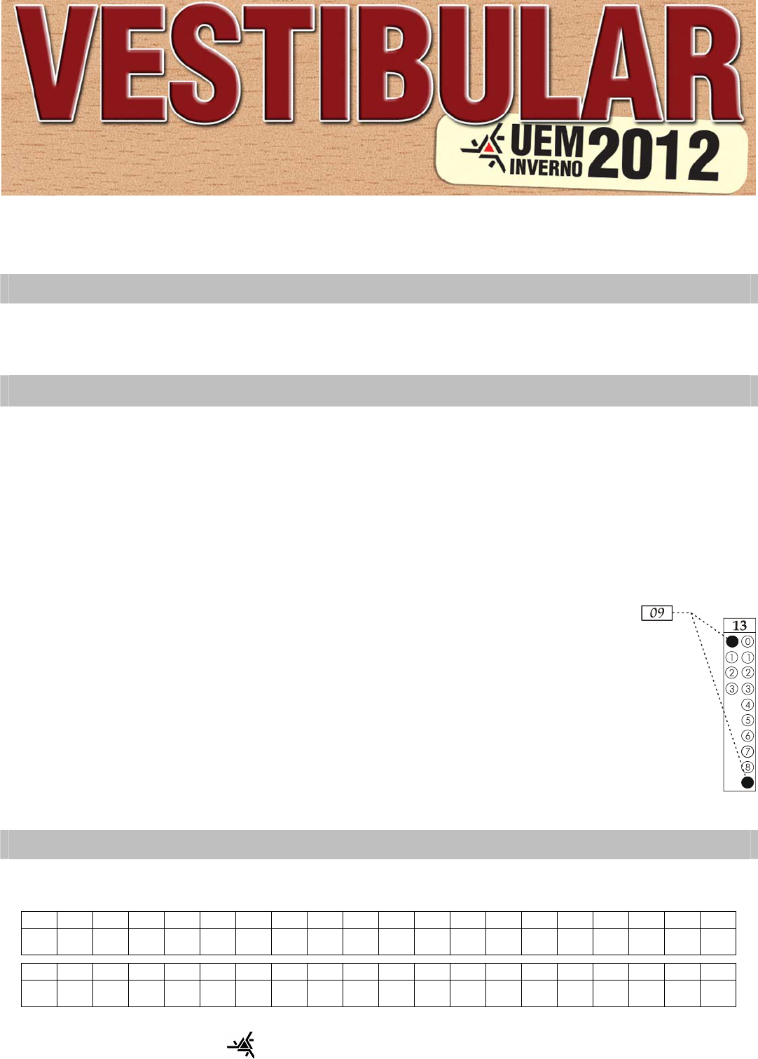 GABARITO 1 Prova 1 – Conhecimentos Gerais QQQUUUEEESSSTTTÕÕÕEEESSS OOOBBBJJJEEETTTIIIVVVAAASSS N.o DE ORDEM: N.o DE INSCRIÇÃO: NOME DO CANDIDATO: IIINNNSSSTTTRRRUUUÇÇÇÕÕÕEEESSS PPPAAARRRAAA AAA RRREEEAAALLLIIIZZZAAAÇÇÇÃÃÃOOO DDDAAA PPPRRROOOVVVAAA 1. Confira os campos N.o DE ORDEM, N.o DE INSCRIÇÃO e NOME, conforme o que consta na etiqueta fixada em sua carteira. 2. Confira se o número do gabarito deste caderno corresponde ao constante na etiqueta fixada em sua carteira. Se houver divergência, avise, imediatamente, o fiscal. 3. É proibido folhear o Caderno de Provas antes do sinal, às 9 horas. 4. Após o sinal, confira se este caderno contém 40 questões objetivas e/ou qualquer tipo de defeito. Qualquer problema, avise, imediatamente, o fiscal. 5. O tempo mínimo de permanência na sala é de 2 horas após o início da resolução da prova. 6. No tempo destinado a esta prova (4 horas), está incluído o de preenchimento da Folha de Respostas. 7. Transcreva as respostas deste caderno para a Folha de Respostas. A resposta será a soma dos números associados às alternativas corretas. Para cada questão, preencha sempre dois alvéolos: um na coluna das dezenas e um na coluna das unidades, conforme exemplo ao lado: questão 13, resposta 09 (soma das alternativas 01 e 08). 8. Ao término da prova, levante o braço e aguarde atendimento. Entregue ao fiscal este caderno, a Folha de Respostas e o Rascunho para Anotação das Respostas. 9. Se desejar, transcreva as respostas deste caderno no Rascunho para Anotação das Respostas constante abaixo e destaque-o, para retirá-lo amanhã, ao término da prova. Corte na linha pontilhada. ....................................................................................................................... RRRAAASSSCCCUUUNNNHHHOOO PPPAAARRRAAA AAANNNOOOTTTAAAÇÇÇÃÃÃOOO DDDAAASSS RRREEESSSPPPOOOSSSTTTAAASSS ––– PPPRRROOOVVVAAA 111 ––– IIINNNVVVEEERRRNNNOOO 222000111222 N.o DE ORDEM: NOME: 01 02 03 04 05 06 07 08 09 10 11 12 13 14 15 16 17 18 19 20 21 22 23 24 25 26 27 28 29 30 31 32 33 34 35 36 37 38 39 40 UEM – Comissão Central do Vestibular Unificado GABARITO 1 UEM/CVU – Vestibular de Inverno/2012 Prova 1 – Conhecimentos Gerais 2 Questão 01 Assinale o que for correto sobre os significados atribuídos aos conceitos de “cidadania” e de “cidadão”, em distintos momentos históricos. 01) Durante a Idade Média, o único trabalhador era o servo da gleba, que lutou para ter seus direitos políticos e sua cidadania reconhecidos pelos senhores feudais. 02) Em cidades-estado (pólis) da Grécia Antiga, como Atenas, os escravos e os estrangeiros não eram considerados cidadãos. 04) Em nossos dias, a cidadania está diretamente vinculada aos direitos humanos, que tiveram seu reconhecimento formal com a Declaração Universal dos Direitos Humanos, aprovada pela ONU. 08) No começo da Idade Moderna, havia uma separação entre o homem urbano e o homem rural; o termo “cidadão” se referia ao habitante da cidade e não diretamente às questões políticas. 16) A partir do final do século XVIII, com a Revolução Francesa e a Independência dos EUA, o conceito de cidadania ampliou-se e aprofundou-se, até alcançar todos os indivíduos das sociedades democráticas modernas. Questão 02 O filósofo inglês John Locke (1632-1704) construiu uma teoria político-social da propriedade que é, até hoje, uma das referências principais sobre o tema. Afirma ele: “A natureza fixou bem a medida da propriedade pela extensão do trabalho do homem e conveniências da vida. Nenhum trabalho do homem podia tudo dominar ou de tudo apropriar-se. [...] Assim o trabalho, no começo (das sociedades humanas), proporcionou o direito à propriedade sempre que qualquer pessoa achou conveniente empregá-lo sobre o que era comum.” (LOCKE, J. Segundo tratado sobre o governo civil. São Paulo: Abril Cultural, 1983, p. 48; 45; 52) Em consonância com essa concepção de propriedade do filósofo, é correto afirmar que 01) o direito à propriedade é, prioritariamente, fruto do trabalho. 02) o direito à propriedade é fundado naquele que primeiro se apossou do bem (terra, animais etc). 04) o fato de os recursos naturais serem comuns a todos os homens gera um impedimento à propriedade individual. 08) o trabalho individualiza o que era propriedade comum, pois agrega algo particular ao bem. 16) o trabalho antecede a propriedade do bem e não o contrário. Questão 03 No início da Modernidade, a explicação científica deixa de ser um saber contemplativo da natureza e passa a ser incisiva e disposta a penetrar no coração da realidade, dando origem a um saber ativo, instrumental e regrado pela técnica. Sobre o método científico experimental, assinale o que for correto: 01) Com a dissecação dos cadáveres, Andreas Vesálio, no século XVI, revogou a medicina de Galeno, autoridade científica aceita desde o século II, que utilizava, para os estudos do corpo humano, a analogia com outros animais. 02) A ciência antiga é contraposta, na Modernidade, a inventos e descobertas ocorridas em função dos comerciantes (segmento da burguesia), que valorizavam o trabalho e a intervenção na natureza, em oposição ao ócio contemplativo da aristocracia clássica. 04) Por ter se utilizado da luneta para a observação dos astros, do plano inclinado, para o estudo dos corpos em movimento, Galileu Galilei (séculos XVI e XVII) é considerado um dos inauguradores do método científico experimental. 08) A origem do método científico experimental reflete a passagem da “civilização terrestre” para a “civilização marítima”. Essa passagem também é visível nas artes, representadas, por exemplo, pela obra de Dante Alighieri (séculos XIII e XIV), que destaca o movimento Terra-Céu, e pela épica de Luís de Camões (século XVI), que destaca o movimento Terra-Mar. 16) Durante o período de transição para as novas técnic