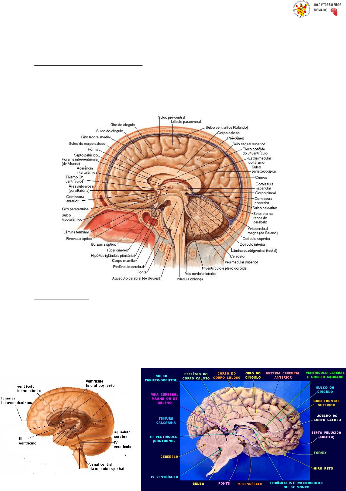 DIENCÉFALO – AULA XVII ▪ INTRODUÇÃO E LOCALIZAÇÃO O diencéfalo forma, juntamente com o telencéfalo, o cérebro. Está coberto quase completamente pelos hemisférios do telencéfalo, localizando-se em posição mediana e, portanto, sendo apenas visualizado na face inferior do cérebro. O diencéfalo é ímpar, compreendendo as seguintes partes: o tálamo, o hipotálamo, epitálamo e subtálamo. ▪ III VENTRÍCULO É uma cavidade ímpar e mediana localizada no diencéfalo, que se comunica com o IV ventrículo pelo aqueduto cerebral, e com os ventrículos laterais através dos forames interventriculares. Em secção sagital mediana, as paredes laterais do III ventrículo são amplamente expostas, sendo possível verificar uma depressão que se estende do aqueduto cerebral até o forame interventricular, chamado de sulco hipotalâmico. As porções da parede situadas acima desse sulco pertencem ao tálamo, e as situadas abaixo, ao hipotálamo. O assoalho do III ventrículo é formado, de anterior para posterior, pelo quiasma óptico, infundíbulo, túber cinéreo e corpos mamilares. Essas estruturas pertencem ao hipotálamo. A parede posterior é formada pelo epitálamo, que se localiza acima do sulco hipotalâmico. Saindo de cada lado do epitálamo e percorrendo a parte mais alta das paredes laterais do ventrículo, há um feixe de fibras nervosas chamadas de estrias medulares do tálamo, onde se insere a tela corióide, que forma o teto do III ventrículo. As estrias medulares, por sua vez, constituem a parede lateral do III ventrículo. A parede anterior do III ventrículo é formada pela lâmina terminal, que é uma estrutura do telencéfalo. ▪ TÁLAMO Os tálamos são duas massas volumosas de substância cinzenta que apresenta forma ovoide e localiza-se um de cada lado na porção laterodorsal do diencéfalo. Os tálamos são unidos por uma trave de substância cinzenta, a aderência intertalâmica. A extremidade anterior do tálamo apresenta uma eminência chamada de tubérculo anterior do tálamo, que participa na delimitação do forame interventricular. A extremidade posterior é maior que a anterior, apresentando uma eminência chamada de pulvinar, que se projeta sobre os corpos geniculados lateral e medial. Como já descrito nas aulas anteriores, o corpo geniculado medial está relacionado à via auditiva, enquanto o lateral está relacionado à via óptica. A parte lateral da face superior do tálamo faz parte do assoalho do ventrículo lateral, enquanto a face medial do tálamo forma a maior parte da parede lateral do III ventrículo. A face lateral do tálamo é separada do telencéfalo pela cápsula interna, que é um feixe compacto de fibras que liga o córtex cerebral a centros nervosos subcorticais. O tálamo apresenta diversos núcleos com diferentes funções: anterior (controle emocional), posterior (visão, audição), lateral (sensibilidade tátil, térmica, dolorosa, planejamento motor, gustação), medial (recebem fibras da formação reticular, ativação do córtex, sono e vigília), e mediano (está na aderência intertalâmica, homeostase de vísceras). Dentre as funções do tálamo, cabe destacar a sensibilidade, a motricidade, o comportamento emocional, a ativação do córtex e a memória. A lesão do tálamo, portanto, é muito grave, por ser uma pequena estrutura que agrega extensa quantidade de funcionalidades essenciais ao organismo. ▪ HIPOTÁLAMO O hipotálamo é uma área pequena do diencéfalo, situada abaixo do tálamo, com importantes funções, relacionadas principalmente com o controle da atividade visceral. O hipotálamo é formado por estruturas que formam o assoalho do III ventrículo: Os corpos mamilares, que são duas eminências arredondadas de substância cinzenta localizadas na parte anterior da fossa interpeduncular; o túber cinéreo, uma área ligeiramente cinzenta, mediana, situada atrás do quiasma óptico e na frente dos corpos mamilares, sendo aonde a hipófise se prende através do infundíbulo; o quiasma óptico, que localiza-se na parte anterior do assoalho do III ventrículo e recebe as fibras dos nervos ópticos; e o infundíbulo, que é uma formação nervosa em forma de funil que se continua inferiormente com o processo infundibular da hipófise e superiormente forma a eminência mediana do túber cinéreo. O hipotálamo desempenha diversas funções, regulando o sistema nervoso autônomo e as glândulas endócrinas, além de ser o principal responsável pela homeostase. Além disso, realiza: regulação da temperatura corporal, regulação do comportamento funcional, regulação do equilíbrio hidrossalino e da pressão arterial, regulação do sono e vigília, regulação da ingestão de alimentos, integração do comportamento sexual, regulação do sistema endócrino, geração e regulação do ritmo circadiano. ▪ EPITÁLAMO O epitálamo limita posteriormente o III ventrículo acima do sulco hipotalâmico. O elemento mais evidente do epitálamo é a glândula pineal, uma glândula ímpar e mediana que se localiza sobre o teto mesencefálico. A base do corpo pineal prende-se anteriormente a dois feixes transversais de fibras que cruzam o plano mediano, a comissura posterior e a comissura das habênulas. A comissura posterior situa-se no ponto em que o aqueduto cerebral se liga ao III ventrículo, sendo considerado o limite entre o diencéfalo e o mesencéfalo. Já a comissura das habênulas interpõe-se entre duas pequenas eminências triangulares, o trígono das habênulas, situados entre o corpo pineal e o tálamo. A comissura das habênulas se continua anteriormente, de cada lado, com as estrias medulares do tálamo; é na comissura das habênulas, também, que se insere a tela corióide posteriormente, fechando o teto do IV ventrículo. O trígono das habênulas contém o núcleo das habênulas, estando relacionado ao sistema límbico, regulando o comportamento emocional. A glândula pineal secreta mel