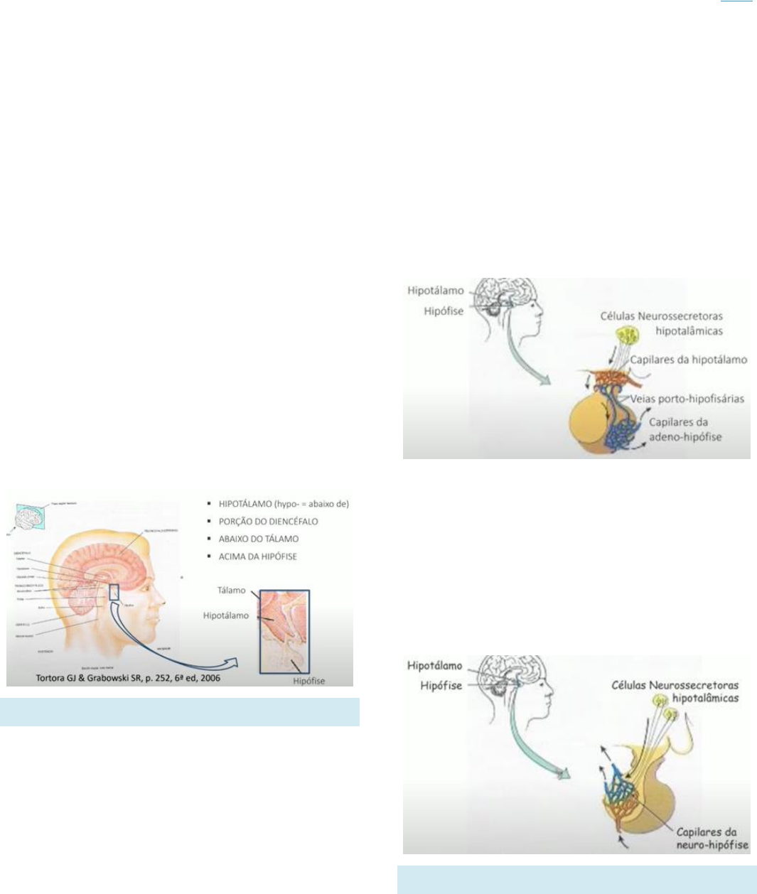 Lara Fernandes – Enf. UFRJ – Fisiologia Biosau III INTRODUÇÃO • O prolongamento ventral do hipotálamo em formato de funil terminava em uma massa granular – a hipófise, envolvida por um rico aporte sanguíneo. • A hipófise apresenta dois lobos: anterior (adeno- hipófise) e posterior (neuro-hipófise). • A hipófise está ligada ao hipotálamo através de uma estrutura em forma de haste, denominada de infundíbulo. • O hipotálamo encontra-se localizado na porção do diencéfalo, abaixo do tálamo e acima da hipófise. FUNÇÕES DO HIPOTÁLAMO • Controle da emoção e do comportamento: o hipotálamo regula os sentimentos de raiva, agressividade, dor e prazer, além de padrões de comportamento relacionados a atividade sexual. • Modula a fome e saciedade: libera neurotransmissores norexígenos e anorexígenos (NPY, AgRP e POMC). • Regula a temperatura corporal: estimula processos de vasoconstricção e contração muscular. • Estabelece o ritmo circadiano: gera padrões de sono e vigília. • Controla a hipófise: libera hormônios liberadores ou inibidores • Células neurossecretoras hipotalâmicas são capazes de sintetizar hormônios que são transportados pelas veias porto-hipofisárias, regulando então a síntese e a liberação de outros hormônios produzidos pela adeno-hipófise. • Células neurossecretoras hipotalâmicas também são capazes de sintetizar e secretar outros hormônios como: ocitocina e ADH. Esses hormônios são produzidos no hipotálamo e secretados diretamente na neuro-hipófise através dos axônios que se estendem de um local ao outro. Posteriormente, são liberados na corrente sanguínea. SISTEMA HIPOTÁLAMO-HIPOFISÁRIO • O hipotálamo e a hipófise estão conectados anatomicamente pelo infundíbulo e funcionalmente por neurônios provenientes de distintos núcleos hipotalâmicos. • Os neurônios parvo-celulares (2,3 e 4) se dirigem a rede de capilares pertencentes ao sistema pota- hipotálamo-hipofisário. Fisiologia endócrina Lara Fernandes – Enf. UFRJ – Fisiologia Biosau III • Os neurônios magno-celulares se dirigem diretamente a neuro-hipófise. • Os hormônios neuro-hipofisários ficam armazenados em vesículas de secreção até serem liberados na corrente sanguínea. • Exemplos de hormônios hipotalâmicos: TRH, e h0rmonio liberador de gonadotrofina. • Exemplos de hormônios adeno-hipofisários: TSH, LH e FSH. • Exemplos de hormônios neuro-hipofisários: ocitocina e ADH. HORMÔNIOS DO HIPOTÁLAMO QUE INFLUENCIAM A ADENO-HIPÓFISE HORMÔNIO LIBERADOR DE TIREOTROFINA (TRH) • É sintetizado a partir do pré-pró-TRH (242 AA). • Foi isolado por Schally (1968), a partir de estudos em hipotálamos suínos. • É produzido no hipotálamo. • Estimula o TSH e Prl produzidos na adeno- hipófise. HORMÔNIO LIBERADOR DE CORTICOTROFINAS (CRH) • É um peptídeo formado por 41 AA. • Isolado a partir do hipotálamo de ovinos (Dhariwal APS et al, 1966) • Produzido no hipotálamo. • Estimula a produção de ACTH na adeno-hipófise. HORMÔNIO LIBERADOR DE GONADOTROFINA (GNRH) • Decapeptídeo. • Foi isolado a partir do hipotálamo se suínos. • É produzido no hipotálamo. • Aumenta a produção de LH e FSH na adeno- hipófise. • O eixo hipotálamo-hipófize-gonadal é ativado na puberdade. HORMÔNIO LIBERADOR DO HORMÔNIO DE CRESCIMENTO (GHRH) • O GHRH é sintetizado a partir do pré-pró-GHRH. • Existem três isoformas de GHRH: 37, 40 e 44 AA, e todos possuem a mesma atividade biológica liberadora de GH. • É produzido no hipotálamo. • Estimula a produção do hormônio GH na adeno- hipófise. HORMÔNIO INIBIDOR DA LIBERAÇÃO DO HORMÔNIO DE CRESCIMENTO (GHRIH) • É capaz de inibir a liberação de GH, também do TSH. • Produzido no hipotálamo. • É chamado de somastostatina (SS). • Isoforma s-14: predominante no cérebro. • Isoforma s-28: predominante no TGI – Trato gastro-intestinal. Lara Fernandes – Enf. UFRJ – Fisiologia Biosau III HORMÔNIOS DA ADENO-HIPÓFISE TSH • Liberado pela adeno-hipofise. • É capaz de se ligar a receptores específicos presentes na glândula tireoide, estimulando a produção de hormônios tireoidianos. ACTH • Hormônio adeno-hipofisário. • Possui a capacidade de se ligar a receptores específicos presentes no córtex da adrenal e estimulando a produção de hormônios adrenais. FSH E LH • São hormônios adeno-hipofisários. • Tem a capacidade de se ligar aos testículos e aos ovários estimulando respectivamente a produção de testosterona e estrógenos. PROLACTINA • Hormônio adeno-hipofisário. • Se liga aos seus receptores específicos presentes nas mamas. • Estimula a produção de leite. GH • Hormônio adeno-hipofisário. • Tem a capacidade de se ligar ao fígado e estimular a produção de IGFs (fatores de crescimento semelhantes a insulina). Esses fatores de crescimento atuam nos ossos, músculos esqueléticos, órgãos e no tecido adiposo branco. • Estimula o crescimento linear, o aumento de massa magra e a lipólise. HORMÔNIOS DA NEURO-HIPÓFISE OCITOCINA • Composto por 9 AA. • É produzido pelo hipotálamo e secretado pela neuro-hipófise. • Produzida especificamente no núcleo supraóptico e núcleo paraventricular do hipotálamo. • Atua através da interação com receptores específicos: OXTR-1 e 2, presentes nas membranas plasmáticas das células alvo. FUNÇÕES DA OCITOCINA • Parturição: provoca a contração da musculatura lisa uterina. Tais contrações são intensificadas próximas ao parto. • Lactação: promove a ejeção do leite materno. • Reprodução: 1. Auxilia a “sucção” do sêmen pelo aparelho reprodutor feminino ao estimular as contrações miometriais. 2. Leva a formação de pares e estimula o desejo sexual. • Conhecida como o hormônio do amor (amor EROS) conhecido como o amor sexual. • Participa no desenvolvimento de outros tipos de amor: materno, p
