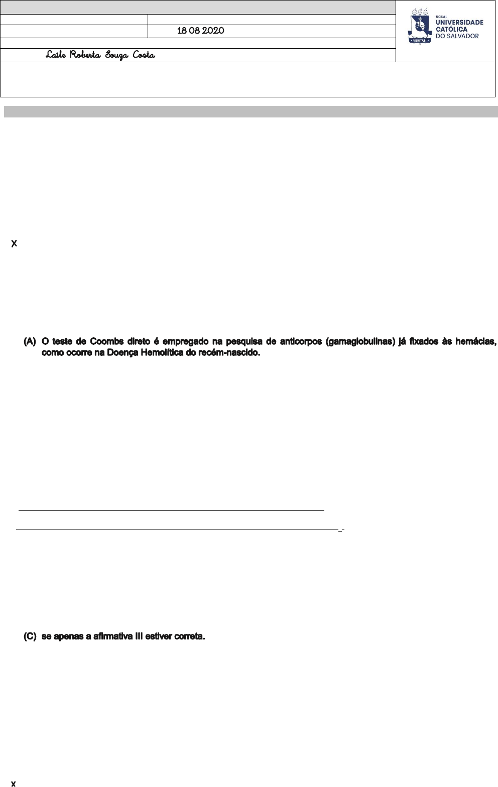 UNIVERSIDADE CATÓLICA DO SALVADOR Curso: Biomedicina Turno: Matutino Disciplina: Banco de sangue Data: / / Professor: Sânzio Santana Discente: Instruções: A atividade deve ser realizada individualmente O prazo máximo de entrega é 24/08/2020 (Anexar no Google Classroom) A atividade possui valor de 0,5 ponto ATIVIDADE 1 (0,5 ponto) – Questões aplicadas QUESTÃO 1 (2010/CESPE/INCA/Técnico 1 – Hematologia e Hemoterapia) Antígenos são moléculas que podem ser reconhecidas pelo organismo como não próprias e gerar o aparecimento de anticorpos, sendo qualquer substância que pode se ligar especificamente a anticorpos ou a um receptor de linfócito T. Substâncias que compõem as membranas das células ou fragmentos celulares do sangue (eritrócitos e plaquetas), como proteínas, carboidratos e lipídios são considerados antígenos. Com relação a imunologia e genética, julgue o próximo item. Aloanticorpos são produzidos contra antígenos reconhecidos como não próprios ao indivíduo, mas provenientes de indivíduos da mesma espécie. ( ) CERTO ( ) ERRADO QUESTÃO 2 (2017/MS CONCURSOS/Técnico de Laboratório) Em relação ao teste de Coombs, assinale a alternativa correta. (B) O teste de Coombs direto é utilizado na pesquisa de anticorpos bloqueadores (incompletos), os quais se fixam às hemácias “in vitro” mas não as aglutinam. (C) O teste de Coombs indireto é empregado na pesquisa de anticorpos (gamaglobulinas) já fixados às hemácias, como ocorre na Doença Hemolítica do recém-nascido. (D) Apesar do teste de Coombs ser dividido em direto e indireto, somente o direto tem importância clínica. QUESTÃO 3 (2014/FGV/SUSAM/Biólogo) A respeito dos antígenos e anticorpos, analise as afirmativas a seguir. I. A resposta imune primária é mediada por células dendríticas imaturas. II. As imunoglobulinas presentes na resposta imune primária são do tipo IgG3. III. A diminuição do potencial zeta das hemácias após uma reação de um anticorpo contra um antígeno eritrocitário facilita a aglutinação das hemácias. Assinale: (A) se apenas a afirmativa I estiver correta. (B) se apenas a afirmativa II estiver correta. (D) se apenas as afirmativas I e II estiverem corretas. (E) se todas as afirmativas estiverem corretas. QUESTÃO 4 (2012/UFPB/Médico – Hematologia) Em relação aos grupos sanguíneos, julgue as assertivas abaixo: Os anticorpos naturais são mais reativos a temperaturas inferiores a 37°C, sendo, portanto, designados como anticorpos frios; já os anticorpos imunes têm melhor reatividade a 37°C, sendo ditos anticorpos quentes. ( ) CERTO. ( ) ERRADO. QUESTÃO 5 (2010/CESPE/INCA/Tecnologista Junior – Área Biologia – Especialidade: hemoterapia) As hemolisinas anti-A e anti-B são anticorpos da classe G (IgG) e M (IgM), sendo as imunoglobulinas da classe G ativas a 37 ºC, e as da classe M, a 4 ºC ou temperatura ambiente. ( ) CERTO. ( ) ERRADO. QUESTÃO 6 (2012/UFPB/UFPB/Médico - Clínica Médica) Nas anemias hemolíticas autoimunes, ocorre uma destruição acelerada das hemácias decorrente de fixação de imunoglobulinas ou complemento na superfície das mesmas. Sobre essas patologias, julgue as assertivas abaixo: A anemia hemolítica autoimune causada por anticorpos a quente é causada por auto-anticorpos eritrocitários da classe IgG, sendo na maioria dos casos de natureza policlonal. ( ) CERTO. ( ) ERRADO. QUESTÃO 7 (2014/UFMT/UFPB/Técnico de Laboratório – Análises Clínicas) O teste do VDRL é um método de triagem para detecção de reaginas da sífilis in vitro. Além do teste sem diluição, é recomendado um teste com uma diluição de 1:8 com NaCl 0,85% com a finalidade de (B) confirmar baixa concentração de anticorpos na amostra. (C) confirmar a presença de antígeno treponêmico na amostra. (D) substituir provas como FTA-ABS. QUESTÃO 8 (2010/UFRN/Médico – Hematologia e Hemoterapia – Análises Clínicas) Na Pesquisa de Anticorpos Irregulares (PAI) a adição de albumina na reação, tem por finalidade: (A) Diminuir o potencial Zeta por diminuição das cargas elétricas do meio. (B) Aumentar a constante dielétrica do meio por diminuição das cargas elétricas. (C) Aumentar a força iônica do meio por aumento das cargas elétricas do meio. (D) . QUESTÃO 9 (2011/CEPERJ/BIÓLOGO/FARMACÊUTICO/BIOMÉDICO - HEMOTERAPIA/IMUNO – HEMATOLOGIA) Dentre as enzimas proteolíticas utilizadas em provas imuno-hematológicas, não se inclui: (A) tripsina. (B) bromelina. (C) papaína.