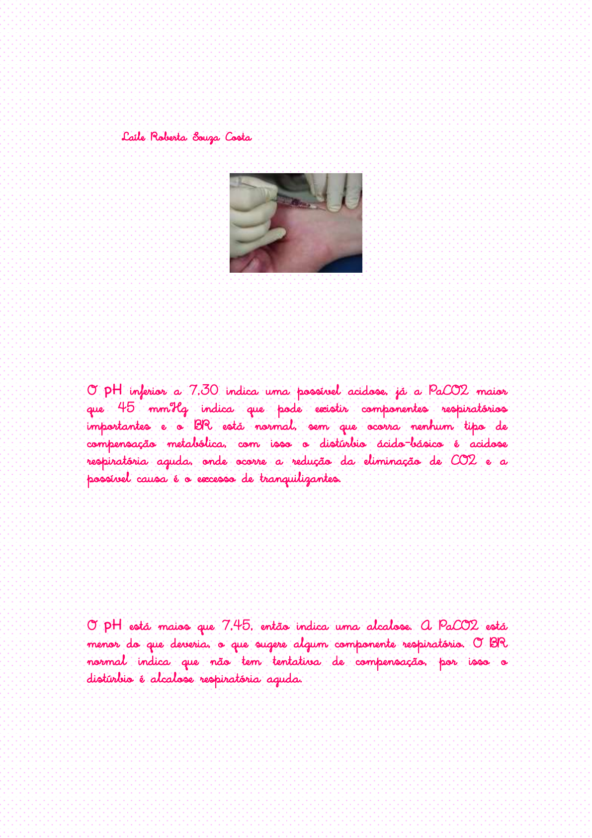 UNIVERSIDADE CATÓLICA DO SALVADOR DISCIPLINA: BIOQUÍMICA CLÍNICA ATIVIDADE AVALIATIVA NOME: CASO 1 Paciente de 30 anos chega ao Setor de Emergência em estado de coma, apenas respondendo aos estímulos dolorosos. Sua respiração é superficial e com frequência normal. Familiares encontraram próximo a ela diversas caixas de tranquilizantes vazias. Gasometria arterial: pH= 7,20; PaCO2= 80mmHg; BR= 23 mM/L; BE= -1,2. a) Qual(is) o(s) distúrbio(s) acidobásico(s) apresentado(s)? CASO 2. Após 24 horas de tratamento no CTI, a paciente do caso 1 ainda se encontra torporosa e submetida à ventilação artificial. Gasometria arterial: pH= 7,52; PaCO2= 26 mmHg; BR= 25,6 mM/L; BE= +1,2. a) Qual (is) o(s) distúrbio(s) acidobásico(s) apresentado(s)? CASO 3. Paciente de 50 anos chega ao Setor de Emergência torporoso, desidratado, com respiração profunda, pausa inspiratória e aumento da frequência respiratória. Ao exame clínico nota-se hálito cetônico. Gasometria arterial: pH= 7,10; PaCO2= 20 mmHg; BR= 5 mM/L; BE= -18. a) Qual(is) o(s) distúrbio(s) acidobásico(s) apresentado(s)? CASO 4. Paciente jovem chega ao Centro Cirúrgico com história de traumatismo abdominal há duas horas. No local do acidente foi encontrado lúcido, hipocorado e com sinais de choque hipovolêmico. Foi reposto rapidamente com solução fisiológica, albumina humana e bicarbonato de sódio. Chegou à Emergência estável e equilibrado, o que permitiu avaliação adequada e pronta indicação cirúrgica. Gasometria arterial: pH= 7,55; PaCO2= 35 mmHg; BR= 32 mM/L; BE= +5,8. a) Qual(is) o(s) distúrbio(s) acidobásico(s) apresentado(s)? CASO 5. Paciente de 70 anos em pós-operatório de cirurgia abdominal queixa-se de câimbras e prostração. Ao exame clínico minucioso observam-se abalos musculares e drenagem elevada pela sonda nasogástrica (2.000mL/24 h). Gasometria arterial: pH= 7,62; PaCO2= 40 mmHg; BR= 36 mM/L; BE= +8,0. A. Qual(is) o(s) distúrbio(s) acidobásico(s) apresentado(s)? CASO 6. Criança de 7 anos chega ao hospital com história de redução do volume urinário e edema de membros inferiores. Há história prévia de vários episódios de amigdalite. Gasometria arterial: pH= 7,30; PaCO2= 28 mmHg; BR= 18 mM/L; BE= -6,5. A. Qual(is) o(s) distúrbio(s) acidobásico(s) apresentado(s)? CASO 7 Dada a gasometria arterial, qual (is) o(s) distúrbio(s) ácido básico (s) apresentado(s): pH = 7,30 PaCO² = 50 HCO³ = 19 BE = -3, 5 A. Qual(is) o(s) distúrbio(s) acidobásico(s) apresentado(s)? CASO 8 Considere a seguinte questão: “homem de 25 anos admitido em hospital público com história de lesão por arma branca no tórax, submetido a toracotomia à D, com colocação de dreno torácico em selo d´água HTD decorrente de hemopneumotórax traumático. permaneceu em suporte ventilatório por quatro dias. Após extubação, observou-se respiração superficial e bradipnéia. A gasometria arterial revelou PH = 7,20, PCO² = 60 mmHg, HCO³ = 28 mEq/l”. Com base nos dados expostos, podemos considerar que o paciente se encontra em: A. Qual(is) o(s) distúrbio(s) acidobásico(s) apresentado(s)? CASO 9 Observe a gasometria arterial a seguir: PH: 7.52 PaCO²: 22 HCO³: 24 BE: + 2 A. Qual(is) o(s) distúrbio(s) acidobásico(s) apresentado(s)? CASO 10 Um paciente com insuficiência respiratória, devido à pneumonia alveolar, necessitou de ventilação mecânica invasiva, apresentando a seguinte gasometria: PH: 7.23 PaCO²: 66 HCO³: 14 BE: - 9 A. Qual(is) o(s) distúrbio(s) acidobásico(s) apresentado(s)?