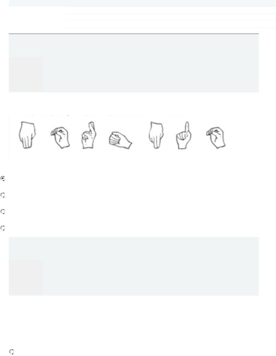 Iniciado em segunda, 30 Nov 2020, 20:44 Estado Finalizada Concluída em segunda, 30 Nov 2020, 20:50 Tempo empregado 6 minutos 21 segundos Avaliar 9,00 de um máximo de 10,00(90%) Parte superior do formulário Questão 1 Completo Atingiu 1,00 de 1,00 Marcar questão Texto da questão Passe para o português a palavra que está em alfabeto manual. Escolha uma opção: a. Morango b. Notório c. Mórbido d. Memória Questão 2 Completo Atingiu 1,00 de 1,00 Marcar questão Texto da questão A língua de sinais é baseada nas experiências visuais das comunidades surdas, enquanto a língua portuguesa constitui-se baseada nas falas. Escolha uma opção: Verdadeiro Falso Questão 3 Completo Atingiu 1,00 de 1,00 Marcar questão Texto da questão Faça a associação do Português com Libras: Questão 4 Completo Atingiu 1,00 de 1,00 Marcar questão Texto da questão Coisas que são ditas na língua de sinais não são ditas usando um tipo diferente de construção gramatical na língua portuguesa. Assim, há vezes em que uma grande frase é necessária para traduzir uma pequena em outra língua. Escolha uma opção: Verdadeiro Falso Questão 5 Completo Atingiu 0,00 de 1,00 Marcar questão Texto da questão Existem tipos e modos diferentes de interpretação. Entre estes estão a interpretação consecutiva e a interpretação simultânea. Sobre a interpretação simultânea, assinale a alternativa correta. Escolha uma opção: a. A interpretação simultânea é típica entre línguas orais. Nas línguas de sinais tal tipo de interpretação não acontece. b. Não ocorre, de fato, simultaneamente à fala original, pois o intérprete tem necessidade de um espaço de tempo para processar a informação recebida e reorganizar sua forma de expressão. c. A expressão “interpretação simultânea” poderá ser entendida literalmente desde que o intérprete esteja isolado em cabine para que possa realizá-la sem outras interferências. d. Ocorre, de fato, simultaneamente à fala original, pois o intérprete tem a capacidade de processar a informação recebida e reorganizar sua forma de expressão ao mesmo tempo. Questão 6 Completo Atingiu 1,00 de 1,00 Marcar questão Texto da questão A língua de sinais e a língua portuguesa são de modalidades diferentes; enquanto a primeira é visual-gestual, a segunda é oral-auditiva. O que é denominado de palavras nas orais-auditivas é denominado linguagem visual nas visuais-gestuais. Escolha uma opção: Verdadeiro Falso Questão 7 Completo Atingiu 1,00 de 1,00 Marcar questão Texto da questão Passe para o português a palavra que está em alfabeto manual. Escolha uma opção: a. Bombas b. Tomate c. Brasil d. Tâmara Questão 8 Completo Atingiu 1,00 de 1,00 Marcar questão Texto da questão A língua de sinais apresenta uma sintaxe espacial, incluindo os chamados classificadores; a língua portuguesa usa uma sintaxe linear utilizando a descrição para captar o uso de classificadores. Escolha uma opção: Verdadeiro Falso Questão 9 Completo Atingiu 1,00 de 1,00 Marcar questão Texto da questão O que é Linguagem? Escolha uma opção: a. Ação de transmitir uma mensagem e, eventualmente, receber outra mensagem como resposta. b. É a utilização de meios e recursos variados, dentre eles as línguas e outras formas de expressão, que viabilizam a comunicação entre os indivíduos. c. É como a escrita à mão de uma pessoa, ou seja, a execução do sinal é como uma caligrafia que sofre algumas variações de pessoa para pessoa. d. É um sistema convencional, composto por um conjunto de signos (códigos com significantes e significados) e uma gramática própria. Questão 10 Completo Atingiu 1,00 de 1,00 Marcar questão Texto da questão O que Significa Libras? Escolha uma opção: a. É a sigla de Língua Brasileira de Sinais, um conjunto de formas gestuais utilizada por deficientes auditivos para a comunicação apenas entre os surdos. b. É a sigla de Língua Universal de Sinais, um conjunto de formas gestuais utilizada por deficientes auditivos para a comunicação entre os surdos. c. É a sigla da Língua de Sinais utilizada no Brasil e no mundo inteiro. d. É a sigla de Língua Brasileira de Sinais, um conjunto de formas gestuais utilizada por deficientes auditivos para a comunicação entre eles e outras pessoas, sejam elas surdas ou ouvintes. Parte inferior do formulário