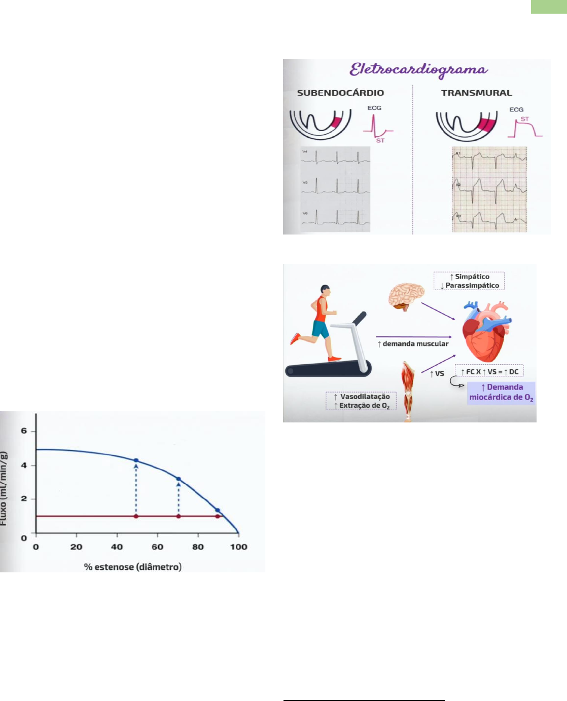 DINAH LUZ 1 TESTE ERGOMÉTRICO História Willem einthovem – criou o ECG Escada de máster – a resposta cardíaca ao esforço Protocolo bruce INTRODUÇÃO O Teste Ergométrico (TE) é um procedimento no qual o indivíduo é submetido a um esforço físico programado e individualizado, com a finalidade de se avaliar as respostas clínica, hemodinâmica, autonômica, eletrocardiográfica, metabólica e eventualmente ventilatória ao exercício. Essa avaliação possibilita: detectar isquemia miocárdica, reconhecer arritmias cardíacas e distúrbios hemodinâmicos induzidos pelo esforço, avaliar a capacidade funcional e a condição aeróbica; diagnosticar e estabelecer o prognóstico de determinadas doenças cardiovasculares; prescrever exercício; avaliar objetivamente os resultados de intervenções terapêuticas; demonstrar ao paciente e aos seus familiares as suas reais condições físicas e fornecer dados para perícia médica. FISIOLOGIA DO FLUXO CORONARIANO A linha vermelha é a basal da coronariana A azul é vasodilação A diferencia entre o basal é a vasodilatação máxima é chamado de reserva de fluxo coronariano Como funcional o fluxo? EPICÁRDIO ENDOCÁRDIO Quando o ocorrem uma obstrução o fluxo diminui por tanto quem vai sofre, mas é quem está no final o endocárdio. No entanto quando ocorre uma isquemia o sentido vai do endocárdio epicárdio O início é sub endocárdica é evoluir para transmural Padrões do eletrocardiograma O esforço físico o que vai a acontecer? INDICAÇÕES Investigação e prognóstico da DAC Avaliação de arritmias Avaliação da capacidade funcional Avaliação da pressão arterial Avaliação do marca-passo CONTRAINDICAÇÕES Síndrome coronariana aguda Arritmias graves Estenose aórtica grave Cardiomiopatia hipertrófica obstrutiva Miocardite aguda Incapacidade de exercício PAS>200 e/ou PAD>110mmHg Especificas Na avalição de DAC (isquemia) Eletrocardiograma não interpretável 1- BRE – QRS Largo negativo em V1 positivo em V6 tipo um orelhar de coelho 2- Pré-excitação – onda delta 3- Marca-passo -pq o QRS vai este largo PROTOCOLOS DINAH LUZ 2 Cicloergômetro Limitações ortopédicas e neurológicas Esteira rolante Aumento VO2 max Aumento FC max RAMPA Aumenta a velocidade (intensidade) de forma linear de acordo com o tempo- mais utilizado para avaliar capacidade funcional ESCALONADOS Aumento em escalar – mais utilizado para avaliar doença coronária Bruce Ellestad Resposta eletrocardiográfica Realizado com eletrodos Maison-likar CM5- e colocada no manúbrio esternal para avaliara isquemia Padrões de desvio do ST Sem infra-NORMAL y 80ms ( 2 quadradinhos) do ponto J está na linha da base ascendente rápido- NORMAL <1 mm (0.1mV) de infra antes do ponto Y Ascendente lento- DUVIDOSO >= 1mm do ponto Y Horizontal- positivo p/ isquemia Descendente- positivo p/ isquemia Supra -positivo p/ isquemia E avaliado no ponto J Resposta hemodinâmica PA Normal PAS>= 30mmHg PAD<= 10mmHg Hiper-reatividade- HAS? PA>= 180/90 mmHg No 2° estágio Déficit inotrópico PAS<= 30 mmHg Diminuir PAS>15 mmHg FREQUÊNCIA CARDÍACA FC MÁX 220-idade FC submáxima 0,85xFC máxima INCOMPETÊNCIA CRONATRÓPI7CA Queda da FC FC<FC máxima- 30 Índice cronotrópico (IC) < 0,8 IC= FC pico- FC basal/ FCmáx-FC basal CAPACIDADE FUNCIONAL Protocolo bruce Estágio 1 2 3 4 5 6 7 METs 4 7 10 13 16 19 22 DINAH LUZ 3 Escore de duke Avaliação prognóstica ED= tempo de exercício – (5x desnível ST)- (4x índice de angina) Sem angina =0 Angina presente=1 Angina limitante=2 Protocolo de Naughton - O protocolo de Naughton é frequentemente usado nos testes de esforço pós-IM para classificar os pacientes em categorias de alto e baixo risco e determinar estratégias ideais de tratamento . Este protocolo também é usado para testes funcionais de exercício com técnicas de análise de gases para medir a captação de oxigênio e o VO 2 máx.