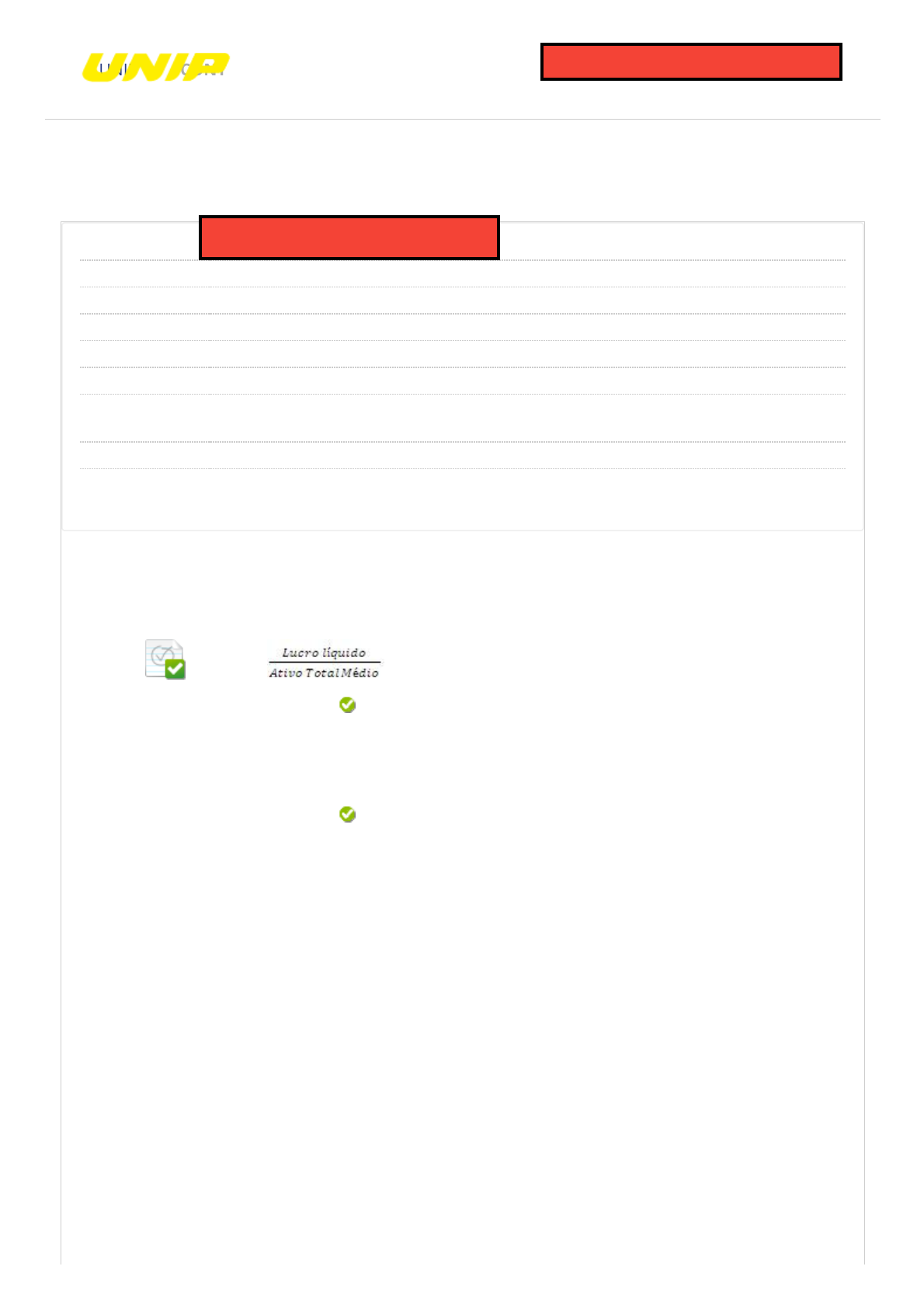 27/03/2020 Revisar envio do teste: QUESTIONÁRIO UNIDADE IV – 424S_... https://ava.ead.unip.br/webapps/assessment/review/review.jsp?attempt_id=_32290699_1&course_id=_77907_1&content_id=_1071478_1&return… 1/6 Revisar envio do teste: QUESTIONÁRIO UNIDADE IV Análise das Demonstraçoes Financeiras 424S_45820_20201 CONTEÚDO Usuário NATHALYA SODRE MUNIZ DA SILVA Curso Análise das Demonstraçoes Financeiras Teste QUESTIONÁRIO UNIDADE IV Iniciado 26/03/20 02:00 Enviado 27/03/20 15:33 Status Completada Resultado da tentativa 2,25 em 2,5 pontos Tempo decorrido 37 horas, 33 minutos Resultados exibidos Todas as respostas, Respostas enviadas, Respostas corretas, Comentários, Perguntas respondidas incorretamente Pergunta 1 Resposta Selecionada: b. Respostas: a. b. c. d. e. Feedback da resposta: A equação representa: O quanto obteve de lucro para cada real investido no ativo médio. O quanto de lucro para cada real de venda. O quanto obteve de lucro para cada real investido no ativo médio. O quanto obteve de lucro para cada real de gastos. O quanto obteve de lucro para cada real de passivo. O quanto obteve de lucro para cada real de ativo circulante médio. Alternativa: B Comentário: a equação relaciona lucro e o investimento feito nos ativos, ou o quanto que a empresa ganhou para cada real aplicado no ativo, mostrando o retorno sobre o investimento. Pergunta 2 UNIP BIBLIOTECAS MURAL DO ALUNOCONTEÚDOS ACADÊMICOS 0,25 em 0,25 pontos 0,25 em 0,25 pontos NATHALYA SILVA https://ava.ead.unip.br/webapps/blackboard/execute/courseMain?course_id=_77907_1 https://ava.ead.unip.br/webapps/blackboard/content/listContent.jsp?course_id=_77907_1&content_id=_1047995_1&mode=reset https://ava.ead.unip.br/webapps/portal/execute/tabs/tabAction?tab_tab_group_id=_49_1 https://ava.ead.unip.br/webapps/portal/execute/tabs/tabAction?tab_tab_group_id=_27_1 https://ava.ead.unip.br/webapps/portal/execute/tabs/tabAction?tab_tab_group_id=_47_1 https://ava.ead.unip.br/webapps/portal/execute/tabs/tabAction?tab_tab_group_id=_25_1 https://ava.ead.unip.br/webapps/login/?action=logout 27/03/2020 Revisar envio do teste: QUESTIONÁRIO UNIDADE IV – 424S_... https://ava.ead.unip.br/webapps/assessment/review/review.jsp?attempt_id=_32290699_1&course_id=_77907_1&content_id=_1071478_1&return… 2/6 Resposta Selecionada: b. Respostas: a. b. c. d. e. Feedback da resposta: A taxa de retorno sobre o patrimônio líquido mensura o retorno dos investimentos aplicados dos acionistas ou proprietários da empresa, ou seja, o prêmio do investidor pelo risco de seu negócio. É obtido, por sua vez, pela relação entre o lucro líquido e o patrimônio líquido. Em relação a esse índice, podemos dizer que: Quanto maior, melhor. Quanto maior, pior. Quanto maior, melhor. Deve ser menor que os dos principais concorrentes. Deve ser igual aos concorrentes. Deve ser estável com o passar do tempo. Alternativa: B Comentário: aponta o quanto a empresa ganhou em relação a cada real aplicado no patrimônio líquido. Assim, quanto maior o retorno sobre a aplicação, melhor será. Pergunta 3 Resposta Selecionada: d. Respostas: a. b. c. d. e. Feedback Observe o quadro: Assim, podemos dizer que: A situação melhorou, pois, o ganho para cada real de receita foi maior. A situação da empresa piorou, pois a margem foi maior. A situação melhorou, pois a margem diminuiu. A situação �cou estável. A situação melhorou, pois, o ganho para cada real de receita foi maior. Para cada um real de lucro, a empresa vendeu vinte e três reais. 0,25 em 0,25 pontos 27/03/2020 Revisar envio do teste: QUESTIONÁRIO UNIDADE IV – 424S_... https://ava.ead.unip.br/webapps/assessment/review/review.jsp?attempt_id=_32290699_1&course_id=_77907_1&content_id=_1071478_1&return… 3/6 da resposta: Alternativa: D Comentário: a situação melhorou, pois em 2007 a empresa ganhou 21,3% sobre as vendas, em 2008 passou para 23,6. A melhora foi singela, mas houve Pergunta 4 Resposta Selecionada: c. Respostas: a. b. c. d. e. Feedback da resposta: A fórmula que representa o giro do ativo é: Alternativa: C Comentário: o giro do ativo aponta a quantidade de vezes que o ativo total retornou para a empresa através das vendas líquidas, logo, a fórmula correta é a da alternativa “c”. Pergunta 5 Resposta Selecionada: b. Respostas: a. b. c. d. Uma análise de insolvência pela metodologia de Kanitz obteve nota 1. Isso signi�ca que: A empresa está solvente. A empresa está insolvente. A empresa está solvente. A empresa está inde�nida. A empresa está na média de mercado. 0,25 em 0,25 pontos 0,25 em 0,25 pontos 27/03/2020 Revisar envio do teste: QUESTIONÁRIO UNIDADE IV – 424S_... https://ava.ead.unip.br/webapps/assessment/review/review.jsp?attempt_id=_32290699_1&course_id=_77907_1&content_id=_1071478_1&return… 4/6 e. Feedback da resposta: A empresa está abaixo da média de mercado. Alternativa: B Comentário: cada metodologia tem uma forma diferente de calcular, mas todas com o mesmo objetivo. Pela metodologia de Kanits, os parâmetros são: Classi�cação: Pergunta 6 Resposta Selecionada: b. Respostas: a. b. c. d. e. Feedback da resposta: Observe o quadro: Isso significa que: O endividamento está ruim, pois está acima do índice- padrão. A liquidez geral está ruim, pois está acima do índice-padrão. O endividamento está ruim, pois está acima do índice- padrão. Ambas as situações estão boas. Ambas as situações estão ruins. A empresa está estável. Alternativa: B Comentário: a liquidez geral é capacidade de pagamento; então, quanto maior, melhor; estando acima da média é algo positivo. Já o endividamento é algo ruim, estar acima da média é mostrar que a empresa deve mais que os seus concorrentes. Pergunta 7 É função do índice-padrão: 0,25 em 0,25 pontos 0 em 0,25 pontos 27/03/2020 Revisar envio do teste: QUESTIONÁRIO UNIDADE IV – 424S_... https://ava.ead.unip.br/webapps/assessment/review/review.jsp?attempt_id=_32290699_1&co
