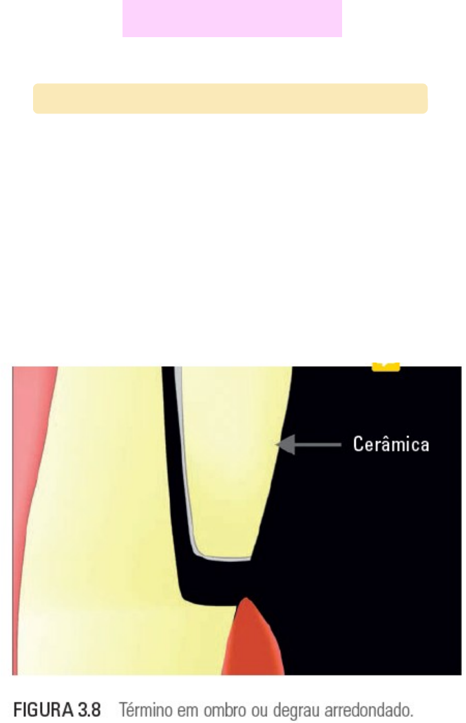 Bianca Marchezi - UFES Prótese Fixa TIPOS DE TERMINAÇÃO CERVICAL OMBRO OU DEGRAU A parede axial do preparo forma um ângulo de 90º com a parede cervical (gengival) · Indicações: preparos para coroas cerâmicas; preparos para coroas metaloceramicas com ombro estético em porcelana · Vantagens: confere rigidez ao material (porcelana), pois tem espessura suficiente de material suficiente pra que ele não frature; linha de terminação nítida e rígida · Desvantagens: exige maior desgaste dentário; dificulta o escoamento do cimento. OMBRO OU DEGRAU ARREDONDADO Um tipo de término em que o ânulo entre as paredes gengival e axial do preparo é de aproximadamente 90º, mantendo arredondada a intersecção entre essas duas paredes para evitar a formação de tensões da cerâmica nessa área. Esse término é indicado nos preparos para coroas cerâmicas, em dentes anteriores ou posteriores e, contraindicado em dentes com coroa clínica curta ou com largura vestibulolingual que impeça a realização de desgaste uniforme nas paredes sem diminuir a resistência da própria coroa do dente. O preparo deve apresentar desgaste uniforme de 1mm de espessura na região do término cervical, de até 1,5mm nas faces axiais e de 2mm nas faces oclusal e incisal. Recomenda-se que o desgaste nas faces axiais seja de até 1,5mm, dependendo da cerâmica empregada e da cor do dente. Dentes escuros que receberão coroas confeccionadas em cerâmicas mais translucidas deverão ter um desgaste mais acentuado. A presença do término em ombro ou degrau é importante para proporcionar uma espessura uniforme e suficiente à cerâmica nessa região, para resistir aos esforços mastigatórios e reduzir a possibilidade de fratura. Esse término provoca um tipo de junção entre as paredes axiais e gengival que pode dificultar o escoamento do cimento, acentuando o desajuste oclusal e cervical com maior espessura de cimento exposto ao meio oral. Para minimizar esse problema, o CD deve usar uma técnica de cimentação que proporcione uma fina camada de cimento no interior da coroa; o pincel é o instrumento ideal para essa finalidade. · Pontas diamantadas MF para fazer o ombro arredondado: 3098MF · Indicações: preparos para coroa metaloceramica com ombro estético em porcelana; preparos para coroas cerâmicas de 1,0 a 1,2mm de espessura. OMBRO OU DEGRAU BISELADO É um término em que ocorre a formação de um ângulo de aproximadamente 90º entre a parede axial e a cervical, com biselamento da aresta cavossuperficial. Esse tipo de término está indicado para as coroas metaloceramicas com ligas áureas na sua face vestibular e na metade das faces vestibuloproximais. O bisel deverá apresentar uma inclinação mínima de 45º, o que permite um selamento marginal e um escoamento do cimento melhores que os proporcionados pelo término em ombro. O ombro ou degrau biselado proporciona um colar de reforço que reduz as alterações dimensionais provocadas durante a queima da cerâmica, e consequentemente, o desajuste marginal. Ele deverá ser realizado nas faces em que a estética for indispensável. A parede axial do preparo forma um ângulo em 90º com a parede cervical Requer remoção exagerada de estrutura dentária, sem oferecer vantagens significativas sobre uma terminação em chanfro. Em coroas metaloceramicas, além de ser de difícil execução, não oferece uma linha de terminação precisa. Também é difícil a compatibilização com a estética, necessitando de extensões subgengivais profundas, que podem comprometer o epitélio juncional, e com riscos de distorção do metal, se não houver um colar com pelo menos 1,00mm, tanto para biséia de 45º como para os de 70º. CHANFRADO Tipo de término em que a junção entre a parede axial e a gengival é feita por um segmento de círculo, que deverá apresentar espessura suficiente para acomodar o metal e a faceta estética. É considerado o tipo de término cervical ideal, porque permite uma espessura adequada para as facetas estéticas de cerâmica ou resina e seus respectivos suportes metálicos, facilitando a adaptação da peça fundida e o escoamento do cimento. É indicado para a confecção de coroas metalocerâmicas com ligas básicas (não áureas), por apresentarem maior resistência e dureza que as ligas a base de ouro. Assim, a infraestrutura pode ser mais fina, sem sofrer alterações por contração durante a cocção da cerâmica. Também indicado para coroas metaloplásticas e para restaurações MOD em metal para proteção das cúspides vestibular e lingual. O término em chanfrado deverá ser realizado apenas nas faces envolvidas esteticamente, pois não se justifica um maior desgaste exclusivamente para colocação de metal. · Por definição, o chanfro é uma determinação em “segmento de círculo” e é formada pela imagem negativa da terminação arredondada do instrumento. Isso significa que metade ou menos da metade do diâmetro pode ser usado. Uma profundidade maior leva a terminações cervicais com características totalmente distorcidas e mais fracas, e que deixam mais facilmente prismas de esmalte sem apoio dentinário, além de ser necessária uma proteção do epitélio sucular para evitar sua ulceração. · A junção entre as paredes axial e gengival é feita por um segmento se círculo, com espessura suficiente para acomodar o metal e a cerâmica · Indicações: Face vestibular e metades vestíbulo-proximais de coroas metaloceramicas; coroa metaloceramica sem cinta metálica; áreas de proteção de cúspide vestibular e lingual de restaurações MOD (onlay). · Vantagens: melhor escoamento do cimento; facilita a adaptação da peça fundida; é mais conservador do que o preparo em ombro. · Desvantagens: degaste mais acentuado em comparação ao chanferete Instrumentos indicados: pontas diamantadas cilíndricas 2215 e 3216. CHANFRADO PROFUNDO É utilizada uma broca de um diâmetro maior para fazer um desgaste 