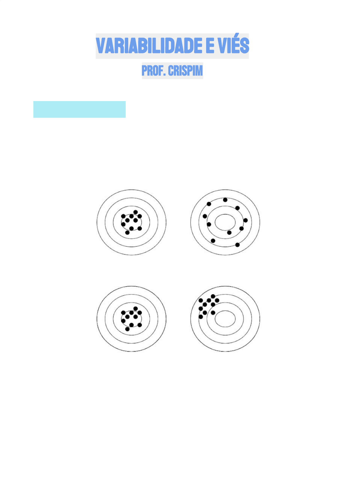 VARIABILIDADE E VIÉS prof. crispim INTRODUÇÃO As dificuldades na interpretação de resultados de testes de pacientes individuais são ampliadas quando são estudados grupos de pacientes. A avaliação da origem das variabilidades nos resultados de testes e dos erros na pesquisa médica é importante para a aplicação adequada dos resultados das pesquisas na prática clínica. A variabilidade das medidas pode ser aleatória ou sistemática. O esquema abaixo demonstra estas diferenças: Os tiros nos dois primeiros alvos encontram-se em volta do centro, mas, no primeiro alvo, eles estão menos espalhados e têm menos variabilidade ou mais precisão. No segundo alvo, podemos considerar que houve um erro aleatório. Nos dois últimos alvos, os tiros estão igualmente concentrados, mas, no último, o conjunto de tiros está fora do centro. Isto ocorreria se, por exemplo, a alça de mira da arma estivesse descalibrada. A precisão é comparável, mas, no último alvo, os tiros estão sistematicamente fora do centro, ou enviesados. Os tiros no terceiro alvo, ao contrário, possuem acurácia ou validade. É importante considerar a acurácia e precisão de quaisquer medidas feitas na situação clínica. Na medicina clínica e na pesquisa médica, a variabilidade pode ocorrer em vários níveis diferentes, principalmente no nível individual e no populacional. Em cada nível, a variabilidade inerente ao método de medida é importante VARIABILIDADE Variabilidade a nível individual A primeira preocupação relacionada à variabilidade deve ser com o verdadeiro valor das características de uma pessoa ao longo do tempo. Podemos citar como fontes de variabilidade: ❖ Características individuais: ● Variação diurna. ● Alterações relacionadas a fatores como idade, dieta e exercícios. ● Fatores ambientais como estação do ano e temperatura. ❖ Características da medida: ● Calibração deficiente do instrumento de medida. ● Falta intrínseca de precisão do instrumento. ● Leitura ou registro incorretos da informação do instrumento pelo técnico. A origem das variações, assim, pode ser o indivíduo sob avaliação, o instrumento utilizado para realizar a medida, o técnico tomando a medida ou a pessoa que interpreta o resultado. A variação pode ocorrer por causa de mudanças ocorridas no indivíduo ao longo do tempo. Estas mudanças podem ocorrer a cada minuto (p.ex., freqüência cardíaca), ao longo do dia (p.ex., temperatura corporal) ou ao longo da vida (p.ex., peso ou altura). Quando a variação intrínseca ao indivíduo é grande, uma única medida pode não representar adequadamente a verdadeira situação do indivíduo. Repetindo um exame, o médico pode obter uma melhor compreensão do verdadeiro valor e de sua variabilidade. Este processo pode também dar ao médico pistas a respeito da variabilidade ou erro devidos à técnica de mensuração. Variações em avaliações populacionais Assim como existem variações entre indivíduos, também existe variabilidade nas populações, a qual pode ser considerada como o efeito cumulativo da variabilidade individual. Desde que as populações são constituídas por diferentes indivíduos, com diferentes constituições genéticas e sujeitos a diferentes influências ambientais, elas freqüentemente apresentam mais variações do que aquelas encontradas entre os indivíduos. Os médicos precisam conhecer as dimensões da variabilidade populacional para decidir o que é “normal” e “anormal”. Variabilidade em pesquisas Quando os investigadores realizam estudos, eles geralmente não podem estudar a população inteira. Eles avaliam grupos ou amostras da população. Este procedimento gera uma nova fonte de variabilidade, a variabilidade amostral, a qual é importante na pesquisa médica. Para evitar variabilidades grandes nas amostras, evitando-se que elas sejam muito diferentes da realidade populacional ou que levem a uma conclusão incorreta em um estudo, é importante realizar pesquisas com uma amostra grande, evitando assim que o acaso prevaleça. Geralmente, quanto maior a amostra, mais precisa é a estimativa do efeito e menores as diferenças detectáveis entre os grupos. Em estudos com amostras muito grandes, pequenas diferenças entre grupos podem ser consideradas estatisticamente significantes, mas ter pouco significado biológico ou clínico. VALIDADE O conceito de validade está relacionado ao grau de acerto na conclusão de uma medida ou estudo. Uma medida ou estudo pode levar a uma conclusão incorreta (inválida) por causa dos efeitos do viés. A variabilidade observada com o viés é sistemática (não-aleatória) e distorce o efeito estimado. No modelo dos alvos, a quantidade de viés pode ser determinada pelo grau com o qual os tiros se afastam do centro no último alvo. Infelizmente, na pesquisa médica, o valor real (centro do alvo) pode ser desconhecido, ou pode não existir um padrão-ouro para comparação. Conseqüentemente, o grau de viés é, na maioria das vezes, difícil de determinar. Há dois tipos diferentes de validade: interna e externa. Validade interna A validade interna refere-se a quanto os resultados de uma investigação refletem, com acurácia, a verdadeira situação da população em estudo. Se os resultados não são válidos na população do estudo, existe pouca razão para se suspeitar que tais resultados se apliquem a outras populações. A validade interna é definida pelos limites do próprio estudo. Assim, um estudo é internamente válido se ele fornece uma estimativa verdadeira do efeito, dados os limites da população estudada. Medidas que podem ser usadas para melhorar a validade interna incluem a restrição do tipo de indivíduos e do ambiente em que o estudo é realizado. Estas medidas diminuem o impacto de fatores estranhos à questão de interesse. Validade externa Um resultado obtido em um ambiente altamente controlado, entretanto, pode não ser aplicáv