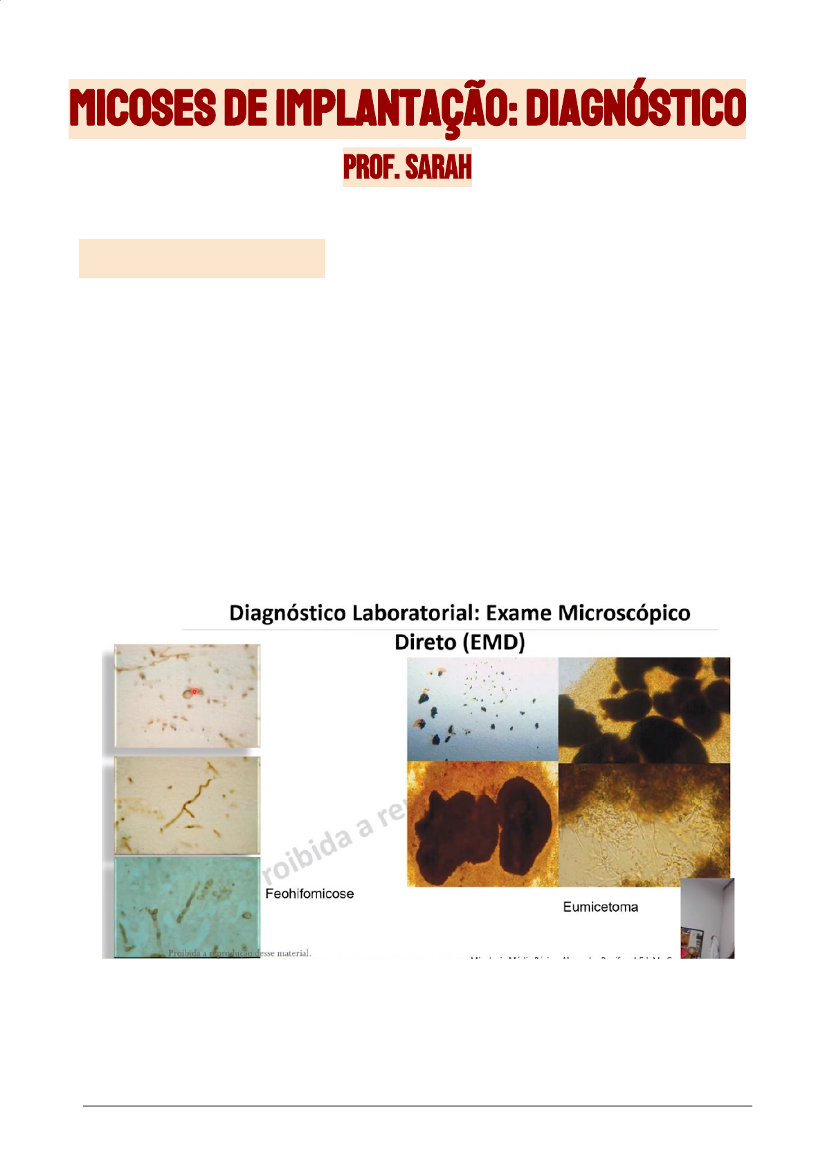 micoses de implantação: diagnóstico prof. SARAH DIAGNÓSTICOS O diagnóstico laboratorial é feito a partir da solicitação do exame microscópico direto (EMD), histopatologia (de peças biopsiadas) e cultura (fazer teste de susceptibilidade fúngica). O material amostrado podem ser: unhas; aspirado de nódulos fechados, cistos ou fístulas; expressão de nódulos abertos; raspado de crostas e escamas de pele; curetagem, excisão, biópsias; coleta de grãos. Ao EMD, acha-se corpos muriformes no caso de CBM, hifas septadas demáceas toruloides ou levaduras demáceas no caso de feohifomicose, ou grãos parasitários no caso de micetoma. Faz-se também o diagnóstico molecular pelo conceito de enfoque polifásico em que se identifica regiões do DNA (região ITS principalmente) e soma-se com os achados morfológicos para definir espécies. Para cultura, utiliza-se meio ágar-Sabouraud dextrose com antibióticos a 25-28ºC de 3 a 4 semanas. A identificação do agente é muito importante, tanto para conhecer a susceptibilidade a tratamento quanto para antecipar o tropismo desse fungo para manejo do paciente. CULTURA Onicomicose - Neosytalidium dimidiatum É um agente de onicomicose (feohifomicose), pode crescer mais esbranquiçado no centro. Vemos no EMD hifas septadas demáceas que podem formar artroconídios. Cromoblastomicose - Cladophialophora Colônia negra com hifas septadas demáceas. Célula fialídica produzindo vários conídios (cicatriz quando se solta). Cromoblastomicose - Phialophora Cromoblastomicose - Rhinocladiella Conidióforo saindo da hifa septada demácea. A produção de conídios é sincodial. Cromoblastomicose - Fonsecaea Apresenta estruturas semelhantes as outras espécies, deixando mais difícil o reconhecimento, porém é a mais comum. Feohifomicose - Curvularia lunata Colônia enegrecida. Ao EMD, se assemelha a um boomerang. Feohifomicose - Alternaria alternata Septo ora transversal ora longitudinal. Obs.: é importante a identificação de espécies do ponto de vista clínico tanto para identificar espécies com possível tropismo pelo SNC e para identificar diferenças no perfil de susceptibilidade dos agentes de feohifomicose. CARACTERIZAÇÃO DE LESÕES Uma lesão verrucosa na pele pode ser uma PLECT: Paracoccidioidomicose, Psoríase, Leishmaniose, Esporotricose, Cromoblastomicose, Câncer ou Tuberculose. Por isso é importante utilizar a clínica e os exames laboratoriais para fechar diagnóstico.