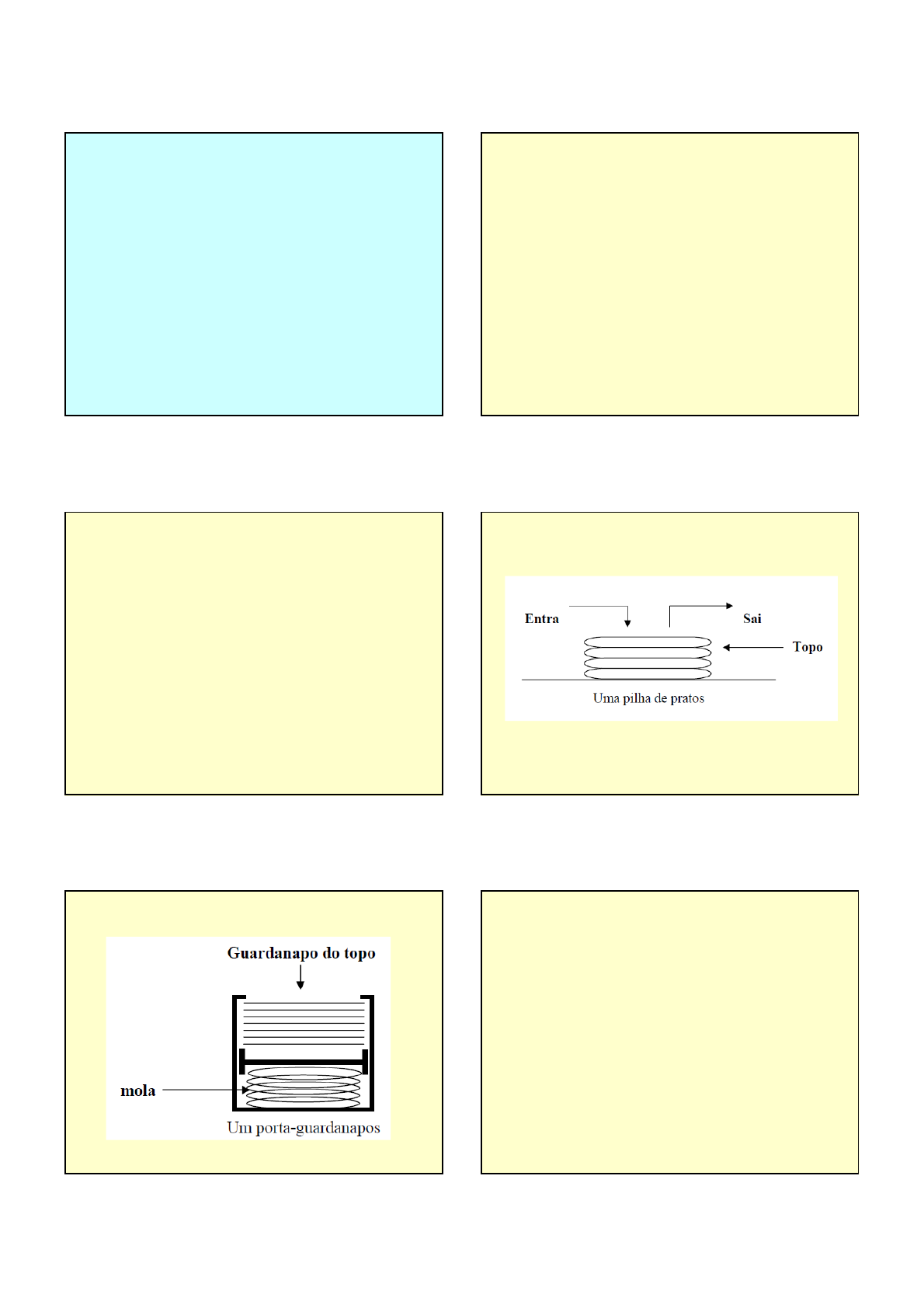 UNICARIOCA TEMA-05 PILHAS ESTRUTURA DE DADOS PILHA (STACK) PILHA é uma LISTA LINEAR onde todas as inserções, remoções e acessos são realizados em um ÚNICO extremo (TOPO). Listas com esta característica são também denominados listas LIFO (Last-In/First-Out: último que entre é o primeiro que sai). É uma ESTRUTURA DINÂMICA pode aumentar ou diminuir durante a sua existência. EXEMPLOS EXEMPLOS • TOP ACESSA o elemento do TOPO • PUSH INSERE um elemento no TOPO • POP REMOVE um elemento do TOPO. OPERAÇÕES BÁSICAS SOBRE PILHAS ESTRUTURA DE DADOS - TEMA-05 1 MANUEL • TOP(P) acessa o elemento localizado no TOPO da Pilha P. • POP(P) remove e retorna o elemento posicionado no TOPO da Pilha P (diminui o tamanho da pilha). • PUSH(P,X) insere o elemento X no TOPO da Pilha P (aumenta o tamanho da pilha). EXEMPLOS DE INSTRUÇÕES EXEMPLO-01 PUSH(P, a) P:[ a ] PUSH(P, b) P:[ b, a ] PUSH(P, c) P:[ c, b, a ] POP(P) P:[ b, a ] POP(P) P:[ a ] P:[ ] PILHA VAZIA EXEMPLO-01 PUSH(P, d) P:[ d, a ] PUSH(P, e) P:[ e, d, a ] TOP(P) P:[ e, d, a ] POP(P) P:[ d, a ] POP(P) P:[ a ] P:[ a ] LIMITES DA PILHA • No mundo real uma pilha é limitada pelo chão e pelo teto. • Não é possível inserir elementos infinitamente. • Não é possível remover elementos infinitamente. • Init inicializa uma pilha no estado “vazia”; Init(P). • IsEmpty verifica se a pilha está vazia; IsEmpty(P). • IsFull verifica se a pilha está cheia. IsFull(P). OPERAÇÕES ESSENCIAIS EM PILHAS EXERCÍCIO-01 Mostre a situação da pilha P, inicialmente vazia, após a execução de cada uma das operações a seguir: Push (P, a); Push (P, b); Push (P, c); Push (P, Top (P)); Push (P, Pop (P)); Pop (P); Push (P, e); Pop (P); ESTRUTURA DE DADOS - TEMA-05 2 MANUEL PUSH (P, a); PUSH (P, b); PUSH (P, c); PUSH (P, Top (P)); PUSH (P, Pop (P)); POP (P); PUSH (P, e); POP (P); EXERCÍCIO-02 Considere a pilha P que contém os elementos 15-6-2-9-17-3. No topo da pilha está o elemento 15. Nesta pilha foram realizados as operações Push(1), Push(3), Pop(), Push(8) e Pop( ). Marque a alternativa que apresenta a pilha final formada. A) 1-15-6-2-9-17-3 B) 15-6-2-9-17-3 C) 8-1-15-6-2-9-17-3 D) 3-1-15-6-2-9-17-3 E) 6-2-9-17-3 P 15 6 2 9 17 3 Push(1) P 1 15 6 2 9 17 3 P 3 1 15 6 2 9 17 3 Push(3) Pop P 1 15 6 2 9 17 3 Push(8) P 8 1 15 6 2 9 17 3 Pop P 1 15 6 2 9 17 3 GABARITO - A O elemento de dados A encontra-se no topo de uma pilha P e o elemento B na base quando C e D são, nessa ordem, inseridos. Em seguida, os dois elementos retirados serão: EXERCÍCIO-03 a) D e C b) B e C c) A e D d) A e C e) A e B ESTRUTURA DE DADOS - TEMA-05 3 MANUEL P A B O elemento de dados A encontra-se no topo de uma pilha e o elemento B na base quando C e D são, nessa ordem, inseridos. Em seguida, os dois elementos retirados serão: P C A B P D C A B P A B GABARITO - A Carpe Diem ESTRUTURA DE DADOS - TEMA-05 4 MANUEL