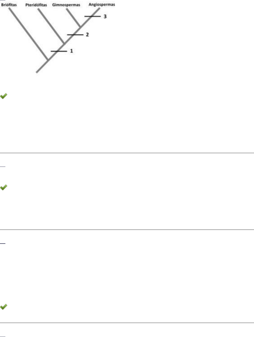 1. A imagem apresentada corresponde a: a) Um cladograma que resume informações sobre as plantas, e os números 1, 2 e 3 correspondem, respectivamente, a flores, frutos e vasos condutores. b) Um cladograma que resume informações sobre as plantas, e os números 1, 2 e 3 correspondem, respectivamente, a vasos condutores, sementes e frutos. c) Um gráfico de dados filogenéticos das plantas terrestres, e os números 1, 2 e 3 correspondem, respectivamente, a flores, frutos e sementes. d) Uma árvore filogenética que resume informações sobre as plantas, e os números 1, 2 e 3 correspondem, respectivamente, sementes, embrião e flores. 2. O corpo de frutificação dos basidiomicetos é formado pelo micélio que emerge do substrato. É no corpo de frutificação que são produzidos os esporos sexuais. Como se chama o corpo de frutificação dos basidiomicetos? a) Basidioma. b) Basídio. c) Basidiomycota. d) Basidiósporo. 3. Alguns seres vivos possuem ciclos de vida muito elaborados. As águas vivas, por exemplo, apresentam um ciclo reprodutivo que intercala uma fase de medusa com uma fase de pólipo. As plantas também possuem um ciclo de vida intercalado, no qual parte do tempo elas estão na fase de gametófito e em outra época na fase de esporófito. Qual o nome deste ciclo vital que intercala diferentes fases durante a vida? a) Bipartição. b) Sucessão ecológica. c) Viviparidade. d) Alternância de gerações. 4. As plantas verdes formam um grupo monofilético em que estão inseridas as algas verdes e as plantas terrestres. Embora vivam em ambientes bem distintos, as algas verdes e as plantas terrestres possuem a mesma estratégia para produzirem seu alimento, a realização de fotossíntese. Com relação a esse processo nas algas verdes e plantas terrestres, classifique V para as sentenças verdadeiras e F para as falsas: ( ) A clorofila a e b estão presentes nos pigmentos fotossintéticos. ( ) O amido é um dos principais carboidratos de reserva. ( ) São capazes de fabricar seu próprio alimento. https://portaldoalunoead.uniasselvi.com.br/ava/notas/request_gabarito_n2.php?action1=QklEMDU1OA==&action2=QklEMjY=&action3=NjU1OTcz&action4=MjAyMC8y&prova=MjU3MDYxMjM=#questao_1%20aria-label= https://portaldoalunoead.uniasselvi.com.br/ava/notas/request_gabarito_n2.php?action1=QklEMDU1OA==&action2=QklEMjY=&action3=NjU1OTcz&action4=MjAyMC8y&prova=MjU3MDYxMjM=#questao_2%20aria-label= https://portaldoalunoead.uniasselvi.com.br/ava/notas/request_gabarito_n2.php?action1=QklEMDU1OA==&action2=QklEMjY=&action3=NjU1OTcz&action4=MjAyMC8y&prova=MjU3MDYxMjM=#questao_3%20aria-label= https://portaldoalunoead.uniasselvi.com.br/ava/notas/request_gabarito_n2.php?action1=QklEMDU1OA==&action2=QklEMjY=&action3=NjU1OTcz&action4=MjAyMC8y&prova=MjU3MDYxMjM=#questao_4%20aria-label= ( ) O processo de fotossíntese é formado somente por água e oxigênio. Assinale a alternativa que apresenta a sequência CORRETA: a) F - V - F - V. b) V - V - V - F. c) V - F - F - V. d) V - V - F - V. 5. As plantas alongam suas estruturas, como raízes e galhos, a fim de atingir uma maior capacidade de alocação de recursos, tanto acima quanto abaixo do solo. Este crescimento é observado durante toda a vida do vegetal e permite às plantas atingirem um porte realmente impressionante. Que estruturas são responsáveis por esse crescimento? a) Células da epiderme. b) Meristemas apicais. c) Arquegônios e anterídios. d) Gametângio multicelular. 6. A célula vegetal é semelhante à célula animal quanto à organização celular, porém apresentam algumas organelas citoplasmáticas diferentes. Todos os seres vivos são formados por células, com exceção dos vírus, que são acelulares. Sobre a célula, analise as sentenças a seguir: I- Todas as células compartilham duas características essenciais: a presença da membrana plasmática, que separa os conteúdos celulares do meio externo, e a ausência de material genético. II- A parede celular envolve a membrana plasmática, a qual envolve o citoplasma, o núcleo e as demais organelas. III- De acordo com a organização estrutural, as células são divididas em procariontes e eucariontes. IV- Células vegetais armazenam glicogênio como fonte de reserva energética. Agora, assinale a alternativa CORRETA: a) As sentenças I, II e III estão corretas. b) As sentenças I, II e IV estão corretas. c) As sentenças III e IV estão corretas. d) As sentenças II e III estão corretas. 7. As pteridófitas são plantas que dependem da água para fecundação, apresentam vasos condutores de nutrientes e não apresentam sementes, flores, nem frutos. De acordo com as estruturas sexuais e ciclo de vida das pteridófitas, classifique V para as sentenças verdadeiras e F para as falsas: ( ) Os anterídios são estruturas reprodutoras masculinas. ( ) O gametófito é a fase dominante no ciclo de vida desse grupo vegetal. ( ) O esporófito é a fase dominante no ciclo de vida desse grupo vegetal. https://portaldoalunoead.uniasselvi.com.br/ava/notas/request_gabarito_n2.php?action1=QklEMDU1OA==&action2=QklEMjY=&action3=NjU1OTcz&action4=MjAyMC8y&prova=MjU3MDYxMjM=#questao_5%20aria-label= https://portaldoalunoead.uniasselvi.com.br/ava/notas/request_gabarito_n2.php?action1=QklEMDU1OA==&action2=QklEMjY=&action3=NjU1OTcz&action4=MjAyMC8y&prova=MjU3MDYxMjM=#questao_6%20aria-label= https://portaldoalunoead.uniasselvi.com.br/ava/notas/request_gabarito_n2.php?action1=QklEMDU1OA==&action2=QklEMjY=&action3=NjU1OTcz&action4=MjAyMC8y&prova=MjU3MDYxMjM=#questao_7%20aria-label= ( ) Os arquegônios são as estruturas reprodutoras femininas. Agora, assinale a alternativa que apresenta a sequência CORRETA: a) V - F - V - V. b) V - V - F - V. c) F - V - F - F. d) F - F - V - F. 8. O bolor ou mofo é uma designação comum dada a fungos filamentosos que não formam estruturas semelhantes a cogumelos. Eles vivem principalmente em lugares úmidos e escuros. Um tipo de mofo muito comum em nosso dia a dia é o bo