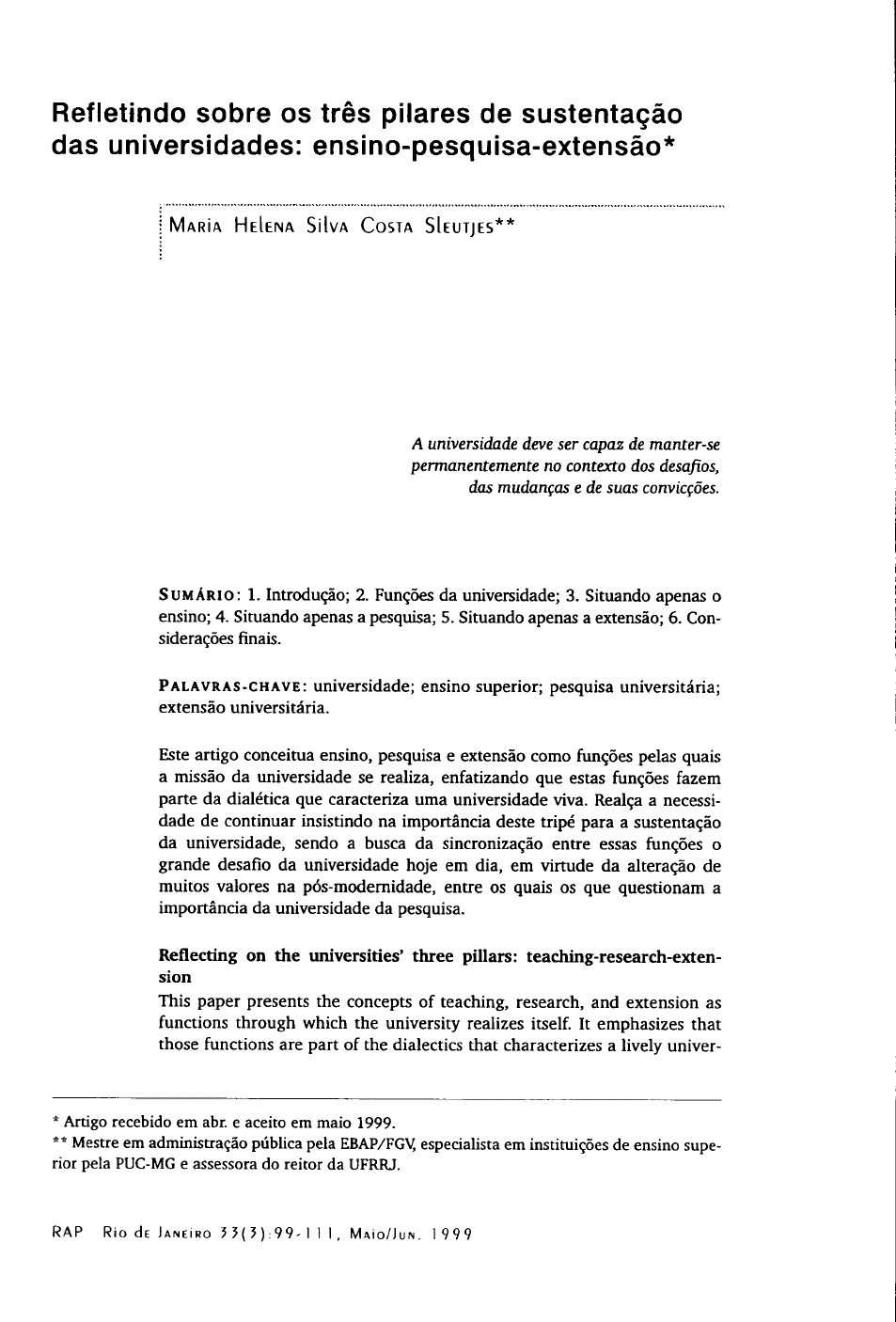 Refletindo sobre os três pilares de sustentação das universidades: ensino-pesquisa-extensão* MARiA HElENA SilvA COSTA SIEUTJES** A universidade deve ser capaz de manter-se permanentemente no contexto dos desafios, das mudanças e de suas convicções. SUMÁRIO: 1. Introdução; 2. Funções da universidade; 3. Situando apenas o ensino; 4. Situando apenas a pesquisa; S. Situando apenas a extensão; 6. Con- siderações finais. PALAVRAS-CHAVE: universidade; ensino superior; pesquisa universitária; extensão universitária. Este artigo conceitua ensino, pesquisa e extensão como funções pelas quais a missão da universidade se realiza, enfatizando que estas funções fazem parte da dialética que caracteriza uma universidade viva. Realça a necessi- dade de continuar insistindo na importância deste tripé para a sustentação da universidade, sendo a busca da sincronização entre essas funções o grande desafio da universidade hoje em dia, em virtude da alteração de muitos valores na pós-modernidade, entre os quais os que questionam a importância da universidade da pesquisa. Reflecting 00 the universities' three pillars: teachiog-research-exteo- sioo This paper presents the concepts of teaching, research, and extension as functions through which the university realizes itself. It emphasizes that those functions are part of the dialectics that characterizes a lively univer- * Artigo recebido em abro e aceito em maio 1999. ** Mestre em administração pública pela EBAP/FGV, especialista em instituições de ensino supe- rior pela PUC-MG e assessora do reitor da UFRRJ. RAP Rio dE JANEiRO np)99-111. Mllio/JUN. 1999 100 sity. It stresses the need for insisting on the relevance of this tripod to sus- tain the university. The search for synchronization of these three funcúons is the university's current great challenge, due to the changes on many post-modem values, among which those questioning the importance of the research university. 1. Introdução Todas as transformações que estão ocorrendo devem levar a refletir sobre o papel das universidades no mundo contemporâneo para que não se perca, através da distorção de valores que está ocorrendo na pós-modernidade, uma das mais interessantes formas de adquirir conhecimento: a universidade da pesquisa. A universidade da pesquisa é uma feição do ensino superior que consa- grou o grande desenvolvimento da ciência e, conseqüentemente, da tecnologia e que tem sua origem na Fundação da Universidade de Bolonha, há aproxima- damente mil anos. Sua característica essencial é ser detentora do saber, além de guardiã do conhecimento, formadora das elites dirigentes, motor propulsor da história, da ciência e, depois, da tecnologia, encontrando-se agora em fase de desorientação quanto à sua verdadeira missão. A universidade, tal como a concebemos hoje, é uma instituição recentís- sima que já passou por inúmeras transformações. Foi pensada como a universi- dade da consciência, aquela que Ortega y Gasset1 e Humboldt2 consideravam ter como missão principal formar a consciência humana. Foi pensada também como a universidade do trabalho, sob inspiração americana, principalmente após os anos 50, e hoje tudo indica que estamos caminhando para um modelo que tem a ver com a cidadania, os direitos do homem e a grande necessidade de realizar justiça e eqüidade. Diante dos contornos da pós-modernidade e da conseqüente fragmenta- ção de valores, as transformações que estão ocorrendo na sociedade humana provocam mudanças consideráveis em todos os setores, chegando até a banali- zar valores até então importantes. Assim, verificamos que atualmente o termo universidade passou a ser usado indistintamente, e este uso vem-se generali- zando, algumas vezes numa tendência de volta à origem destas instituições, ou- tras vezes na tentativa de encontrar uma nova concepção de universidade, descaracterizando a concepção existente: 1 Escritor e pensador espanhol (1883-1955). 2 Filósofo, filólogo e diplomata alemão (1767-1835); foi ministro da Educação, fundador da Uni- versidade de Berlim e seu primeiro reitor. RAP ~/99 É um momento de dúvidas e incertezas para as universidades tradicio- nais, embora essas dúvidas não cheguem a causar grande polêmica e inquie- tação. Enquanto isso, proliferam novas universidades, sem vinculação com a pesquisa, atuando apenas na área de ensino e cumprindo o papel de atender a uma demanda cada vez maior por educação superior, mas sem o caráter es- sencial da universidade, que é o de associar o ensino à pesquisa e vice-versa, gerando automaticamente a necessidade de estender o resultado alcançado, normalmente importante para a sociedade. Neste contexto, temos também as empresas, especialmente as multi nacionais de grande porte, que começam a criar um instrumento de geração de conhecimento, um conhecimento que elas denominam corporativo, e a este instrumento dão erroneamente o nome de universidade, contrariando todo o sentido do próprio termo, que tem na universalização do conhecimento sua essência principal. Tudo isto é indício de que a universidade precisa realizar profundas al- terações para melhor se ajustar à sociedade contemporânea e a suas neces- sidades. Porém, é preciso refletir criteriosamente sobre esta necessidade de mudanças, que é premente e primordial, mas, em hipótese alguma, pode-se abrir mão dos valores essenciais destas instituições. Este artigo, portanto, tem a preocupação de refletir sobre o ensino, a pesquisa e a extensão, tendo-os como valores essenciais para que a universi- dade de fato seja preservada. Aquela universidade que nunca deixará de ser um lugar de excelência e que, conforme Alves (citado por Sleutjes, 1997), "no dia em que se massificar, deixará de existir". Portanto, preservar os espaços para a excelência e suas complexidades é a primeira condição de seu existir; a segunda é o resgate de va