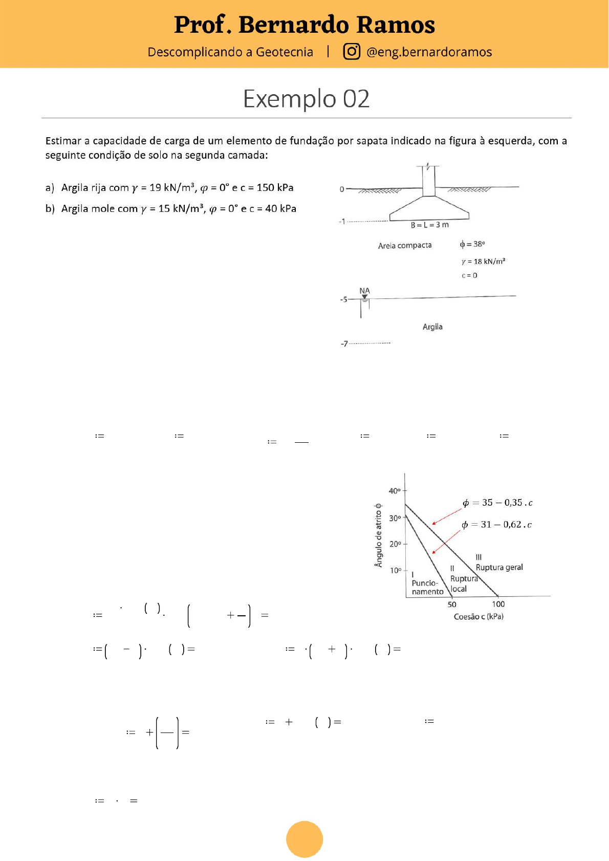 Capacidade de Carga da Areia Compacta Passo 01: Informações de Projeto / Tipo de Ruptura kPa0c deg38ϕ 3 m kN 18γ m3,0L m3,0B m1,0z Areia Compacta - Ruptura Geral Passo 02: Fatores de Carga 48,93 2 tan 2 ϕ deg45 tan ϕπ eNq 61,35cot ϕ1NqNc 78,02tan ϕ1Nq2Nγ Passo 03: Fatores de Forma (Sapata Quadrado) 1,8 Nc Nq 1Sc 1,78tan ϕ1Sq 0,60Sγ Passo 04: Sobrecarga kPa18zγq Sobrecarga do solo acima da cota de assentamento. Passo 05: Tensão de Ruptura MPa2,83SγNγBγ2 1SqNqqScNccσR1 Capacidadede Carga da Argila Rija Passo 01: Informações de Projeto / Tipo de Ruptura 3 m kN 19γkPa150c deg0ϕ m7m4LLSF m5,0z m7m4BBSF 3 m kN 9 3 m kN 10γγSUB Ruptura Geral - Argila Rija Passo 02: Fatores de Carga 1 2 tan 2 ϕ deg45 tan ϕπ eNq 5,14Nc 0tan ϕ1Nq2Nγ Passo 03: Fatores de Forma (Sapata Quadrado) 1,19 Nc Nq 1Sc 1tan ϕ1Sq 0,60Sγ Passo 04: Sobrecarga 3 m kN 18γAREIA kPa90zγAREIAq Sobrecarga do solo acima da cota de assentamento. Passo 05: Tensão de Ruptura MPa1,01SγNγBγSUB2 1SqNqqScNccσR2 Como o bulbo de tensões da sapata solicita a Argila Rija e a tensão de ruptura desse solo é MENOR do que a tensão de ruptura da Areia Compacta, devemos analisar a interação entre essas duas tensões da seguinte maneira: m6B2Z Profundidade do bulbo de tensões considerada a partir da cota de assentamento. m4a Espessura da Areia Compacta solicitada pelo bulbo de tensões da sapata. m2b Espessura da Argila Rija solicitada pelo bulbo de tensões da sapata. MPa2,23 ba σR2bσR1a σR1,2 A partir da tensão média calculada acima, iremos verificar se a parcela desta tensão que solicitará a camada de Argila Rija é maior ou não do que a tensão de ruptura deste solo. MPa0,41 LSFBSF LBσR1,2 ΔσR1,2 Como a parcela de tensão que solicitará a Argila Rija é MAIOR do que tensão de ruptura deste solo, será adotado como tensão de ruptura a tensão média. σR2ΔσR1,2 MPa2,23σR1,2σR