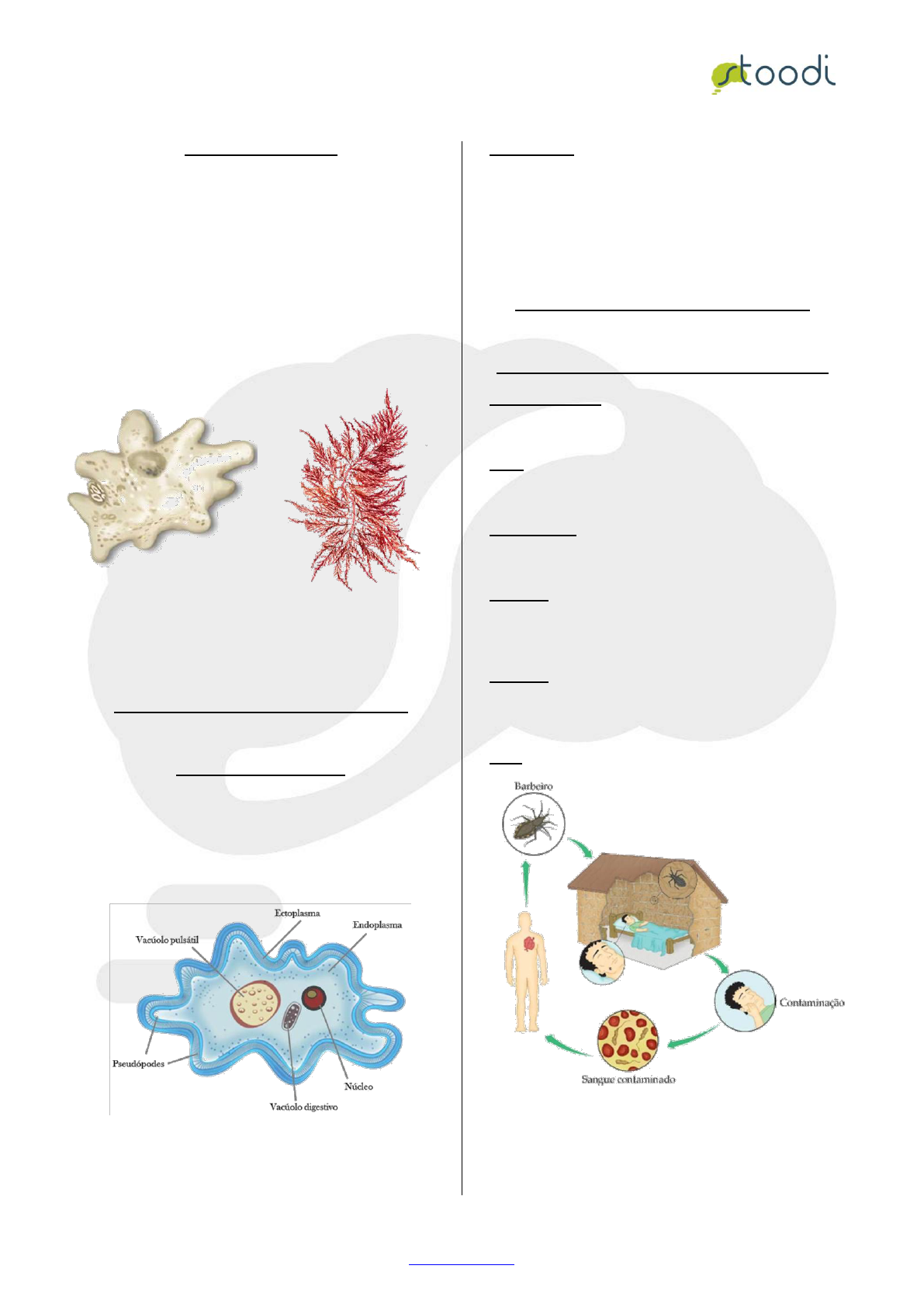 REINO PROTOCTISTA: ALGAS E PROTOZOÁRIOS Copyright © 2015 Stoodi Ensino e Treinamento à Distância www.stoodi.com.br 1 AULA 1 – VISÃO GERAL Reino que engloba organismos em sua grande maioria unicelulares (apesar de alguns deles serem pluricelulares) e eucariontes. Os principais espécimes desta divisão podem ser encontrados em dois principais grupos: os protozoários, comumente relacionados com as amebas, e as algas, organismos muito importantes ecologicamente. Ambos possuem origem evolutiva antiga, e relações bastante fortes com a origem animal e vegetal. Abaixo, um exemplo de protozoário e alga, respectivamente. Disponível em: http://m.ocdn.eu/_m/7f4916ae6d1a6c858340255fdf666846 ,14,1.jpg e http://www.biologados.com.br/images/bonnemaisonia_rodo phyta_alga_vermelha.jpg AULA 2 – PROTOZOÁRIOS Organismos eucariontes, unicelulares e heterótrofos. Podem ser de vida livre ou sésseis, e participar de relações comensais, mutualísticas ou parasíticas. A estrutura característica que representa o grupo é a estrutura da ameba. Disponível em: http://ajbuilders.com/wp- content/uploads/2014/05/amoeba1.png Classificação Os protozoários se dividem em quatro principais classes: Flagelados (Ex: Trypanosoma), Sarcodinos ou Rizópodos (Ex: Amoeba), Ciliados (Ex: Paramecium), e Esporozoários (Ex: Plasmodium). Dentre estes grupos, somente os Esporozoários possuem dois tipos de reprodução (sexuada e assexuada), enquanto os outros apenas se reproduzem assexuadamente. AULA 3 – PROTOZOONOSES: DOENÇA DE CHAGAS Agente Etiológico Trypanosoma cruzi (flagelado). Vetor Barbeiro (gênero Triatoma). Local de ação Sangue e tecidos musculares e nervosos. Sintomas Sinal de Romanã, inflamações, megaesofagia, megacolia e cardiomegalia. Profilaxia Controle do vetor, melhoras em moradia, uso de telas e redes em camas. Ciclo Disponível em: https://nossomeioporinteiro.files.wordpress.com/2011/12/u ntitled-4721.jpg REINO PROTOCTISTA: ALGAS E PROTOZOÁRIOS Copyright © 2015 Stoodi Ensino e Treinamento à Distância www.stoodi.com.br 2 AULA 4 – PROTOZOONOSES: MALÁRIA Agente etiológico Plasmodium sp. Vetor Mosquito-prego fêmea (gênero Anopheles). Local de ação Hemácias e fígado. Sintomas Febres intermitentes, anemia e complicações hepáticas. Profilaxia Controle do vetor e vacina. Ciclo Disponível em: http://www.euroclinix.com.pt/images/pages/ciclo- transmissao-malaria.gif AULA 5 – PROTOZOONOSES: OUTRAS DOENÇAS Giardíase O agente etiológico Giardia lamblia causa a doença citada, que se dá a partir da ingestão de alimentos contaminados, causando diarreia e falta de apetite como principais sintomas. Tricomoníase Doença transmitida através do contato sexual com indivíduo contaminado, ou com utensílios íntimos. Corrimento e coceira vaginal são os principais sintomas da doença, causada pelo protozoário Trichomonas vaginalis. Leishmaniose Doenças causadas pelo protozoário de gênero Leishmania, pode ser de dois tipos: Leishmaniose tegumentar americana, e Leishmaniose cutânea. Ambos os tipos trazem complicações imunológicas ao organismo. Amebíase Doença causada pelo agente etiológico Entamoeba histolytica e se transmite a partir da ingestão de alimentos contaminados com cistos. Causa lesões intestinais e pode evoluir para quadros cerebrais graves. Toxoplasmose Doença bastante relacionada com crianças causa lesões oculares e disfunções cerebrais. Dá-se a partir do contato de fezes de animais contaminados, como gatos, e o agente etiológico é o protozoário Toxoplasma gondii. AULA 6 – ALGAS: CARACTERÍSTICAS GERAIS E CLASSIFICAÇÃO Organismos eucariontes, autótrofos clorofilados (em sua maioria), uni ou pluricelulares. De ambientes aquáticos, possuem reprodução sexuada ou assexuada, e uma vasta diversidade de organismos. Classificação I) Clorofíceas: algas verdes, possíveis ancestrais das plantas terrestres. II) Feofíceas: algas pardas, com maior complexidade estrutural. III) Rodofíceas: algas vermelhas, produzem o ágar-ágar. IV) Crisofíceas: algas douradas, importantes quanto a capacidade fotossintética. V) Pirrofíceas: algas cor de fogo, responsáveis pela maré vermelha. AULA 7 – ALGAS: CLASSIFICAÇÃO E IMPORTÂNCIA ECOLÓGICA Importância ecológica e ambiental As algas são as maiores responsáveis pela produção de O2 na atmosfera através da fotossíntese, disponibilizando- o para a respiração dos seres aeróbicos. Além disso, elas são a base da cadeia alimentar marinha, compondo o fitoplâncton. REINO PROTOCTISTA: ALGAS E PROTOZOÁRIOS Copyright © 2015 Stoodi Ensino e Treinamento à Distância www.stoodi.com.br 3 A maré vermelha é o fenômeno de proliferação intensa de algas pirrofíceas, que causa morte de animais marinhos por liberação de toxinas. A eutrofização é também a proliferação maior do número de algas, no caso as algas verdes, diminuindo a zona fótica da superfície da água. Importância econômica e biotecnológica As algas são muito relacionadas com a produção de alimento humano e alimento de bactérias em meio de cultura (ágar-ágar). O alginato de algas pardas também é uma substância usada na indústria alimentícia e cosmética, assim como o diatomito de crisofíceas é usado na confecção de filtros, materiais de construção e pastas de dente. AULA 8 – MIXOMICETOS E OOMICETOS Organismos eucariontes e heterótrofos, de difícil classificação taxonômica, sendo por vezes classificados como fungos por sua semelhança estrutural. Possuem ao redor de 1000 espécies e servem de alimento para diversos artrópodes. Myxomycota Organismos plasmodiais, sem parede celular, que tem como característica a formação de corpos de frutificação e esporos, que conferem resistência ambiental. Oomycota Organismos que formam parede celular, e possuem forte relação ecológica na formação de ferrugem de folhas de plantas, como em parreiras.