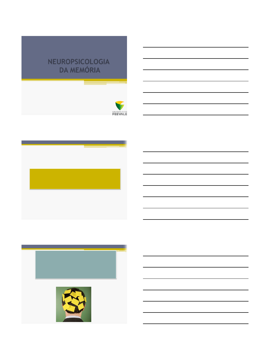 02/04/2015 1 NEUROPSICOLOGIA DA MEMÓRIA Prof. Caroline de Oliveira Cardoso Universidade FEEVALE Instituto de ciências humanas, letras e artes Avaliação Neuropsicológica Lembrete: Quando eu terminar de fazer a chamada vocês devem abraçar o colega ao lado O que é memória? Ou o que são as memórias?? 02/04/2015 2 O que seríamos sem a nossa memória? Como guardamos conhecimentos e experiências de vida? Como conseguimos lembrar de algumas coisas? Porque esquecemos de outras? Como nossa memória funciona? Será que nossas lembranças são sempre verdadeiras? “Tudo no cérebro funciona através da memória. Caminhamos, falamos e nos comunicamos, porque nos lembramos de fazê-lo. O cérebro manda secretar um ou outro neurotransmissor ou hormônio quando estamos tristes ou alegres, ou quando sentimos medo ou prazer, porque se recorda em fazê-lo” (Iván Izquierdo). O que é memória? O que seríamos sem a nossa memória? Como guardamos conhecimentos e experiências de vida? Como conseguimos lembrar de algumas coisas? Porque esquecemos de outras? Como nossa memória funciona? Será que nossas lembranças são sempre verdadeiras? 02/04/2015 3 O que é memória? Habilidade de reter, armazenar e recuperar informações; Meio pelo qual recorremos às experiências passadas a fim de usar essas informações no presente e guiar-nos para o futuro. Sohlberg e Mateer (1989) Aquisição Armazena- mento Recuperação Lembrança Como a memória funciona? 3 etapas necessárias para o sistema de memória funcionar Etapas de Memorização Aquisição: transformar informações da experiência em representações mentais. 02/04/2015 4 Armazenamento: retenção da informação codificada em registros mentais. P a s s a g e m d o t e m p o Etapas de Memorização Recuperação: evocando um conjunto de informações armazenadas ???? RECONHECIMENTO RECUPERAÇÃO ≠ Etapas de Memorização QUANT O AOTEM PO QUANTO AO CONTEÚDO MEMÓRIA DE TRABALHO MEMÓRIA PROSPECTIVA Quanto ao tempo Quanto ao conteúdo Memória Prospectiva Memória de Trabalho Classificação e Tipos da Memória 02/04/2015 5 Modelo tradicional quanto ao tempo Memória Sensorial Armazena informações dos sentidos de forma momentânea Memória de Curto Prazo Armazena informações por um período curto de tempo Memória de Longo Prazo Atkinson & Shiffrin (1968) armazenamento duradouro Memória Declarativa ou Explícita Procedural ou Implícita •Sistema de memória acessível à consciência •Armazena eventos, fatos ou conhecimentos. •São memórias não declarativas e referem-se a atos automáticos e inconscientes Modelo dos sistemas múltiplos de memória quanto ao conteúdo Tulving, 1972 MEMÓRIAS DECLARATIVAS Memórias que registram fatos, eventos ou conhecimentos. Memórias adquiridas com plena intervenção da consciência. Memória Declarativa ou Explícita Semântica Episódica Procedural ou Implícita Modelo dos sistemas múltiplos de memória quanto ao conteúdo 02/04/2015 6 Referente a eventos aos quais assistimos ou dos quais participamos. Informação com um referencial de tempo característico; eventos ou episódios experimentados de maneira pessoal (memórias autobiográficas). • “O que você comeu jantou ontem?”; • “Qual a história do filme que você assistiu no cinema no domingo?” Modelo dos sistemas múltiplos de memória quanto ao conteúdo MEMÓRIAS DECLARATIVAS EPISÓDICA Conhecimento da vida em geral; Memória para fatos que não nos são exclusivos e que não são evocados em algum contexto temporal específico. Inclui conhecimento sobre o mundo, significado das palavras, o que fazer em determinada situação • “O que é memória?” • conhecimentos de psicologia • conhecimentos de línguas • conhecimentos gerais Modelo dos sistemas múltiplos de memória quanto ao conteúdo MEMÓRIAS DECLARATIVAS SEMÂNTICA • NÃO envolve consciência do ato de lembrar •Não faz referência a informações espaciais ou temporais Memória Declarativa ou Explícita Procedural ou Implícita Condicionamento e Hábito Priming Habilidades procedurais Modelo dos sistemas múltiplos de memória quanto ao conteúdo MEMÓRIAS PROCEDURAL 02/04/2015 7 MEMÓRIA PROSPECTIVA Lembrança de um evento futuro MEMÓRIA DA AGENDA DA PROGRAMAÇÃO “Sistema ativo, a partir do qual o indivíduo possui uma capacidade de armazenar informação por um tempo curto e limitado, mas suficiente para manipular tal informação durante a realização de tarefas mais complexas” MEMÓRIA DE TRABALHO 02/04/2015 8 Estruturas Envolvidas na Memória Nível de consciência Atenção para registrar Sistema Límbico Informações novas Sistema Límbico Lobo Temporal Armazenamento e consolidação Estratégias de armazenamento e recuperação Inibição de informações relevantes Caso HM • Caso clássico na neuropsicologia – Brenda Milner (1957) • Sofreu TCE – gerou crises epilépticas • 1953 - encaminhado para o neurocirurgião William Scoville. • Origem das epilepsias = lobo temporal medial – retirados seus hipocampos, giros parahipocampal, as amígdalas e o córtex entorrinal. • Resultado: sem epilepsia, porém grave problema de memória – amnésia anterógrada FATORES QUE INTERFERE NA MEMÓRIA - Idade - Exercício físico - Medicamentos - Drogas - Estresse, depressão, ansiedade - Distúrbio do sono - Problema hormonal e metabólico. . 02/04/2015 9 Avaliação Neuropsicológica da Memória • Dígitos e SNL WAIS-III/WISC-IV • Informação e Vocabulário WAIS-III/WISC-IV • Figuras Complexas de Rey • Teste de aprendizagem auditiva-verbal de Rey (RAVLT) • Memória Lógica - Wechsler Memory Scale (WMS-R) Avaliação da Memória Quem deve ser avaliado? • Queixa de memória • Suspeita de epilepsia do lobo temporal • Suspeita de demência de Alzheimer • Quadros de AVC e TCE • Dependência química • Portadores de AIDS • Tarefas que contemplam distintas vias de acesso ao conhecimento sobre o mundo: 