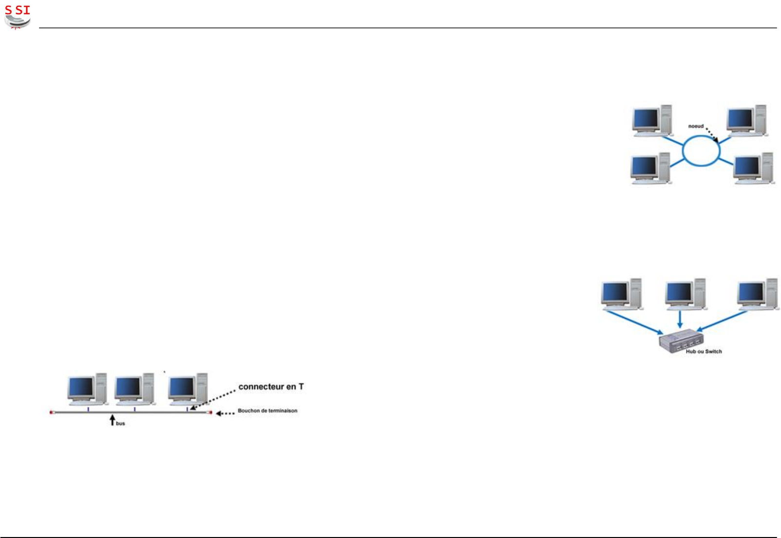 COURS : ARCHITECTURE D’UN RÉSEAU INFORMATIQUE A2. ANALYSER LE SYSTÈME page 1 / 6 1. PRÉSENTATION Un réseau (network) est un ensemble d'équipements électroniques (ordinateurs, imprimantes, scanners, modems, routeurs, commutateurs...) interconnectés et capables de communiquer (émettre et recevoir des messages) par l'intermédiaire d'un support de communication. Un réseau informatique permet donc l'échange d'informations (messageries, transfert de fichiers, interrogation de bases de données...) et l'accès aux ressources (ou mise en commun, partage) de certains ordinateurs du réseau (matériel tel qu'imprimante ou modem, puissance de calcul, logiciels). Un réseau permet donc une économie de coût, un gain de productivité, une utilisation rationnelle des bases de données (consultations, modifications de chaque utilisateur autorisé sur la même base) et une meilleure stratégie dans le domaine de la sécurité (centralisation et sauvegarde éventuellement automatisée des données). Par contre, un réseau a pour inconvénient sa complexité (d'où le recours à un personnel spécialisé en cas de problème) et les conséquences d'une panne sur l'ensemble du réseau. 1.1. CATÉGORIES DE RÉSEAUX INFORMATIQUES On distingue quatre catégories de réseaux informatiques selon leur taille (nombre de machines) et leur étendue : le réseau personnel (PAN : Personal Area Network), relie des machines sur quelques mètres ; – le réseau local (LAN : Local Area Network), est adapté à la taille d’un site d’entreprise – le réseau métropolitain (MAN : Metropolitan Area Network), est un réseau étendu à l’échelle d’une ville; – le réseau étendu WAN : (Wide Area Network), couvre une grande zone géographique, typiquement à l'échelle d'un pays, d'un continent. 1.2. TOPOLOGIE DES RÉSEAUX DE TYPE LAN Il existe trois topologies de base pour concevoir un réseau : bus, anneau et étoile. 1.2.1. TOPOLOGIE EN BUS Le bus est un segment central où circulent les informations. Il s’étend sur toute la longueur du réseau et les machines viennent s’y accrocher. Lorsqu’une station émet des données, elles circulent sur toute la longueur du bus et la station destinatrice peut les récupérer. Une seule station peut émettre à la fois. En bout de bus, un « bouchon » permet de supprimer définitivement les informations pour qu’une autre station puisse émettre. L’avantage du bus réside dans la simplicité de sa mise en œuvre. Par contre, en cas de rupture du bus, le réseau devient inutilisable. Notons également que le signal n’est jamais régénéré, ce qui limite la longueur des câbles. 1.2.2. TOPOLOGIE EN ANNEAU Développée par IBM, cette architecture est principalement utilisée par les réseaux Token Ring. Elle utilise la technique d’accès par «jeton». Les informations circulent de station en station, en suivant l’anneau. Un jeton circule autour de l’anneau. La station qui a le jeton émet des données qui font le tour de l’anneau. Lorsque les données reviennent, la station qui les a envoyées les élimine du réseau et passe le jeton à son voisin, et ainsi de suite… Cette topologie permet d’avoir un débit proche de 90% de la bande passante. De plus, le signal qui circule est régénéré par chaque station. En réalité les ordinateurs d'un réseau en anneau ne sont pas reliés en boucle, mais sont reliés à un répartiteur (appelé MAU, Multistation Access Unit) qui va gérer la communication entre les ordinateurs qui lui sont reliés en impartissant à chacun d'entre eux un temps de parole. 1.2.3. TOPOLOGIE EN ÉTOILE C’est la topologie la plus courante. Toutes les stations sont reliées à un unique composant central : le concentrateur. Quand une station émet vers le concentrateur, celui-ci envoie les données à celle qui en est le destinataire (switch) ou à toutes les autres machines (hub). Ce type de réseau est facile à mettre en place et à surveiller. La panne d’une station ne met pas en cause l’ensemble du réseau. Par contre, il faut plus de câbles que pour les autres topologies, et si le concentrateur tombe en panne, tout le réseau est hors d’état de fonctionner. De plus, le débit pratique est moins bon que pour les autres topologies. 2. LE MATÉRIEL 2.1. LE SUPPORT DE COMMUNICATION Les infrastructures ou supports peuvent être des câbles dans lesquels circulent des signaux électriques, l'atmosphère où circulent des ondes radio, ou des fibres optiques qui propagent des ondes lumineuses. Dans les réseaux en étoile, le support de communication est fréquemment désigné par le terme ethernet du nom du standard de transmission de données utilisé sur ce type de réseau. COURS : ARCHITECTURE D’UN RÉSEAU INFORMATIQUE A2. ANALYSER LE SYSTÈME page 2 / 6 La fibre optique (figure 1) autorise des vitesses de communication très élevées (plus de 100 Gigabit/s) ou en milieu très fortement parasité. Le câble paire torsadées (figure 2) terminé par un connecteur RJ45 (figure 3) est constitué de fils qui sont torsadés par paire. Son utilisation est très courante pour les réseaux en étoile. Les ondes radio (radiofréquences 2,4 GHz) permettent de connecter des machines entre elles sans utiliser de câbles. La norme la plus utilisée actuellement pour les réseaux sans fil est la norme IEEE 802.11, mieux connue sous le nom de Wi-Fi (figure 4). Le Wi-Fi permet de relier des machines à une liaison haut débit (de 11 Mbit/s théoriques ou 6 Mbit/s réels en 802.11b) sur un rayon de plusieurs dizaines de mètres en intérieur (plusieurs centaines de mètres en extérieur). Le câble coaxial, pour des réseaux de topologie en bus, est constitué d’un fil entouré d’un blindage. 2.2. LE COUPLEUR La carte réseau (figure 5) assure l'interface entre la machine dans laquelle elle est montée et un ensemble d'autres équipements connectés sur le même réseau. On trouve des cartes réseau dans les ordinat