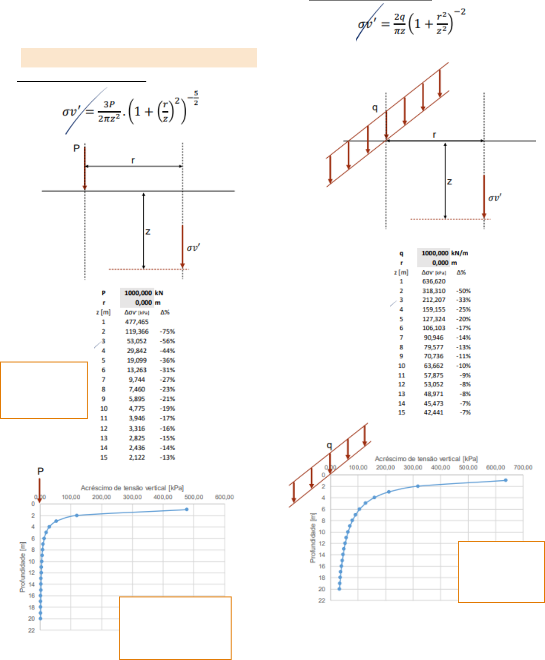 Sarah Valente Tavares Ceatec – Engenharia Civil 1 Teoria da elasticidade SOLUÇÃO DE BOUSSINESQ Carga concentrada ou pontual Carga distribuída linearmente Grande variação de tensões nos primeiros metros. Δ% em relação a camada anterior Mesmo estilo da curva da carga pontual Sarah Valente Tavares Ceatec – Engenharia Civil 2 SOLUÇÃO DE NEWMARK Carregamento em áreas retangulares Para cargas retangulares uniformes Integração da equação de Boussinesq Determinação das tensões em um ponto abaixo da vertical passando pelo vértice da área retangular (canto da placa): v’ é igual para todos os cantos Considerando que a tensão num ponto qualquer é função só dos parâmetros m e n, toda a expressão pode ser tabelada, de forma que se tem: Pode – se buscar a solução em ábacos ou tabelas Uso de ábacos (menor precisão) Calculadora: arctg em radianos Excel: já trabalha em radianos 3 casas decimais no fim! Eixo x: escala de log curva Sarah Valente Tavares Ceatec – Engenharia Civil 3 Os resultados da tabela e do ábaco devem ser bem próximos. Sarah Valente Tavares Ceatec – Engenharia Civil 4 SOLUÇÃO DE STEINBRENNER Carregamento em áreas retangulares (cantos) Outra possível solução para I (fator de influência) O ponto analisado deve ser sempre o vértice da placa retangular Obs.: Quando o ponto estiver no meio ou fora da placa subdivide – se a placa de forma a “forçar” o ponto de estudo a ficar, em todas as subdivisões, no vértice; Calcular todos os acréscimos de tensão gerados e soma – los Calculadora: arctg em radianos 3 casas decimais no fim! Sarah Valente Tavares Ceatec – Engenharia Civil 5 MODELO DE LOVE Carregamento em áreas circulares Integração da solução de Boussinesq Carga distribuída uniformemente Se o acréscimo a ser considerado estiver no centro da placa pode – se utilizar a expressão: Para outros locais de propagação de tensão pode – se utilizar ábacos ou tabelas para determinar o Fator influência (I): A área 4 foi retirada duas vezes, então, deve ser somada. Acréscimo de tensão no eixo da placa 3 casas decimais no fim! Sarah Valente Tavares Ceatec – Engenharia Civil 6 Fora da placa: maior que 1 No bordo: 1 Na projeção da placa: entre 0 e 1 Sarah Valente Tavares Ceatec – Engenharia Civil 7 Uso de tabela Sarah Valente Tavares Ceatec – Engenharia Civil 8 SOLUÇÃO DE OSTERBERG Para aterros Para determinar o acréscimo Calculadora: arctg em radianos Aterro total = 2 x v’ (iguais) Diferentes: Calcular primeiro de um lado, depois para o outro lado do aterro e somar. Essa fórmula é para uma parcela do aterro. Sarah Valente Tavares Ceatec – Engenharia Civil 9 Eixo x: escala de log Sarah Valente Tavares Ceatec – Engenharia Civil 10