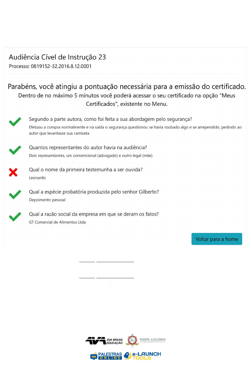 Avaliação de Conhecimento : Justiça Comum Cível Audiência Cível de Instrução 23 CENTRAL DE DUVIDAS CONECTE-SE Apoio Audiências de Instrução contato@avaeducacao.com.br contato@avaeducacao.com.br Central de ajuda Audiências online https://audienciasonline.com.br/#/avaliacao/5cf9652fd779c9136512c44a 1 of 2 09/04/2021 14:12