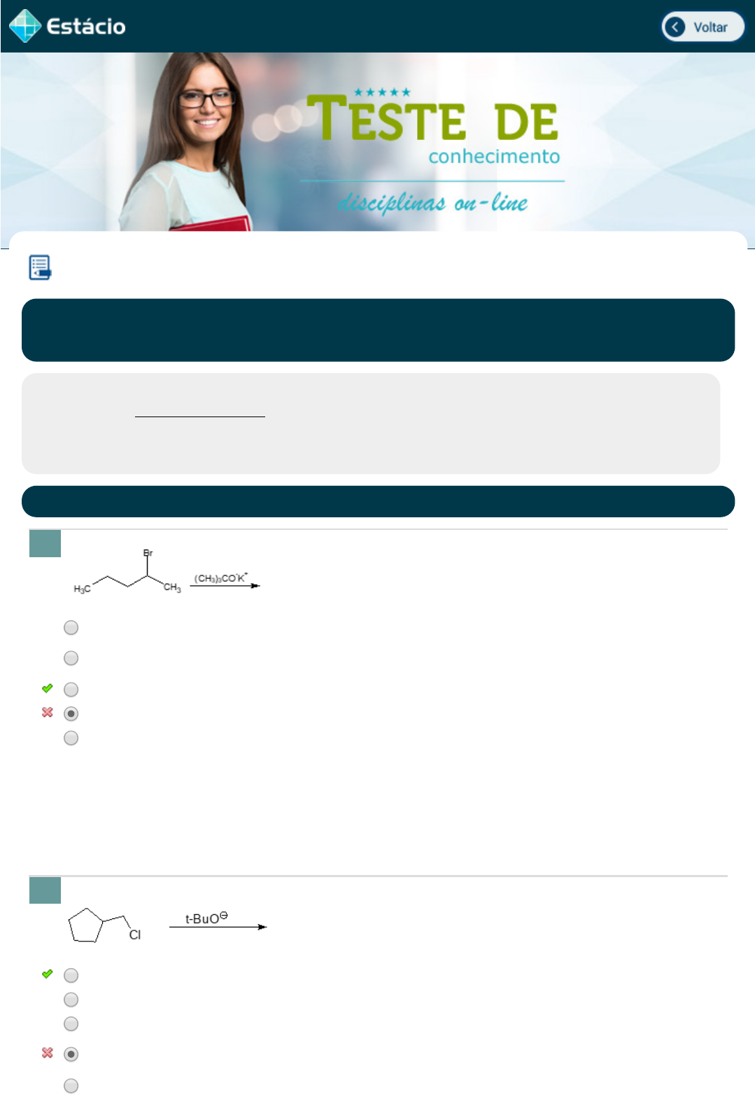 Considerando a reação abaixo ocorre a 60º C podemos afirmar que o principal produto formado será: Observe a reação abaixo e assinale a alternativa correta. QUÍMICA ORGÂNICA APLICADA À FARMÁCIA JOSIVALDO SOUZA SOARES 201909011096 QUI.ORG.APLI.FARMA 2021.1 - F (G) / EX Prezado (a) Aluno(a), Você fará agora seu TESTE DE CONHECIMENTO! Lembre-se que este exercício é opcional, mas não valerá ponto para sua avaliação. O mesmo será composto de questões de múltipla escolha. Após responde cada questão, você terá acesso ao gabarito comentado e/ou à explicação da mesma. Aproveite para se familiarizar com este modelo de questões que será usado na sua AV e AVS. HALETOS DE ALQUILA: REAÇÕES E SUBSTITUIÇÃO E ELIMINAÇÃO 1. (E)-2-penteno, produto da Regra de Zaitsev. 2-penteno, produto da Regra de Zaitsev. 1-penteno, produto da Regra de Hofmann. 2-penteno, produto da Regra de Hofmann. 1-penteno, produto da Regra de Zaitsev. Explicação: 1-penteno, produto da Regra de Hofmann. 2. Nesta reação forma-se preferencialmente o produto de eliminação devido ao impedimento estérico. Cloretos de alquila não reagem por eliminação 1,2. A base forte e volumosa não é capaz de reagir com um haleto primário. O mecanismo SN1 é favorecido neste cloreto terciário. O nucleófilo volumoso favorece a reação de substituição nucleofílica. . javascript:voltar(); javascript:voltar(); Considerando as reações que acontecem compostos aromáticos e a estabilidade desses compostos, podemos afirmar: Os benzodiazepínicos, fármacos depressores do sistema nervoso central, podem ser utilizados como anticonvulsivantes, anestésicos, hipnóticos e ansiolíticos. Uma das etapas da síntese clássica de benzodiazepínicos envolve a reação de anilinas substituídas com cloreto de α-cloro- acetila, conforme o esquema a seguir: Analisando os produtos acima, podemos afirmar que o produto principal formado nessa etapa é: Explicação: A resposta correta é: Nesta reação forma-se preferencialmente o produto de eliminação devido ao impedimento estérico. COMPOSTOS AROMÁTICOS: CARACTERÍSTICAS E REAÇÕES 3. Compostos aromáticos só reagem por redução ou oxidação. Compostos aromáticos reagem tanto por substituição quanto por adição eletrofílca. Compostos aromáticos são instáveis e pouco reativos, sendo inertes. Compostos aromáticos reagem por substituição eletrofílica e não por adição eletrofílica, como acontece nos compostos insaturados, alcenos e alcinos . Compostos aromáticos só reagem por adição eletrofílica. Explicação: A resposta correta é: Compostos aromáticos reagem por substituição eletrofílica e não por adição eletrofílica, como acontece nos compostos insaturados, alcenos e alcinos . 4. Uma mistura dos produtos III e IV. O produto II, formado por uma reação de substituição nucleofílica muito usada para alterar a reatividade da amina. O produto I, formado por uma reação de substituição nucleofílica no carbono sp2. O produto IV, que é um isômero de II, porém deve predominar porque o grupo amino é orto- orientador. O produto II, formado por uma reação de substituição eletrofílica aromática (acilação de Friedel- Reações de halogenação alfa à carbonila são extremamente úteis, pois fornecem intermediários para outros tipos de reação. É o caso da bromação alfa, exemplo, no qual o átomo de bromo pode ser perdido na forma de HBr e levar à formação de um composto α,β-insaturados. Um estagiário, interessado em entender melhor essas reações, promoveu uma série de halogenações utilizando tanto catálise ácida quanto catálise básica e variando os halogênios moleculares (Cl2, Br2 e I2). O que ele observou é que a mudança dos halogênios não alterava a velocidade da reação em nenhum dos dois tipos de catálise. Assinale a alternativa que apresenta uma justificativa para essa observação: Reações de oxidação e redução são importantes pois permitem a interconversão de grupos funcionais. Analise as afirmativas a seguir sobre as reações de oxidação e redução: I - A redução de uma cetona utilizando composto de Grignard levará à formação de um álcool secundário. II - A oxidação de um aldeído a ácido carboxílico depende da formação do diol gem, ou seja, não pode ser realizada em meio anidro. III - Na oxidação de Baeyer-Villiger é possível oxidar cetonas através do uso de perácidos ou uma combinação de água oxigenada e um ácido de Lewis. IV - As reduções por hidreto podem ser feitas utilizando tanto o hidreto de alumínio e lítio quanto borohidreto de sódio, porém o segundo é preferido pois não reage violentamente com a água. Indique a base ideal para ser utilizada em cada reação abaixo: Crafts). Explicação: A resposta correta é: O produto II, formado por uma reação de substituição nucleofílica muito usada para alterar a reatividade da amina. ALDEÍDOS E CETONAS: CARACTERÍSTICAS E REAÇÕES DE ADIÇÃO NUCLEOFÍLICA 5. A etapa lenta da reação é a ruptura homolítica da ligação entre os halogênios e a velocidade com que ela acontece é a mesma em todos os casos. O único halogênio que afetaria a velocidade da reação é o flúor, mas como ele não foi utilizado durante as halogenações, não foi possível perceber a diferença. Cloro, bromo e iodo em suas formas moleculares não são capazes de reagir com aldeídos e cetonas, apenas os ácidos HCl, HBr e HI seriam capazes de alterar a velocidade da reação. A catálise ácida forma o ácido com o halogênio e todos os ácidos reagem da mesma forma com o aldeído ou cetona. Tanto na catálise ácida quanto na catálise básica, a etapa lenta, determinante da velocidade da reação, é a formação do intermediário enol ou enolato. Explicação: A resposta correta é: Tanto na catálise ácida quanto na catálise básica, a etapa lenta, determinante da velocidade da reação, é a formação 