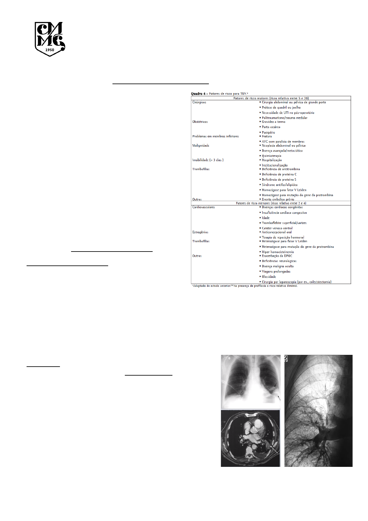 FACULDADE CIÊNCIAS MÉDICAS DE MINAS GERAIS CLÍNICA MÉDICA III | PNEUMOLOGIA GABRIELA PICCHIONI BAÊTA - 68A TEV - Tromboembolismo Venoso O termo tromboembolismo venoso (TEV) inclui duas condições frequentes, que são a trombose venosa profunda (TVP) e o tromboembolismo pulmonar (TEP), sendo esta a causa de morte evitável mais comum no paciente hospitalizado. Existe a formação de um trombo, que se deslocam e após caírem na circulação sanguínea (em geral de panturrilha, coxa → VCI → AD → VD → pulmão) atingem algum vaso pulmonar, em que o tecido distal ao vaso entra em sofrimento isquêmico, mas devido à circulação dupla (aa. brônquicas) não existe a necrose do tecido. Decorre de condições que comprometem o retorno venoso, acarretando disfunção ou lesão endotelial ou provocando hipercoagulabilidade. A incidência da TEV aumenta exponencialmente a partir de 40 anos de idade, e tem quase 200 casos por dia no Brasil. Fatores de Risco para TEV → Síndromes Clínicas da TEP: Sindrome do Colapso Circulatório: associado a TEP maciço (trombo de grandes proporções) e ocorre em 10% dos pacientes. Evolui com choque, confusão mental e arritmia cardíaca. Síndrome do Infarto ou Hemorragia Pulmonar: associada à TEP submaciço, ocorre em 60% dos casos, apresentando dor torácica, dispneia com ou sem hemoptise Síndrome da Embolia Não Complicada: é associada a trombos pequenos (30% dos casos) e tem quadro clínico incaracterístico, sem dor, apenas com presença de dispneia. Diagnóstico: tríade → dispneia, taquipneia e dor torácica. O primeiro exame a ser pedido é o RX DE TÓRAX, que apresenta alterações em mais de 80% dos casos. Dentre os achados estão: elevação do diafragma, atelectasias laminares, derrame pleural e consolidações. - Sinal de Hampton (imagem 1): trata-se de área isquêmica na periferia do pulmão, gerando imagem em cunha no parênquima do pulmão, cuja a sua base está voltada para a parte periférica do mesmo, enquanto a sua ponta é localizada em direção ao centro do pulmão. Consolidação em cunha. - Sinal de Westermark (imagem 2): oligoemia focal: diminuição do volume de sangue para aquela determinada região do pulmão. Ocorre nos segmentos pulmonares, que estão mal perfundidos, devido à obstrução de alguns ramos segmentares ou lobares da artéria pulmonar. Se apresenta como uma hipertransparência. FACULDADE CIÊNCIAS MÉDICAS DE MINAS GERAIS CLÍNICA MÉDICA III | PNEUMOLOGIA GABRIELA PICCHIONI BAÊTA - 68A Eletrocardiograma: pode sofrer alteração que indica sobrecarga aguda de ventrículo direito, mas isso ocorre em menos de 10% dos casos (onda S em D1, onda Q em d3, e onda T invertida em D3) Cintilografia Pulmonar V/Q: avalia a presença de alterações na passagem do ar ou na circulação de sangue aos pulmões, sendo feito em 2 etapas, chamadas de inalação, também conhecida como ventilação, ou perfusão. Para a realização do exame é necessária a utilização de um medicamento com capacidades radioativas, como Tecnécio 99m ou Gálio 67. É necessário que a Cintilografia seja feita precocemente. - TEP: não tem perfusão e tem ventilação - PNM (diag. dif): tem perfusão e não tem ventilação Dímero D: é um subproduto da fibrinólise e a elevação dos seus níveis sugere existência e lise recente de trombos. Está elevado em condições como TEP, TVP, IAM, AVC, CID...A sensibilidade (alta) e especificidade (baixa) dos testes de dímero D são variáveis; no entanto, a maioria é sensível e não específica. É instrumento de exclusão de TEP Arteriografia Pulmonar (ERA padrão ouro): exame de alto custo, que utiliza contraste diretamente no tronco da artéria pulmonar. É necessário realizar cateterismo e a presença com um hemodinamicista AngioTC (padrão ouro): é realizado com contraste em veia periférica, sem o uso de cateterismo. Vê-se derrames, defeitos de enchimento entre outros. Faz diagnóstico em artérias de calibres diversos. QUANDO INDICAR CINTILOGRAFIA NO LUGAR DA TC: risco de reação ao contraste, preocupação com a radiação em mulheres (ca. mama), insuficiência renal. Alterações Hemodinâmicas: um êmbolo entope um ramo na artéria → libera mediadores → aumenta a RVP → aumento da PA pulmonar → aumento da pós carga do VD → dilatação e disfunção sistólica do VD → regurgitação tricúspide e desvio do septo IV p/ esquerda. Os achados em vermelho podem ser encontrados no ECO. Após as alterações supracitadas ocorre uma disfunção no VD diminuindo a pré-carga e enchimento no VE → diminui o volume de ejeção do VE → diminui o débito cardíaco causando hipotensão sistêmica/choque. Algoritmo de manejo: pacientes hemodinamicamente estáveis FACULDADE CIÊNCIAS MÉDICAS DE MINAS GERAIS CLÍNICA MÉDICA III | PNEUMOLOGIA GABRIELA PICCHIONI BAÊTA - 68A Tratamento Anticoagulante: HFN e HBPM - A heparina interage com a antitrombina no sentido de inibir fatores de coagulação (2A e 10A). Esta interação aumenta em mais de 1000 vezes a atividade intrínseca da antitrombina. Pode-se reverter o efeito da heparina através da administração de um antídoto, chamado protamina. - Essa reação é determinada por um pentassacarídeo com alta afinidade de ligação com à AT3 contido em cerca de ⅓ das moléculas de heparina . Os ⅔ restantes têm mínima atividade anticoagulante nas concentrações terapêuticas usuais. - A inibição do 10A necessita apenas do pentassacaride e do 2A >18 sacárides Posologia heparina de baixo peso molecular para TEP - Enoxaparina (Clexane) → 1 mg/kg/dia 12-12 horas ou 1,5 mg/kg/dia de 24-24 horas subcutâneo - Dalteparina (Fragmin) → 200UI/kg/dia ou 100UI//kg/dia de 12-12 horas subcutâneo Anticoagulante oral Warfarina: age inibindo a síntese dos fatores da coagulação dependentes da vit. K (II, VII, IX e X). Seu efeito surge apenas após o desaparecimento da circulação dos fatores já previamente sintetizados, 