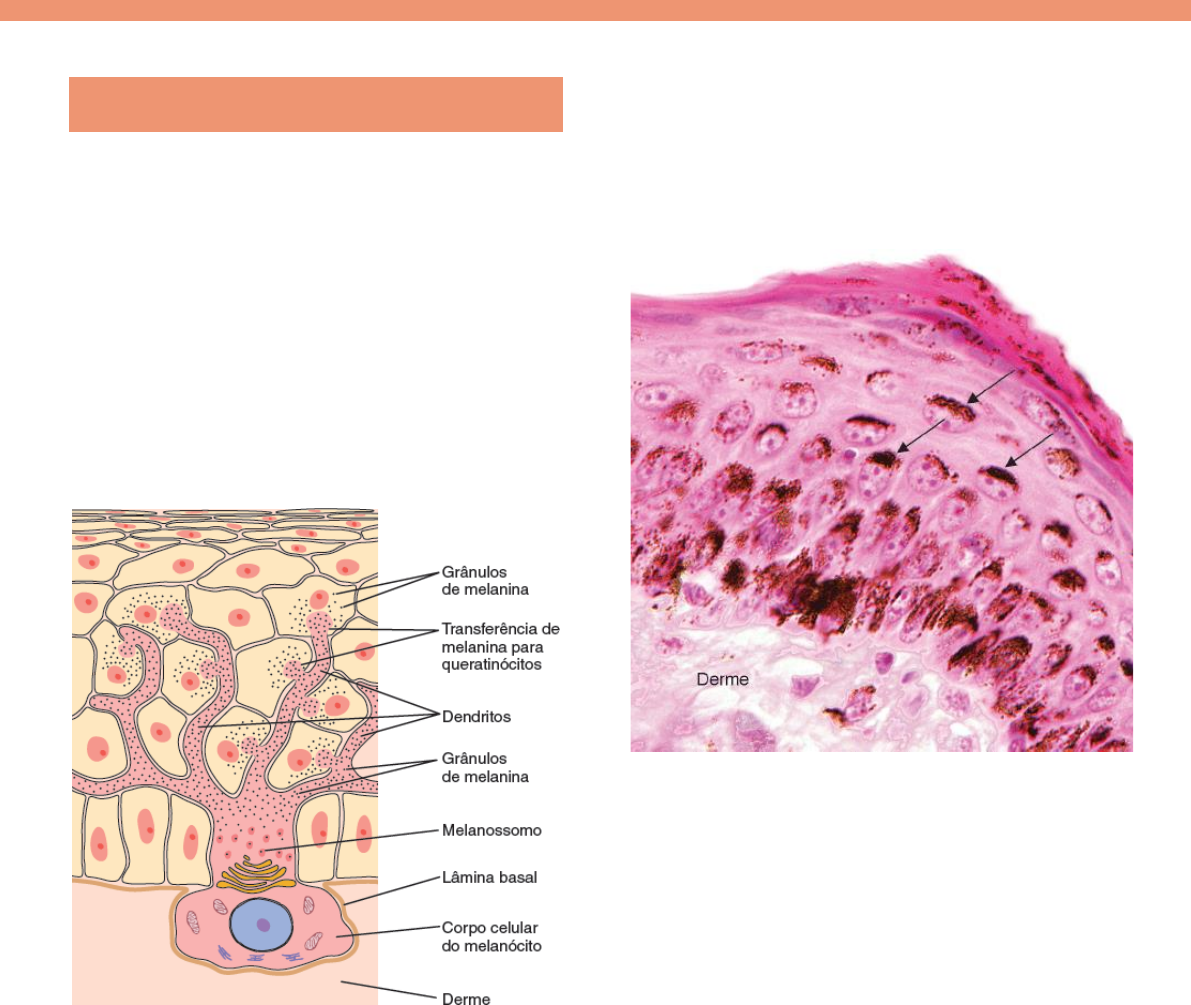 Melanócitos e Pigmentação da Pele Melanócitos Durante a vida intrauterina, precursores dos melanócitos denominados melanoblastos originam-se na crista neural, mediante sinalização celular que induz um perfil de expressão gênica específica. As células da crista neural passam por várias etapas de transformação sob influência do microambiente em que se encontram, havendo mudança no perfil de expressão gênica de proteínas intracelulares. Se diferenciam em melanoblastos precursores, posteriormente em melanoblastos migratórios. Esses melanoblastos migratórios migram para a epiderme em formação. Os melanócitos são células grandes, esféricas e situadas abaixo do estrato basal. Apresentam numerosas pequenas mitocôndrias, com complexo de Golgi bem desenvolvido e retículo endoplasmático rugoso com cisternas curtas. Emitem prolongamentos que se dispõem entre as células dos estratos basal e espinhoso, prolongamentos também denominados dendritos, embora nada tenham a ver com os dendritos de neurônios. Além da pele há melanócitos em mucosas, na coroide e retina do olho, e no cérebro. Estão localizados na camada basal do epitélio e na região do bulbo no folículo piloso. As células do bulge, enquanto células tronco, podem formar tanto queratinócitos quanto melanócitos. Se analisarmos a pele quanto à quantidade dos melanócitos, temos 1 melanócito interagindo com 5 a 6 queratinócitos por mm2 de pele. Isso significa que temos cerca de 3 bilhões de melanócitos por indivíduo. Esse tipo celular se divide pouco, entre uma a duas vezes por ano. Acúmulo de grânulos de melanina na camada basal, nos queratinócitos. Os grânulos de melanina são produzidos pelos melanócitos e transferidos para os queratinócitos através dos dendritos do melanócito. A região de contato entre o melanócito com seus 5 a 10 queratinócitos adjacentes se chama unidade epidérmico-melânica. Em corte histológico corado com HE, o citoplasma dos melanócitos se apresenta bem claro – isso porque essas células produzem a melanina, acumulam a melanina nas extremidades das estruturas dendríticas (extensões citoplasmáticas) e transferem os grânulos de melanina para as células adjacentes. Os grânulos de melanina são transferidos principalmente para a região próxima ao núcleo dos queratinócitos, com o objetivo de proteger estes contra radiações mutagênicas UV. Formação do melanossomo A melanina é sintetizada dentro de vesículas denominadas de melanossomos. O processo se inicia com a captação de tirosina pelos melanócitos e também pela síntese de uma enzima fundamental para esse processo, a tirosinase. Essa enzima é produzida no RER, processada no CG e se acumula em uma vesícula arredondada com uma fina matriz contendo várias proteínas. Essas vesículas são os melanossomos estágio 1. Posteriormente, inicia-se a síntese de melanina. Nesse estágio 2, a vesícula se encontra mais ovóide e a matriz mais organizada em filamentos paralelos nos quais a melanina é polimerizada e depositada. Por fim, com a melanina acumulada nos filamentos paralelos, temos o melanossomos estágio 3. Depois, um grânulo de melanina maduro perde a atividade da tirosinase e de outras enzimas no interior dos melanossomos e tem sua matriz completamente preenchida por melanina, o que corresponde a um melanossomo no estágio 4. Os melanócitos produzem o pigmento melanina a partir do aminoácido tirosina. Pela enzima tirosinase, a tirosina é inicialmente transformada em 3,4-di- hidroxifenilalanina (Dopa). Esta, em seguida, passa por outras modificações e dá origem às duas formas de melanina encontradas na pele, chamadas eumelanina e feomelanina. A primeira resulta em uma coloração mais escura da pele e dos pelos, e a segunda, em coloração mais clara e/ou avermelhada. O transporte dos grânulos de melanina é realizado através da interação entre várias moléculas do citoesqueleto (como microtúbulos) com os melanossomos. Dentro dos queratinócitos eles também se movimentam por sistemas muito semelhantes ao sistema de transporte do melanócito. Nas suas extremidades, os melanossomos provavelmente se destacam e são de alguma maneira transferidos aos queratinócitos (é possível que estes fagocitem os melanossomos), os quais incorporam a seu citoplasma os melanossomos e a melanina neles contida. Os grânulos de melanina, dispostos próximos ao núcleo dos queratinócitos, se encontram contra a direção da incidência da luz do sol, justamente para proteger o núcleo celular da radiação ultravioleta. A radiação UVA está relacionada ao envelhecimento da pele, enquanto a radiação UVB está relacionado com a queimadura de pele, além do aumento do risco para o desenvolvimento de alguns tipos de câncer como o melanoma e o carcinoma baso- celular. Síntese de melanina A tirosina que é captada pelos melanócitos sofre inicialmente uma ação da tirosinase, originando uma DOPA. A DOPA sofre novamente a ação de uma tirosinase, formando DOPA quinona. A DOPA quinona pode seguir por dois caminhos: O caminho esquerdo pode levar à formação da chamada eumelanina (em duas formas, a preta e a marrom). Na via do lado direito, a DOPA quinona pode formar um outro pigmento chamado de feomelanina que pode ir de um espectro desde o amarelo até o vermelho. Cor da pele Os fatores mais importantes para determinar a cor da pele nos seres humanos são: 1. Conteúdo de melanina e caroteno nos queratinócitos da epiderme. 2. Número de vasos sanguíneos presentes na derme. A variação da cor na pele não ocorre por conta do número de melanócitos, pois todos os indivíduos, brancos ou pretos, possuem praticamente o mesmo número de melanócitos. Entretanto, o número de melanócitos varia nas diferentes regiões da pele, e essas diferenças podem ocorrer principalmente por variação na atividade da enzima tirosinase em cada região do corpo, fazendo com que hajam diferentes conteúdos