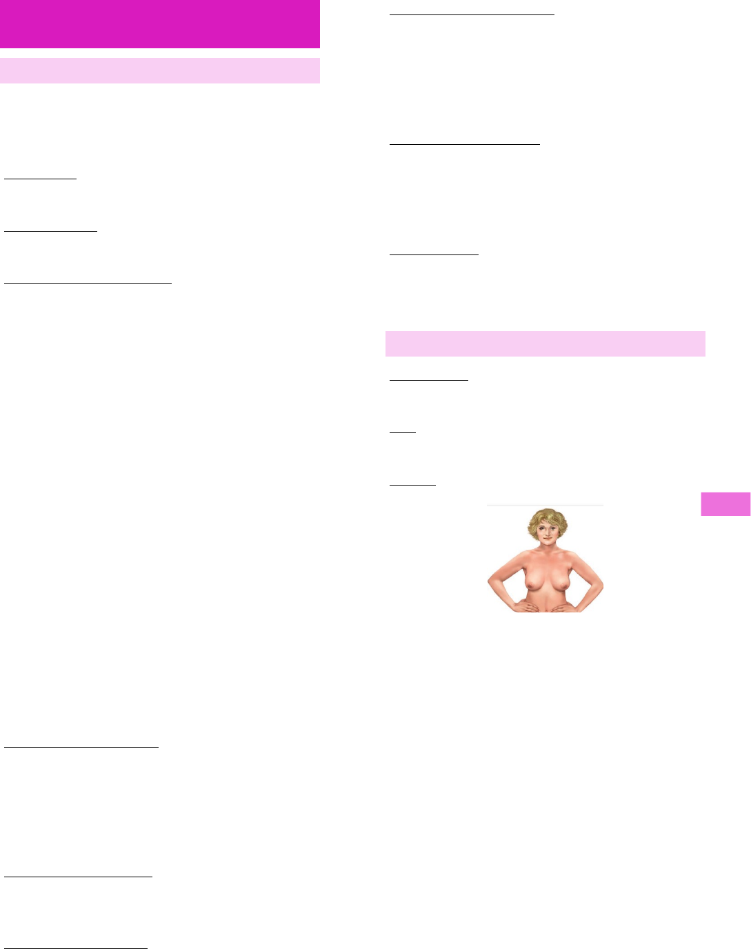 Keyse Mirelle – 5° Período Saúde da Mulher- 09/02/2021 2 Atendimento em um consultório ginecológico anamnese 1ª consulta ginecológica: 13-15 anos, porque é geralmente quando a paciente está no período da primeira menstruação (=menarca). Identificação: nome, idade, raça/cor, escolaridade, profissão, religião. Queixa principal: por que a paciente foi procurar um consultório ginecológico. História da moléstia atual: aprofundar a queixa principal, abaixo tem os principais sintomas que são abordados na ginecologia: - Corrimento vaginal: consistência, cor, com ou sem odor fétido, prurido, hiperemia vulvar. - Sangramento: fluxo, duração, fora do período menstrual. Obs: Procurar identificar se é um sangramento normal ou um sangramento uterino anormal. - Anticoncepção: qual tipo de contraceptivo que utiliza, se deseja um novo contraceptivo, efeitos colaterais, tempo de uso. - Dor pélvica: cíclica ou acíclica, incapacitante, caráter da dor, associada com dispareunia, com a defecação ou ao urinar. - Sintomas urinários: disúria, polaciúria, sensação de peso na vagina, sensação de “bola” na vagina, incontinência urinária associada ou não ao esforço físico, urgeincontinência. Interrogatório sistemático: outros sintomas, de outras localidades do corpo, que tenham ou não relação com a história da moléstia atual. Exemplo: constipação crônica, se tem diarreia no período menstrual. Devemos relacionar e conhecer tanto o trato urinário da paciente quanto o gastrointestinal. Antecedentes pessoais: comorbidades, alergias, cirurgias prévias, internamentos prévios, uso de medicamentos contínuo. Antecedentes familiares: pai, mãe, avós, irmãos, filhos ou algum parente de primeiro grau com alguma comorbidade. Não esquecer do câncer de mama. Antecedentes ginecológicos: menarca, data da última menstruação, ciclos menstruais (fluxo, duração), coitarca, quantidade de parceiros sexuais, vida sexual ativa, passado de doenças sexualmente transmissíveis, uso de condom (=camisinha), uso de algum método contraceptivo, terapia de reposição hormonal. Antecedentes obstétricos: quantas gestações, quantos partos e abortos. Houve alguma intercorrência durante o período da gestação. Procurar saber se teve pré-eclâmpsia, pois futuramente essa paciente provavelmente pode desenvolver HAS gestacional. Hábitos de vida: tabagismo (anos/maço, tipo de fumo), etilismo (qual tipo de bebida e quantas vezes na semana que bebe) e atividade física (qual atividade física, duração e quantas vezes na semana). exame físico Dados vitais: pressão arterial, frequência cardíaca, saturação de oxigênio e temperatura. Obs: Paciente com DIP pode ter uma temperatura elevada e apresentar febre. Mamas: Inspeção: estática e dinâmica: *Paciente sentada na beira do leito com as mãos apoiadas na cintura ou nos quadris e com os músculos peitorais flexionados. Estática: acentua a assimetria. Outros achados: eritema, retração, edema. *Ex: bem implantadas, simétricas, com volume: pequeno, médio ou grande volume. Mamas cônicas ou pendulares. Complexo aréolo-mamilar sem lesões e de coloração compatível com biotipo, mamilos extrusos ou intrusos. Dinâmica: movimentação dos braços para lateral (abrir e fechar) ausência de abaulamentos e retrações. Mamas - Palpação: Palpação dos linfonodos axilares, supraclaviculares e infraclaviculares. Paciente sentada com os braços apoiados no examinador. Mãos do examinador: desliza do ápice para a parte inferior da axila. Exame (como descrever): linfonodos não palpáveis OU linfonodos palpáveis, móveis ou aderidos aos planos profundos, descrever o tamanho, consistência fibroelástica, fibro-resistente, endurecido, Mamas: Palpação: mulher na posição supina, com uma das mãos acima da cabeça, para estirar o tecido da mama. Movimentos contínuos e circulares com palpação superficial e profunda. Mama direita e esquerda, dividir em quadrantes, distância da aréola e tamanho. Nódulo endurecido, amolecido, móvel, aderido aos planos profundos, tamanho, localização. Descrever a alteração no exame físico (PRIMEIRA IMAGEM): temos um nódulo, dividindo a mama em quatro quadrantes, no quadrante superior medial de aproximadamente 2 cm com distâncida de 6 cm da aréola. Além disso vamos acrescentar se é aderida ou não aos planos profundos, se são ou não móveis, a sua consistencia se é endurecida, fibroelastica ou fibroresistente. (SEGUNDA IMAGEM): No quadrante medial tem uma lesão, em contato com a aréola, pode descrever que é uma lesão ulcerada, podemos também colocar como feridas com bordas regulares, sugerindo pontos de necrose. Exame ginecológico Genitália: Inspeção: Monte de Vênus trófico ou hipotrófico (nas idosas), vulva tricotomizada ou com pilificação ginecóide ou andróide; coaptada, entreaberta, com formações labiais simétricas, sem lesões perineais ou perianais, sem lesões interlabiais, vestíbulo róseo ou pálido ou hiperemiado, meato uretral tópico, hímen íntegro ou roto (caso paciente virgem, aqui termina o exame), ausência de descida de paredes vaginais à manobra de Valsalva. Vamos avaliar o monte de vênus, depois os grandes lábios, clítoris, meato uretral (se tem algum divertículo, se tem alguma alteração), hímen roto ou integro, se tem descida de parede nessa região, vemos se tem lesão na junção dos grandes lábios, descemos para o períneo e por último o reto. Descrição dessa lesão: nódulo em pequeno lábio direito de consistência amolecida ou endurecida, aderida ou não nos planos profundos, sugestivo de Bartolinite (está acumulado o líquido e consequentemente ainda inflama), pode também ser um cisto em lábio direito. OBS: Só colocaríamos glândula de Bartholin colapsada se já estivesse drenando, então significa que já rompeu a Bartolinite. Genitália: Exame especular: *Antes da inserção os lábios menores são sepa