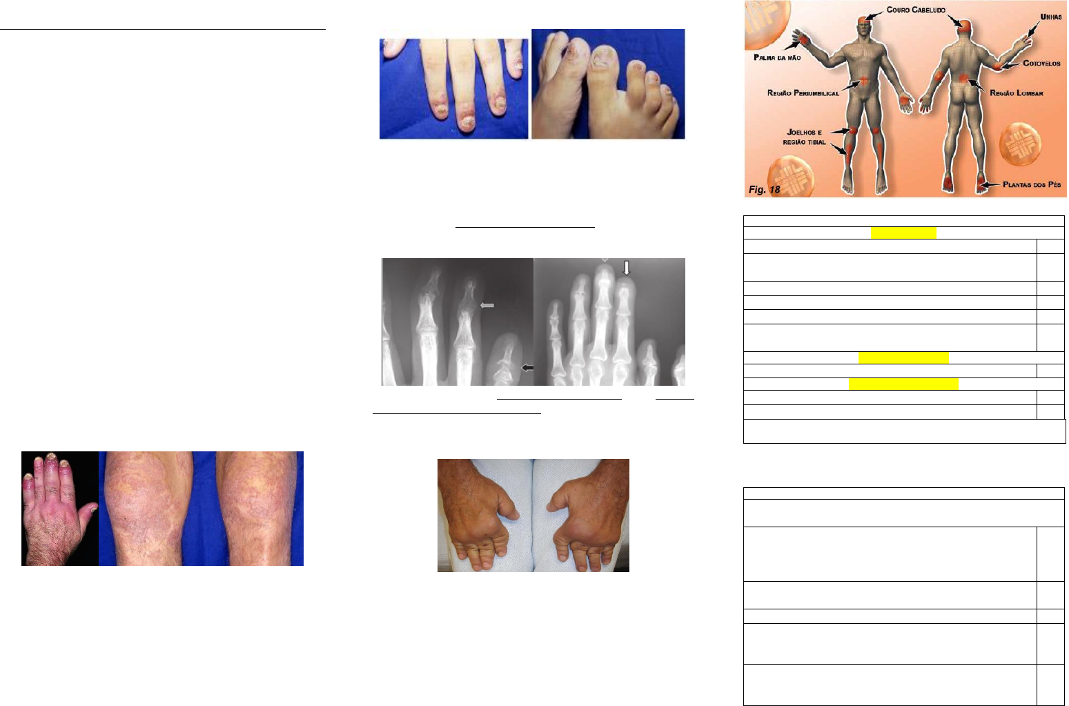 ARTRITE PSORIÁSICA Thayná Cerqueira Silveira A artrite psoriásica é uma artropatia inflamatória crônica que afeta entre 4-30% dos portadores de psoríase. Em cerca de 80% das vezes as lesões cutâneas da psoríase precedem o surgimento das manifestações articulares, mas é importante ter em mente que em 20% a artrite começa antes (até 2 anos antes) ou ao mesmo tempo em que as lesões cutâneas. De modo geral, a AP acomete portadores de psoríase cutânea grave, mas há casos em que acompanha casos leves e discretos. Não tem preferência por sexo, e em geral aparece na faixa etária entre 30-55 anos. A positividade do HLA-B27 se associa com a ocorrência de sacroileíte e envolvimento axial. A AP se expressa através de 5 padrões que podem coexistir num mesmo caso: ❖ Poliartrite periférica simétrica (lembra artrite reumatoide) É o padrão mais frequente, caracterizando-se por poliartrite simétrica de pequenas articulações de mãos + punho (exceto as IFD), sendo bastante semelhante a artrite reumatoide – mas menos articulações são acometidas. O fator reumatoide é tipicamente negativo. ❖ Oligoartrite periférica assimétrica (lembra artrite reativa) Se apresenta como uma oligoartrite assimétrica afetando as articulações do joelho, metatarsofalangianas e interfalangianas dos pés. A dactilite (dedo em salsicha) é o sinal mais característico deste tipo. ❖ Envolvimento das interfalangianas distais É considerado o padrão clássico da artrite psoriática, acometendo as IFD com distribuição assimétrica + lesões das unhas adjacentes. Existem cinco alterações que caracterizam as lesões ungueais da psoríase: ▪ Depressões puntiformes na placa ungueal – o famoso pitting ungueal ou “unha em dedal”; ▪ Cristas horizontais; ▪ Onicólise ou “unhas quebradiças”; ▪ Pigmentação amarelada nas bordas; ▪ Hiperceratose distrófica. ❖ Artrite mutilante Caracteriza-se por uma poliartrite periférica destrutiva predominando em mãos e pés + intensa osteólise. O RX demonstra a deformidade em ponta de lápis na qual as falanges se tornam pontiagudas devido a dissolução subperiosteal irregular do tecido ósseo. Casos avançados incluem a deformidade em telescópio ou em binóculo de teatro (engavetamento dos dedos) que cursam com destruição quase completa das falanges e consequente encurtamento dos dedos, o que resulta na formação de dobras na pele periarticular. O examinador consegue “esticar” o dedo do paciente até sua posição original. ❖ Envolvimento axial (lembra espondilite anquilosante) Acomete apenas 5% dos pacientes, com alterações assimétricas e aleatórias. Os sindesmófitos aparecem apenas em uma das margens laterais dos discos intervertebrais e em qualquer nível, sem obedecer a uma progressão ascendente. O grau de comprometimento vertebral é, em geral, menor que na espondilite anquilosante. O HLA-B27 é encontrado em 50% desses doentes. CRITÉRIOS DE FOURNIÉ SINAIS CLÍNICOS Psoríase anterior ou concomitante ao início do reumatismo 6 Psoríase familiar na ausência de psoríase pessoal ou psoríase posterior ao início do reumatismo 3 Artrite de uma IFD 3 Acometimento cérvico-dorsal 3 Mono ou oligoartrite assimertrica 1 Dor inflamatória em calcanhares, nádegas, esterno costo clavicular ou entesalgias difusas sensíveis aos AINE 1 SINAIS RADIOLÓGICOS ≥1 dos critérios de Avila 5 CRITÉRIOS LABORATORIAIS + HLA B16 (38,39) ou B17 4 Ausência fator reumatoide 4 Se a soma dos pontos é ≥11, o paciente será classificado como portador de AP A AMB sugere a utilização dos critérios CASPAR: CRITÉRIOS CASPAR Paciente tem de ter doença inflamatória articular (periférica, axial ou entesitica) + ≥3 pontos nas categorias a seguir: Evidencia de psoríase: Atual História pessoal História familiar 2 1 1 Distrofia ungueal psoriásica: Depressões puntiformes, onicólise, hiperceratose 1 Fator reumatoide negativo 1 Dactilite: Inflamação atual de 1 dedo em sua totalidade História de dactilite 1 1 Evidencia radiológica de neoformação óssea justa-articular: Ossificação bem definida próxima ás margens articulares á radiografia simples de mãos e pés 1 ACHADOS LABORATORIAIS E RADIOGRÁFICOS A VHS costuma estar elevada na artrite psoriásica. A hiperuricemia é outro achado frequente, principalmente na vigência de psoríase extensa (devido ao alto turnover das células cutâneas há um aumento na síntese e degradação de ácidos nucleicos, o que faz aumentar a produção endógena de ácido úrico). Uma descamação cutânea acentuada pode espoliar os estoques corporais de ferro e ácido fólico, os quais, portanto, devem sempre ser avaliados e repostos quando necessário. Os principais achados radiográficos típicos da artrite psoriásica são: 1. Erosões ósseas marginais, progressivas e irregulares, que nas falanges promovem a já citada “deformidade em ponta de lápis” ̶ mas que podem aparecer em diversos outros ossos, incluindo as diáfises de ossos mais longos e os próprios corpos vertebrais; 2. Reação periosteal de neoproliferação óssea “felpuda”, o que aparece principalmente nos sítios de inserção óssea das ênteses e tendões musculares. No que tange ao acometimento axial, não podemos esquecer que o mesmo se dá de forma bem diferente da espondilite anquilosante, ou seja, a sacroileíte da artrite psoriásica é assimétrica, assim como o surgimento de sindesmófitos entre os corpos vertebrais, que inclusive aparecem de maneira randômica e em menor quantidade do que na EA. TRATAMENTO – PORTARIA 26º/2018 O tratamento medicamentoso da AP inclui AINE, glicocorticoides e medicamentos modificadores do curso da doença (MMCD) – sulfassalazina, metotrexato, leflunomida, ciclosporina e agentes biológicos anti-TNF-alfa. ❖ AP periférica (artrite, entesite ou dactilite) Medidas não medicamentosas + AINE ↓ (1 mês) Substituir por outro AINE ou Glicocorticoide 1 ↓ (2 m