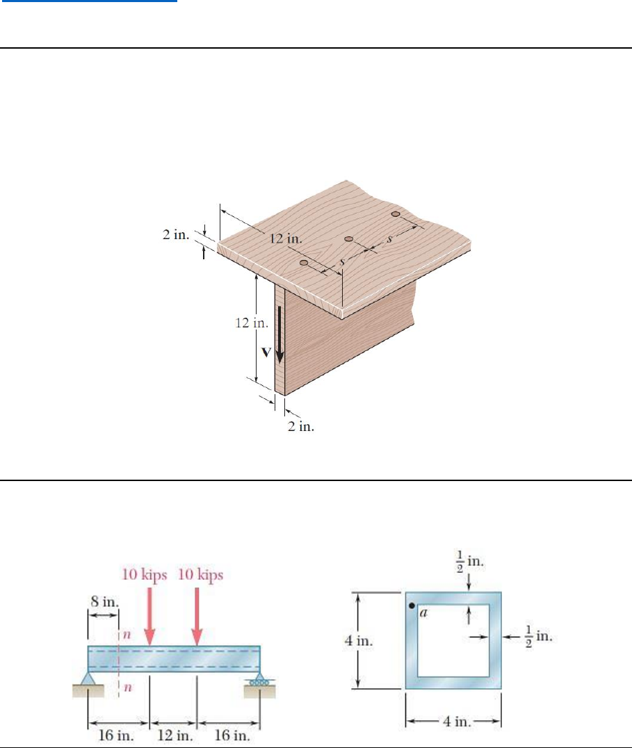 Homework #3 Delivery Time: 1399/03/01; Thursday Saeed_7799@yahoo.com (ای تعلق نخواهد گرفت.نمره ،ارسال شوندشده دقت شود به تمارینی که بعد از تاریخ معین ) 1. The T-beam is nailed together as shown. If the nails can each support a shear force of 950 lb, determine the maximum shear force V that the beam can support and the corresponding maximum nail spacing s to the nearest 1/8 in. The allowable shear stress for the wood is 450allow psi 2. For the beam and loading shown, consider section n-n and determine (a) the largest shearing stress in that section, (b) the shearing stress at point a. 3. If the wide-flange beam is subjected to a shear of V = 20 kN, determine the maximum shear stress in the beam. mailto:Saeed_7799@yahoo.com 4. The shaft is supported by a smooth thrust bearing at A and a smooth journal bearing at B. If P = 20 kN, determine the absolute maximum shear stress in the shaft. 5. A beam is constructed from three boards bolted together as shown. Determine the shear force developed in each bolt if the bolts are spaced s=250 mm apart and the applied shear is V=35 KN. 6. If the wide-flange beam is subjected to a shear of V = 30 kN, determine the shear force resisted by the web of the beam. Set w = 200 mm. 7. The simply supported beam is built-up from three boards by nailing them together as shown. If p=12 kN, determine the maximum allowable spacing s of the nails to support that load, if each nail can resist a shear force of 1.5 kN.