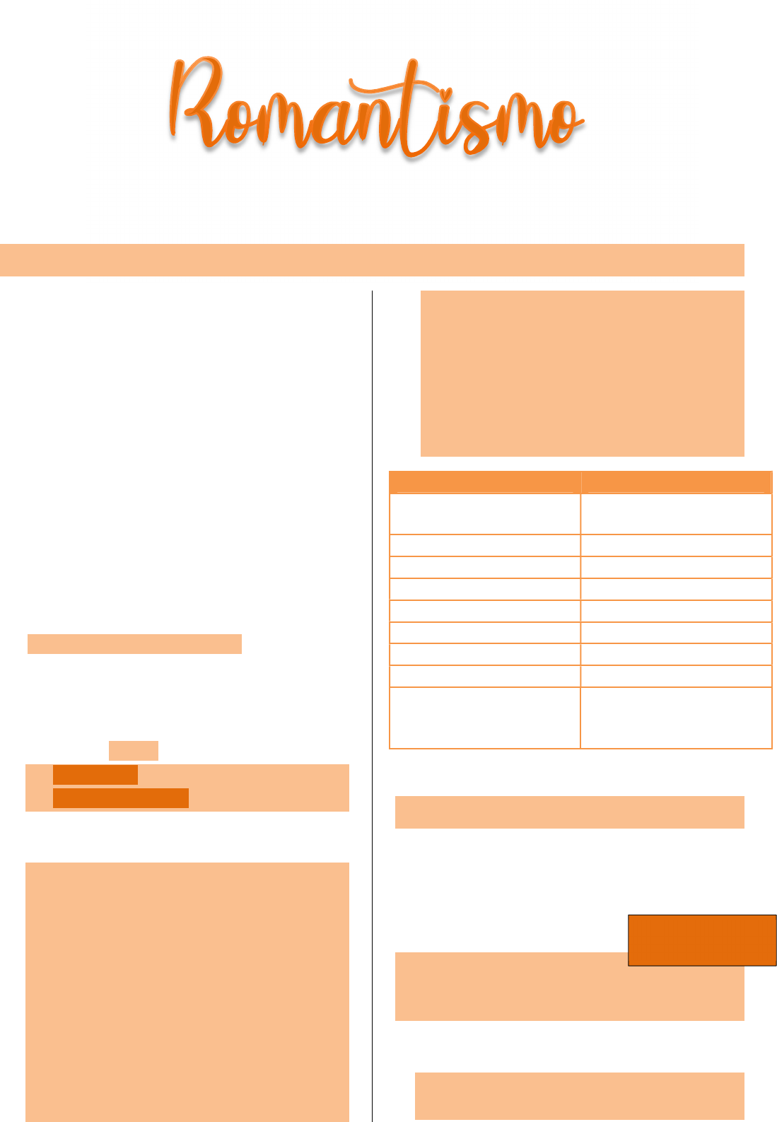 Contexto Histórico CONTEXTO HISTÓRICO Surgimento na Europa, no séc.XVIII, indo até meados do séc. XIX. Influenciou a Literatura, a Pintura, a Música e a Arquitetura. Movimento de oposição ao Classicismo, ao Racionalismo e ao Iluminismo. Romantismo no Brasil: final de séc. XVIII. Início na Europa → Bases do sentimentalismo romântico e do escapismo pelo suicídio estabelecido pelo romance. Os sofrimentos do Jovem Werther, de Goethe (1774). → Inglaterra: Início de séc. XIX – poesia ultrarromântica de Lord Byron e romance histórico Ivanhoé de Walter Scott. → Manon Lescut, de Prévost (1731). → História de Tom Joses, de Henry Fielding (1749). Principais características → Oposição ao modelo clássico; → Estrutura longa do texto em prosa; → Desenvolvimento de uma trama central; → Narrativa ampla refletindo uma sequência de tempo; → O indivíduo passa a ser o centro das atenções; → Surgimento de um público consumidor (origem nos folhetins); → Uso de versos livres e versos brancos na poesia; → Exaltação do Nacionalismo, da natureza e da pátria; → Idealização da sociedade, do amor e da mulher; → Criação de um herói nacional; → Sentimentalismo e supervalorização das emoções pessoais; → Subjetividade e Egocentrismo; → Saudades da infância; → Fuga da realidade; Romantismo Classicismo Ausência de modelo a ser seguido Segue um padrão clássico Individualismo universalidade Visão pessoal e subjetiva Visão impessoal e objetivo Resgate da Idade Média Antiguidade Clássica Cristianismo Paganismo Imaginação Inteligência Sensibilidade Razão Folclore Erudição Imagem sentimental e Subjetiva do homem e da Mulher Imagem racional do homem e da mulher Romantismo Brasil – Poesia 1ª geração: nacionalismo ou indianista → Período: de 1836 a 1852 → Construção de um herói nacional e exaltação da pátria, da natureza. Marco inicial: publicação de Suspiros Poéticos e Saudades (1836) de Gonçalves de Magalhães – responsável por trazer a 1ª geração romântica ao Brasil. Características → Exaltação da natureza e da liberdade; → Religiosidade; Valorização exagerada do índio. → Figura do índio ou indianismo; → Sentimentalismo, emoções; → Nacionalismo – ufanista; → Brasileirismo (linguagem próxima do coloquial) Gonçalves de Magalhães → Suspiros Poéticos e Saudades → Confederação dos Tamoios( poema épico) Gonçalves Dias → Natureza e saudade entrelaçadas; → Lamentações pelo amor impossível; → Anseios e inquietações dão um certo tom de lirismos amoroso; → Indianismo; Obra poética dividida em: lírica, medieval e nacionalista. 2ª geração: ultrarromântica → Arte totalmente voltada para o desapego ao nacionalismo. → Exacerbado sentimentalismo e pessimismo doentio como forma de escapar da realidade e dos problemas que assolavam a sociedade na época. Características → A temática pregada era a morte; → Sonho, devaneio; → Amor platônico; → Mulher era vista como uma figura inatingível, impalpável, vista mais no plano espiritual do que no material. → Visão negativa do mundo e da sociedade, expressão de pessimismo e sentimento de inadequação à realidade. → Os poetas viviam uma vida desregrada, dividida entre os estudos acadêmicos, o ócio, os casos amorosos e a leitura de obras literárias, como as de Lord Byro. → Principais poetas: Àlvares de Azevedo, Fagundes Varela, Casimiro de Abreu, Junqueira Freire 3ª geração: social, liberal ou condoreira Condoreirismo (referência à ave condor): os poetas dessa geração apresentam estilo grandioso ao tratarem de temas sociais. Comprometimento com causa abolicionista e republicana: poesia social. Principal nome: Castro Alves, “o poeta dos escravos” – Navio Negreiro. Final do Romantismo: processo de transição para o realismo. Romantismo Brasil – Prosa Verso (poesia) Prosa Maior liberdade espacial, linhas preenchidas irregularmente. Preenchimento regular das linhas, de uma margem à outra. Atenção: “romance romântico” não é pleonasmo! Trata- se de uma narrativa longa, produzida no Romantismo, com as características desse período. Início: Brasil – séc. XIX. Leitura de romances publicados em jornal capítulo a capítulo (folhetins). No Romantismo, prosa e poesia foram produzidas simultaneamente. A narrativa romântica é dividida em tipos de romances. Tipos de romances românticos: Indianista: nacionalismo, construção de identidade nacional, índio como elemento da formação do povo brasileiro. Exemplos: O Guarani e Iracema (José de Alencar) Histórico: passado mais recente, bandeiras, formação histórica do Brasil contada de maneira idealizada- exaltação de um herói nacional. Regionalista: interior do Brasil (ambiente, cotidiano), local de preservação dos tradicionais e legítimos valores brasileiros do séc. XIX. Exemplos: Inocência (Visconde de Taunay) e A Escrava Isaura, de Bernardo Guimarães. Urbano: histórias sobre a corte, painel social sobre a vida urbana do Rio de Janeiro. Prosa romântica brasileira Principal nome: José de Alencar 1º folhetim de sucesso: A moreninha, de Joaquim Manuel de Macedo. Machado de Assis, apesar de ser caracterizado como realista, teve sua fase romântica na juventude.