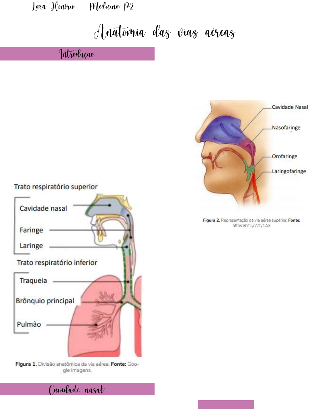 – Trocas gasosas para oxigenar o sangue; Componentes do SR participam também da fonação e percepção olfatória (Ex.: Agressão do COVID-19, anostomia – olfato e disgeusia – olfato); Divide-se em: 1. via aérea superior: fora da cavidade torácica, constituído por cavidade nasal, faringe e laringe; 2. via aérea inferior: traqueia, brônquios, bronquíolos e alvéolos; Pode ser classificado em porção condutora e respiratória Aquece, umidifica e filtra o ar, é uma barreira protetora e tem relação com a função olfatória. Faz parte do nariz junto a porção externa e os seios paranasais. É a primeira região da parte condutora das vias aéreas, comunicando a entrada de ar com a nasofaringe e posteriormente com as coanas. A mucosa dessa cavidade se divide em: 1. Terço superior: olfato; 2. Terços inferiores: via respiratória propriamente dita. Seus limites superiores consistem em ossos frontonasal, etmoidal e esfenoidal. Limites inferiores: processo palatino da maxila e lâmina horizontal do processo palatino. Lateralmente: conchas nasais (superior, inferior e média). Medial: septos nasais. Essa cavidade é dividida pelo septo nasal, constituído por uma cartilagem e, também por um osso, que são respectivamente, a lâmina perpendicular do osso etmoide e o vômer. Os meatos são formados pelas conchas nasais, essa estrutura é responsável pelo turbilhonamento de ar com funções de aquecimento, umidificação e filtração do mesmo. As fossas nasais se comunicam com a faringe pelos cóanos, transportam ar para dentro e fora dos pulmões. Seios paranasais: Estruturas importantes para drenagem de muco para a cavidade nasal e são constituídas por ossos pneumáticos com a seguinte ordem de drenagem: a. Esfenoidal: drena para o recesso esfeno- etmoidal; – b. Frontal e maxilar: drenam para o meato nasal médio; c. Etmoidal: drena par ao meato nasal superior. Att.: Sinusite = O ar que passa pela cavidade nasal adentra os seios paranasais por meio dos óstios e estes podem ser acometidos por obstruções de cunho inflamatório ou infeccioso, provocando o aumento das secreções e o quadro de sinusite. O suprimento se dá de forma diferencial a depender da parede em que se irriga. Na parede medial e lateral, o suprimento arterial acontece da seguinte forma: - Artéria Etmoidal anterior e posterior; - Artéria Esfenopalatina e palatina maior; - Ramo septal da artéria labial superior. Já a irrigação venosa é realizada pelo plexo venoso submucoso, que drena para as veias esfenopalatina, facial e oftálmica. Já a inervação na região posteroinferior é feita pelo nervo maxilar, nervo nasopalatino e palatino maior. A região anterossuperior é inervada pelo nervo oftálmico, nervos etmoidais anterior e posterior. Órgão tubular, pertence tanto ao SR quanto ao SD e conduz o ar para as vias aéreas inferiores, além de direcionar alimento para o esôfago na deglutição. Se divide em três partes: nasofarinse, orofaringe e laringolaringe. Seus limites anatômicos são: - Superior: base do crânio, no processo basilar do osso occiptal; - Inferior: cartilagem cricóide; - Posterior: C6. Nasofaringe: É a porção superior da faringe, a única em que só há passagem de ar , ela se comunica com a cavidade nasal pelas coanas e com o sistema auditivo por meio do óstio faríngeo da tuba auditiva. Suas funções envolvem: equilíbrio do gradiente de pressão entre a tuba auditiva e a faringe (através do óstio faríngeo da tuba auditiva) e conduz o ar para as vias aéreas. Orofaringe: Porção que se encontra entre o palato mole e a porção superior da glote, sendo limitada superiormente pelo palato mole, inferiormente pela base da língua e lateralmente pelo arco palatoglosso e palatofaríngeo. Encontram-se aqui as tonsilas palatinas. Att.: A tonsila faríngea é conhecida como adenoide junto as tonsilas palatinas e linguais formando o anel tonsilar da parte superior da faringe. Laringofaringe: Sua porção inferior se localiza entre a porção superior da epiglote e a cartilagem cricóide, posterior a laringe e se continua inferiormente com o esôfago. Tem uma depressão que se chama recesso piriforme, onde passa o nervo laríngeo interno e o recorrente. • Musculatura da faringe: Divide-se em camada interna e externa, sendo a externa formada por músculos constritores, que são superior, médio e inferior envolvendo a faringe de forma circular e tem função de contração na deglutição. A cama interna é formada por músculos longitudinais, que são o palatofaríngeo, salpingofaringeo e estilofaringeo, que levantam e encurtam a faringe durante a fala e a deglutição. • Irrigação e vascularização: A irrigação é feita por ramos da carótida externa, superiormente, e pelo ramo faríngeo da Frontal Etmoidal Esfenoidal Maxilar – artéria tireóidea inferior na porção inferior. A drenagem venosa é feita pelas veias faciais, linguais e plexo pterigoide, drenando par aa jugular externa. A inervação motora é na sua maior parte, feita pelo plexo faríngeo, com exceção do mm estilofanringeo e tensor do véu palatino. Formada por 9 cartilagens, que são unidas por membranas e ligamentos; Contém pregas vocais, responsáveis pela fonação; Une a laringofaringe por meio do ádito da laringe, onde se liga a traqueia; Função principal: proteção de VA durante a deglutição (espécie de ação de esfíncter para manter VAI pérvias); Cartilagens: tireóidea, cricoidea, epiglótica, pares de aritenoidea, corniculadas e cuneiformes; Cartilagem tireóidea: é a maior, dois terços inferiores de suas lâminas formam a proeminência laríngea, pomo de Adão; A margem posterior de cada lâmina forma os cornos superior e inferior, sendo a margem superior e os cronos superiores se ligam ao osso hióide pela membrana tireo-hoidea, que origina os ligamentos tireo-hioideos. • Músculos da laringe: Dividem-se em extrínsecos ( infrahioideo e suprahioideo) e intrínsec
