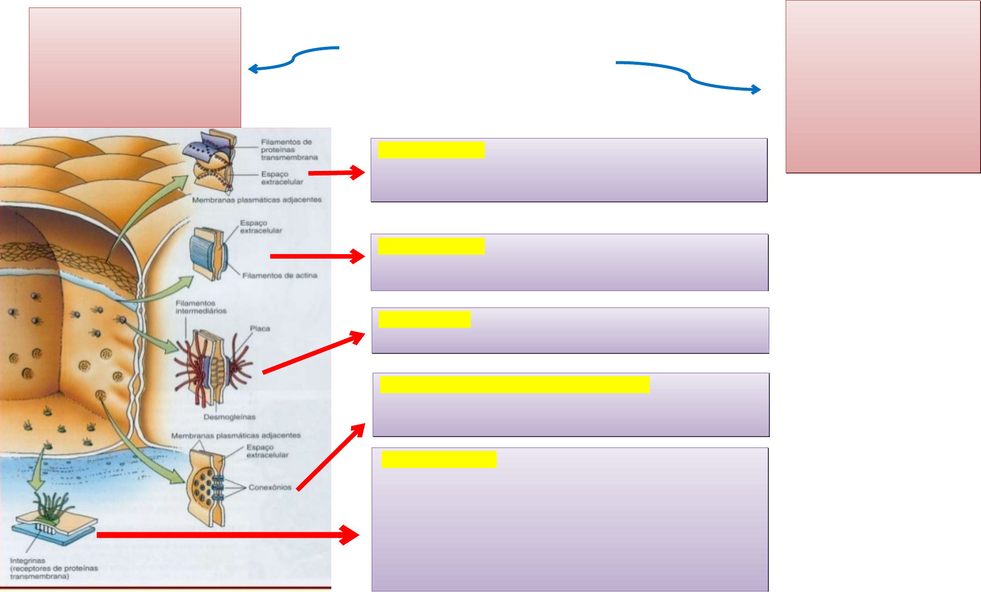 ( Junção Aderente: Adesões célula-célula. Conectam os feixes de filamentos de actina de uma célula com as da outra célula ) ( FUNCIONA COMO: Adesão célula-célula Vedantes (impede o fluxo de matérias para o espaço intracelular) Canais para a comunicação entre células adjacentes . ) ( JUNÇÕES INTERCELULARES ) ( Tipo de especialização das membranas laterais de células. Essas junções garantem a justa posição do tecido epitelial ) ( Junção Oclusiva : selam os espaços entre as células do epitélio, tornando-o uma barreira impermeável (ou seletivamente permeável). ) ( Desmossomos: Conectam os filamentos intermediários de uma célula com a outra. Proporciona força mecânica. ) ( Junção comunicação ou junções do tipo gap : As quais criam poros na membrana das células, permitindo o fluxo de íons e moléculas entre célula-célula. Liga os citoplasmas de 2 células células adjacentes. ) ( Hemidesmossomo : Junção responsável pela adesão da cél ula à matriz extracelular. Esse tipo de junção é constituída principalmente por uma família de proteínas denominadas integrinas, que se localizam na membrana da célula e se comunicam tanto com o exterior, quanto com o interior celular. )