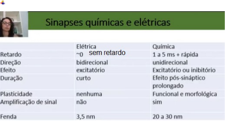 Sinapses · Os neurônios recebem inputs excitatórios e inibitórios. · Sinapses químicas e elétricas; a maioria das sinapses no SN são as químicas. · Local das sinapses: a maioria ocorre nos dendritos. Sinapses elétricas: Passagem de corrente e íons; bidirecional, muito rápida; sem possibilidade de modulação; regiões com necessidade de sincronização. · Sinapses químicas: · Interações entre sinapses químicas e elétricas: as sinapses químicas mandam informações que regulam a atividade as sinapses elétricas, através da liberação de glutamato, alterando a permeabilidade, a forma dos conexons, automaticamente regula a passagem de correntes. (as sinapses químicas modulam as sinapses elétricas). · Sinapses químicas: células e membranas pré-sinápticas, a membrana pré-sináptica possui um grande número de canais e transportadores, um grande número de mitocôndrias e vesículas sinápticas. · Modelo da transmissão sináptica: 1. Transporte ou captação do precursor: O triptofano é o precursor da serotonina, que é um aminoácido especial que não é produzido pelo organismo, tem q ser captado pela dieta. No sangue tem q ser captado pelo transportador de triptofano. Se não há triptofano no sangue ocorre uma diminuição da transmissão serotonética. 2. Síntese do neurotransmissor: Após a captação do precursor do neurotransmissor, o precursor sofre ação de enzimas que estão no citoplasma da célula pré-sináptica. 3. Armazenamento em vesículas: Depois da molécula ser produzida ela precisa entrar na vesícula sináptica e esperar a exocitose. 4. Liberação por exocitose (a fusão das vesículas à membrana é causada pelo Cálcio) na fenda sináptica): após ser armazenado, a célula espera o potencial de ação chegar no terminal sináptico. Ocorre a abertura dos canais de cálcio voltagem-dependente, promovendo o mecanismo de mobilização de vesículas em direção da membrana celular, ocorrendo fusão das vesículas, o conteúdo da vesícula é liberado na fenda sináptica. Modula a atividade excitatória da célula. 5. Ação em receptores pós-sinápticos, ( receptores) 6. Eliminação: Recaptação, Degradação enzimática, Difusão. 5-Vida de um neurotransmissor · A síntese do neurotransmissor ocorre dentro do neurônio, no seu botão terminal. É dependente da ação de enzimas de síntese citoplasmáticas que juntam os precursores do neurotransmissor que foram recapturados a partir da fenda. · A entrada do neurotransmissor na vesícula onde ficará armazenado depende da saída de um íon H+ que foi ativamente colocado lá anteriormente. É uma troca. · Ação em receptores: O neurotransmissor liberado na fenda sináptica atuará na célula pós-sináptica e seus receptores. O mecanismo que ele atua é através do MODELO DA CHAVE E FECHADURA, onde o neurotransmissor(chave) se liga ao receptor(fechadura). Promovendo uma alteração conformacional do receptor, determinado uma mudança que levara a uma despolarização ou uma inibição (PEPS ou PIPS).( Receptor muda de conformação: o subtipo de receptor (mecanismo intracelular acoplado) determina se ocorre PEPS ou PIPS e não o NT.) · Ao se ligar ao receptor, o NT causará uma mudança de conformação e poderá causar um efeito excitatório (PEP) ou inibitório (PIP). Se for um PEP ocorrerá a abertura dos canais de Na+ e Ca+ e consequentemente uma despolarização da membrana. Se for um PIP ocorrerá a abertura dos canais de K+ e Cl- e consequentemente uma hiperpolarização. · A Quantidade de neurotransmissor liberada e o tempo que o neurotransmissor fica disponível na fenda sináptica vai interferir na força do efeito causado na célula. Quanto maior for o número de receptores ativados, maior será o número de canais abertos. · Um mesmo NT pode se ligar a diferentes receptores com diferentes partes da sua estrutura. · Outras substâncias podem se ligar aos receptores, causando um efeito (agonistas) ou apenas bloqueando o sítio do receptor sem causar nenhum efeito na célula (antagonistas). · Tipos de receptores: · IONOTRÓPICOS: receptores ligados a canais iônicos. Canal com 5 subunidades. Cada subunidade com 4 domínios transmembrana. Exemplo: receptor nicotínico. RECEPTORES IONOTRÓPICOS: · Receptores nicotínicos ( faz parte da contração muscular) - Na+ · Excitatórios · Glutamato · AMPA · NMDA · KAINATO · Serotonina (receptor 5-HT3) · Inibitórios- Cl- · GABA · GLICINA · METABOTRÓPICOS: receptores ligados segundos mensageiros. Um receptor com 7 domínios transmembrana. Domínio extra e intracelular. A parte intracelular está ligado a Proteína G (com 3 subunidades). CICLO DA PROTEÍNA G: o receptor é ativado, ativa o domínio de fosforilação que ativa a proteína G, que é fosforilada e se desprende da unidade alfa da unidade beta e gama. Essas subunidades fazem efeito como a fosforilação de outra substância, etc. · Receptores ligados à Proteína G. · Permitem amplificação do sinal. · Estrutura: Receptor com 7 domínios transmembrana. · PTN G com 3 subunidades: alfa, beta e gama. · Efeito: A PTN G pode ativar diretamente um canal (esq.) ou gerar uma cascata de ativação enzimática (dir.). As enzimas ativadas podem ser a Adenilciclase, Fosfolipase C e Fosfolipase A2. · Proteína G ativa diretamente um canal: proteína G ativa a unidade beta, desfosforilando um canal de potássio (ativa), leva a hiperpolarização da célula. · Proteína G ativa uma enzima: ela pode ativar cascatas enzimáticas. Essas cascatas são divididas em 3 grupos: Adenilciclase, Fosfolipase C e Fosfolipase A2. · Proteína G- Adenilciclase: o neurotransmissor (noradrenalina) atua no receptor metabotrópico ativando a proteína G, a sua subunidade alfa será uma subunidade excitatória (proteína GS), então a proteína GS vai atuar sobre a adenilciclase estimulando-a, aumentando a disponibilidade de AMP cíclico, que estimulará a proteína quinase A. A n