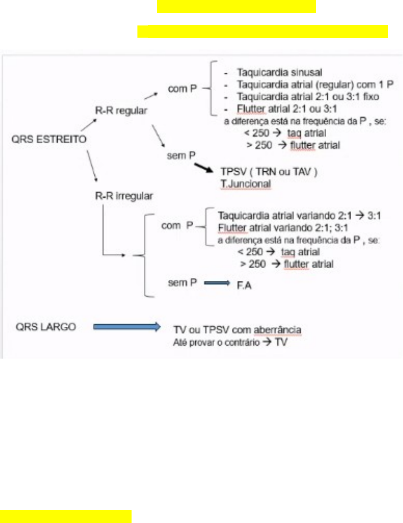 TAQUIARRITMIAS COMPLEXO QRS É ESTREITO OU LARGO? -> SE _120< MS = QRS ESTREITO TAQUICARDIA SUPRAVENTRICULAR -> SE >_ 120 MS = QRS LARGO PROVAVELMENTE UMA TAQUICARDIA VENTRICULAR 1-) TAQUICARDIA INSTÁVEL CARDIOVERSÃO ELÉTRICA SINCRONIZADA -SINAIS DE INSTABILIDADE: HIPOTENSAO, CHOQEU, ALTERAÇÃO DO NÍVEL DE COSNCIÊNCIA, DOR PRECORDIAL, DISPENIA (CONGESTÃO PULMONAR) 2-) TAQICARDIA ESTÁVEL-> TERAPIA FARMACOLÓGICA -TIPOS DE TAQUICARDIA SUPRAVENTRICULARES: 1-) ORIGINÁRIAS DOS ÁTRIOS -TAQUICARDIA SINUSAL -FLUTTER ATRIAL -TAQUICARDIA ATRIAL -FIBRILAÇÃO ATRIAL -TAQUICARDIA SINUSAL 2-) ORIGINÁRIAS DO NÓ AV: -TAQUICARDIA DE RRENTRADA ATRIOVENTRICULAR -TAQUICARDIA DE REENTRADA NODAL PACIENTE CONSCIENTE E SEM ESTADO DE HIPOXEMIA A DISTÂNCIA ESTRE AS ONDAS R-R´SÃO REGULARES RESPOSTA DO CASO: TAQUICARDIA SUPRAVENTRICULAR (TSV)SURGEM NO NÓ. A.V CONDUTA: ADENOSINA PARA TENTAR REVERTER A ARRITMIA OU SENÃO MEDIDA NÃO FARMACOLÓGICA (MANOBRAS VAGAIS COMO MASSAGEM DO SEIO CARAOTÍDEO) FAZ UM BLOQUEIO TEMPORÁRIO DA CONDUÇÃO ATRIO VENTRICULAR CESSO POR ALGUNS SEGUNDOS. QUEBRANDO O CIRCUITO DA ARRITMIA (EX: MANOBRA DE VASALVA) DOSE ADENOSINA PARA REVERSÃO DE TSV: 1º DOSE – 6 MG; 2º DOSE- 12 MG; PRÓXIMA OPÇÃO TERAPÊUTICA: SE O PACIENTE ESTIVER ESTÁVEL, SEM SINAIS DE INSTABILIDADE( DISPNEI INTENS, DESSATURAÇÃO, ALTERAÇÃO DO NIVEL DE CONSCIENCIA) SERIA DESCARTADA A CARDIOVERSÃO E TENTAR DROGA ANTIARRITMICA COMO BETABLOQUEADOR (METOPOLOL DE 5-15 MG; ESMOLOL) OU ANTAGONSITAS DE CANLA DE CÁLCIAO (VERPRAMIL, DIATIAZEM EM VIA ENDOVENOSA) OU AMIODARONA EM 150 MG EM 10 MIN DILUIDO EM SORO FISIOLÓGICO OU GLICOSADO CASO NÃO DÊ CERTO, FAZER CARDIOVERSÃO EM ULTIMA OPÇAÕ RESULTADO APÓS CARDIOVERSÃO: TAQUICARDIA SUPRA VENTRICULAR ETIOLOGIAS TAQUICARDIA PAROXÍSTICA DE REINTRADA NODAL ( 2 VIAS NO NÓ A.V, VIA MAIS RAPIDA E LENTA GERANDO UM CIRCUITO E ARRITMIAS) COM ECG NORMAL APÓS CARDIOVERSÃO E TAQUICARDIA ATRIOVENTRICULAR PRE EXCITAÇÃO VENTRICULAR COMO SÍNDROME DE WOLFF-PARKINSON-WHITE (WPW) ONDA DELTA APÓS A REVERSÃO MOSTRA A PRE EXCITAÇÃO VENTRICULAR DESCARTADO O DIAGNÓSTICO DIFERENCIAL: FIBRILAÇÃO ATRIAL (F.A)O INTERVALO R-R ESTÁ IRREGULAR; ONDAS ISOELÉTRICAS SEM ATIVIDADE ELE´TRICA BEM DEFINIDIA TAQUICARDIA SUPRAVENTRICULAR A linha de base desorganizada também é critério para fibrilação arterial? se sim, mostra pf? R: LINHAS ISOELÉTRICAS TAQUICARDIA DE REINTRADA NODAL MIMETIZA DERIVAÇÃO DII COMO PSEUDO ONDA S , ENTALHE NEGATIVO DISCRETVO AO FIM DE DII, PSEUDO S MAS QUE É ÓNDA P RETROGADA EM V1 NO COMPLEXO QRvai ter r` - pode SER VISTO NA TAQUICARDIA DE REINTRADA NODAL TAQUICARDIA NÓ A.V PARA CIMA SUPRA VENTRICULAR: QRS ESTREITO, DISTÂNCIA ENTRE O INTERVALO R-R É IGUAL ENTRE SI; RITMO REGULAR ENTRE OS INTERVALOS (R-R`) ABAIXO DO NÓ A.V , NO FEIXE DE HIS INFRA VENTRICULAR SECUNDÁRIO A CICATRIZ QRS LARGOS, MAIOR QUE 120 M OU MAIOR QUE 3 quadradinhos; RITMO REGULAR (R-R`) NA FIBRILAÇÃO ATRIAL, A DISTÂNCIA ENTRE OS R-R` É IRREGULAR! FC IGUAL PODE MIMETIZAR QUE O R-R DÁ IMPRESSAO DE ESTAR REGULAR MAS HÁ DISCRETAS MUDANÇAS NOS COMPLEXOS QRS DIFERENCIAR PACIENTE ESTÁVEL DE INSTÁVEL? PARA PACIENTE INSTÁVEL HAVERÁ MÁ PERFUSÃO PERIFÉRICA, HIPOTENSAO ARTERIAL SISTÓLICA < 90 MMH OU PAM < 60--65 MMhG VASOCONSTRIÇÃO PERIFÉRICA, REBAIXAMNTO DE CONSCIÊNCIA, TEMPO DE PERFUSÃO PERIFÉRICA LENTIFICADA, SUDORESE , PELE FRIA SE O PACIENTE ESTIVESSE INSTÁVEL, DEVERIA USAR TAQUICARDIA VENTRIUCLAR SEM PULSO E FIBRILAÇÃO VENTRICULAR - NÃO ESTANDO EM PARADA RESPIRATÓRIA, PODENDO FAZER UMA CARDIOVERSÃO ELÉTRICA SINCRONIZADA EM CIMA DO COMPLEXO QRS SOMENTE USAR EM RITMOS DE PARADA POIS NÃO SABE DEFINIR ONDA T E COMPLEXO QRS Taquicardia Supraventricular A taquicardia supraventricular é o transtorno do ritmo que se origina acima da bifurcação do feixe de His. Pode-se originar no tecido atrial, na junção atrioventricular ou envolvendo vias acessórias. No primeiro caso destacam-se: a) taquicardia sinusal; b) taquicardia atrial paroxística; c) flutter e fibrilação atriais. Envolvendo a junção atrioventricular, a reentrada nodal, e quando se consideram as vias acessórias, a síndrome de Wolff-Parkinson-White (via acessória com condução bidirecional) e a reentrada atrioventricular com via acessória com condução retrógrada exclusiva. Diagnóstico Nessa apresentação não serão considerados o flutter ou a fibrilação atrial por se tratarem de arritmias com mecanismos e abordagem terapêutica mais complexas. Clinicamente a taquicardia supraventricular apresenta-se com palpitações no peito ou no pescoço (particularmente a reentrada nodal), de início e término súbitos desencadeadas aos esforços, emoções ou até mesmo durante o sono. A taquicardia atrial se caracteriza por ritmo regular, com freqüência atrial que varia entre 110 e 180 bpm, com ondas P diferentes do ritmo sinusal, precedendo os complexos QRS. A taquicardia por reentrada nodal apresenta ritmo regular, com freqüência cardíaca entre 120 e 180 bpm. As ondas P na maioria dos casos não são visíveis devido a ativação concomitante de átrios e ventrículos. Num percentual menor (35%) a onda P vem após o QRS (intervalo RP’ < 70 ms). Em 4% dos casos as ondas P precedem o QRS, simulando uma onda "q". A taquicardia envolvendo via acessória apresenta freqüências cardíacas mais elevadas (de 140 e 200 bpm). Caracteriza-se por ritmo regular, com ondas P incidindo no segmento ST (intervalo RP’ > 90 ms). Tratamento A taquicardia atrial costuma ser rebelde ao tratamento e o fármaco de escolha é a amiodarona. Na fase aguda, por via venosa e, posteriormente, a prevenção de recorrências, por via oral. Freqüentemente é necessária a associação com outros agentes (beta-bloqueadores ou antagonistas de cálcio). A ablação do foco arritmogênico é bem sucedida em 80% dos pacientes. Na fase aguda da taquicardia por reentrada atrioventricular ou nodal, a compr