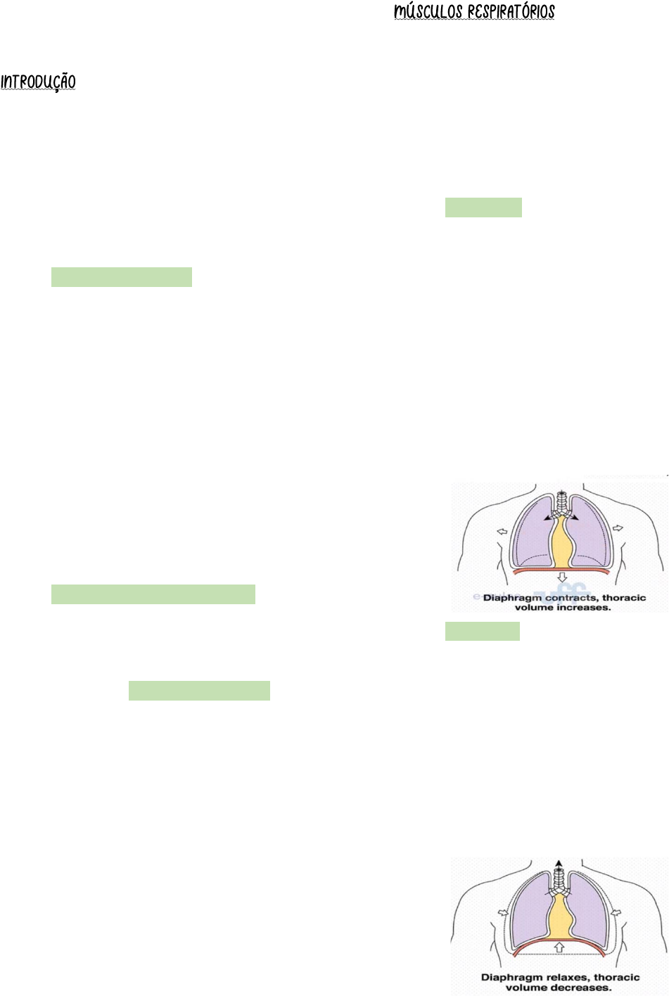 Mecânica ventilatória As funções principais da respiração são prover oxigênio aos tecidos e remover o dióxido de carbono. A fim de alcançar tais objetivos, a respiração pode ser dividida em quatro componentes principais: • ventilação pulmonar, que significa o influxo e o efluxo de ar entre a atmosfera e os alvéolos pulmonares; • difusão de oxigênio (O2) e dióxido de carbono (CO2) entre os alvéolos e o sangue; • transporte de oxigênio e dióxido de carbono no sangue e nos líquidos corporais e suas trocas com as células de todos os tecidos do corpo; e • regulação da ventilação e outros aspectos da respiração. A renovação constante do gás alveolar é assegurada pelos movimentos do tórax. Durante a inspiração, a cavidade torácica cresce de volume e os pulmões se expandem para preencher o espaço deixado. Com o aumento da capacidade pulmonar e queda da pressão no interior do sistema, o ar ambiente é sugado para dentro dos pulmões. A inspiração é seguida imediatamente pela expiração, que provoca diminuição do volume pulmonar e expulsão de gás. São músculos esqueléticos estriados que, quando comparados com os esqueléticos da periferia, apresentam as seguintes características: maior resistência à fadiga, elevado fluxo sanguíneo, maior capacidade oxidativa e densidade capilar • Inspiração: a caixa torácica faz o movimento de alça de balde ao se elevarem as costelas e se abaixar o diafragma para que a pressão interna seja menor que a externa e o ar entre. Diafragma. Músculos intercostais externos Músculos acessórios • Expiração: a caixa torácica tem suas costelas abaixadas e o diafragma se move superiormente, o que gera o aumento de pressão responsável por expulsar o ar dos pulmões. Músculos intercostais internos Músculos abdominais Em uma situação de repouso, o pulmão está envolto por uma pleura parietal e uma pleura visceral que formam uma cavidade pleural preenchida por líquido. Por causa de suas propriedades elásticas garantidas pelas fibras de colágeno e elastina entrelaçadas no parêquima pulmonar, os pulmões tendem a colabar, o que gera uma força com vetor voltado para dentro (forças elásticas do tecido pulmonar propriamente dito e forças elásticas causadas pela tensão superficial do líquido que reveste as paredes internas dos alvéolos). Só que essa estrutura toda tem relação íntima com o gradil costal e nele é gerada uma força de reação para fora (força de sustentação). Nesse cenário de oposição entre as forças de retração e de sustentação, uma pressão negativa é gerada dentro do espaço pleural (=-4 cm H2O). Essa pressão é crucial para manter os pulmões minimamente inflados. • Pressão pleural: como já falado acima, é uma pressão negativa relativa à pressão do líquido presente na cavidade pleural. Normalmente, é descrita como uma sucção Dligeira das paredes dos pulmões. • Pressão alveolar: é a pressão do ar no interior dos alvéolos pulmonares. • Pressão transpulmonar: é a diferença entre as pressões alveolar e pleural. • Inspiração: com a expansão do pulmão, as forças que tracionam para fora superam as forças de retração. Isso produz uma pressão pleural mais negativa ainda (=-6 cm H2O) e uma pressão alveolar negativa (antes era igual à atmosférica, passa a ser =-1 cm H2O) → ENTRADA DE AR. PRESSÃO ATMOSFÉRICA As pressões transpleurais, necessárias para expandir os pulmões cheios de ar, são cerca de três vezes maiores que as necessárias para expandir os pulmões cheios de solução salina. Assim, pode-se concluir que as forças elásticas teciduais, que tendem a provocar o colapso do pulmão cheio de ar representam, apenas cerca de um terço da elasticidade total pulmonar, enquanto as forças de tensão superficial líquido-ar nos alvéolos representam cerca de dois terços. • Expiração: com a redução da expansão da caixa torácica, a pressão pleural fica menos negativa (=-4 cm H2O) e a pressão alveolar fica positiva (=+1 cm H2O) → SAÍDA DE AR. OBS: quanto maior a pressão transpulmonar, maior a quantidade de ar que entra nos pulmões. • Capacidade Inspiratória (CI): quantidade de ar que pode ser inspirada (Volume Corrente + Volume de Reserva Inspiratório) • Capacidade funcional residual: quantidade de ar que permanece nos pulmões após expiração normal (Volume Residual + Volume de Reserva Expiratório) A partir da espirometria, conseguimos obter valores do volume residual. É o grau de extensão dos pulmões por cada unidade de aumento da pressão transpulmonar (mL/ cm H2O). O diagrama da complacência pulmonar consiste numa curva de complacência inspiratória e numa curva de complacência expiratória. É determinada por: • Distensibilidade do tecido pulmonar e da caixa torácica • Tensão superficial do alvéolo Volumes e capacidades pulmonares Volume corrente: quantidade de ar inspirada ou expirada espontaneamente em cada ciclo respiratório. No repouso, o volume corrente humano oscila entre 350 e 500 mℓ Volume de reserva inspiratório: volume máximo que pode ser inspirado voluntariamente a partir do final de uma inspiração espontânea Volume de reserva expiratório: volume máximo que pode ser expirado voluntariamente a partir do final de uma expiração espontânea Volume residual: volume de gás que permanece no interior dos pulmões após a expiração máxima. Assim, este volume não pode ser medido pelo espirógrafo simples descrito anteriormente Capacidade vital: quantidade de gás mobilizada entre uma inspiração e uma expiração máximas. Veja que a capacidade vital é a soma de três volumes primários: corrente, de reserva inspiratório e de reserva expiratório Capacidade inspiratória: volume máximo inspirado a partir do final de uma expiração espontânea. Corresponde à soma dos volumes corrente e de reserva inspiratório Capacidade residual funcional: quantidade de g