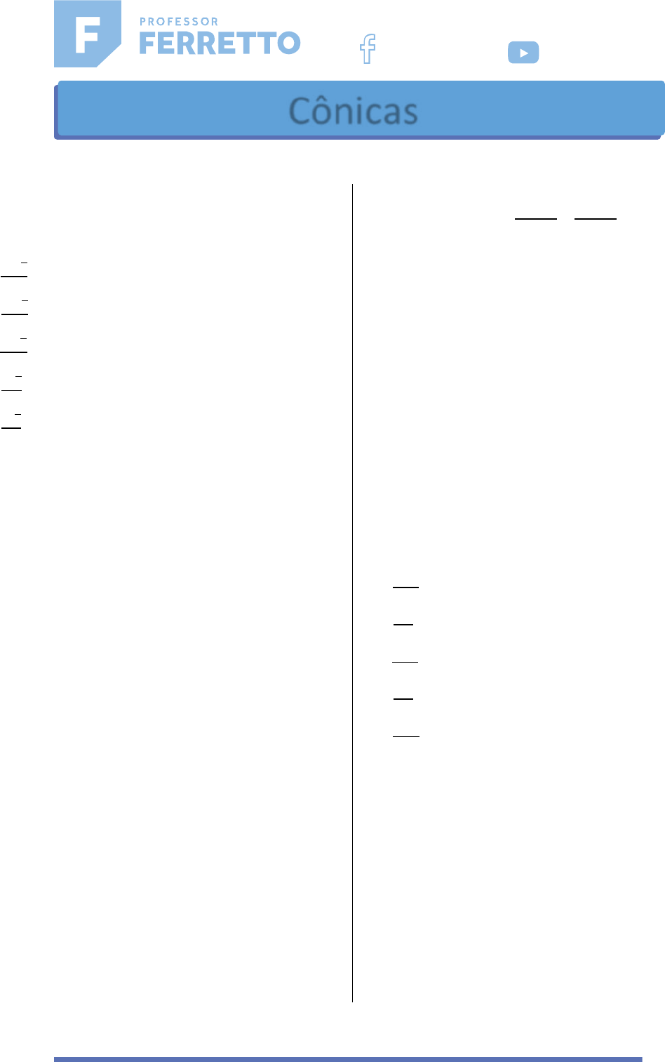 1 M1215 - (Espcex) Uma hipérbole tem focos F1(–5, 0) e F2(5, 0) e passa pelos pontos P(3, 0) e Q(4, y), com y > 0. O triângulo com vértices em F1, P e Q tem área igual a a) !"√$ % . b) !"√$ & . c) %'√$ % . d) (√$ % . e) (√$ & . M1216 - (Unicamp) No plano cartesiano, considere a circunferência de equação x2 + y2 – 4y + 3 = 0 e a parábola de equação 3x2 – y + 1 = 0. Essas duas curvas se interceptam em a) um ponto. b) dois pontos. c) três pontos. d) quatro pontos. M1217 - (Uece) No plano, com o sistema de coordenadas cartesianas usual, a equação x2 + 4y2 = 4x representa a) uma circunferência. b) duas retas. c) uma parábola. d) uma elipse. M1218 - (Epcar) No plano cartesiano, os pontos P(x, y) satisfazem a equação (* , !) . '& + (0 1 ') . 2 = 1 da curva 𝜆. Se F1 e F2 são os focos de 𝜆, tais que a abscissa de F1 é menor que a abscissa de F2, é INCORRETO afirmar que a) a soma das distâncias de P a F1 e de P a F2 é igual a 10. b) F1 coincide com o centro da curva x2 + y2 + 6x – 4y = 0. c) F2 é exterior a x2 + y2 = 25. d) o ponto de abscissa máxima de 𝜆 pertence à reta y = x – 8. M1219 - (Espcex) Uma elipse tem centro na origem e vértices em (2a, 0) e (0, a), com a > 0. A área do quadrado inscrito nessa elipse é a) !"6 . & . b) 76 . & . c) !'6 . & . d) (6 . & . e) '86 . & . M1220 - (Mackenzie) Com relação às equações das elipses 25x2 + 16y2 + 150x + 256y – 351 = 0 e 16x2 + 25y2 – 96x – 200y + 144 = 0, podemos afirmar que a) as elipses têm centros coincidentes. b) as elipses têm a mesma distância focal. c) as elipses têm a mesma excentricidade. d) as elipses têm focos sobre o eixo das abscissas. e) o eixo maior de uma delas é o dobro do eixo menor da outra. www.professorferretto.com.br ProfessorFerretto ProfessorFerretto Cônicas 2 M1221 - (Espcex) Considere as afirmações: I. Uma elipse tem como focos os pontos F1(–3, 0), F2(3, 0) e a medida do eixo maior é 8. Sua equação é * . !" + 0. $ = 1. II. Os focos de uma hipérbole são F1(–10, 0), F2(10, 0) e sua excentricidade é 5/3. Sua equação é 16x2 – 9y2 = 576. III. A parábola 8x = –y2 + 6y – 9 tem como vértice o ponto V(3, 0). Com base nessas afirmações, assinale a alternativa correta. a) Todas as afirmações são falsas. b) Apenas as afirmações I e III são falsas. c) Apenas as afirmações I e II são verdadeiras. d) Todas as afirmações são verdadeiras. e) Apenas a afirmação III é verdadeira. M1222 - (Esc. Naval) A equação 4x2 – y2 – 32x + 8y + 52 = 0, no plano xy, representa a) duas retas b) uma circunferência c) uma elipse d) uma hipérbole e) uma parábola M1223 - (Espcex) A representação no sistema cartesiano ortogonal da equação 9x2 – y2 = 36x + 8y – 11 é dada por a) duas retas concorrentes. b) uma circunferência. c) uma elipse. d) uma parábola. e) uma hipérbole. M1224 - (Ifpe) Bira adquiriu uma cabra que pasta em um campo retangular. Para delimitar o gramado, ele pretende traçar uma elipse inscrita num terreno retangular de 10 m por 8 m. Para isso, ele deve utilizar um fio esticado preso por duas estacas M e N, conforme mostra a figura. Qual deve ser a distância entre as estacas M e N? a) 5 b) 4 c) 8 d) 6 e) 9 notas