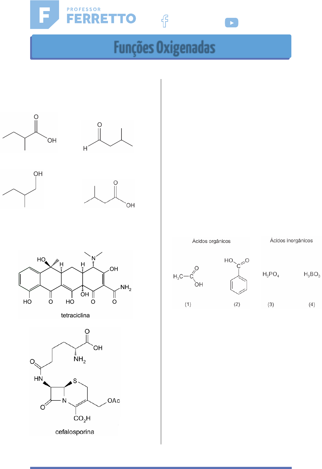 1 Q0915 – (Uerj) O acúmulo do ácido 3-metilbutanoico no organismo humano pode gerar transtornos à saúde. A fórmula estrutural desse ácido é representada por: a) c) b) d) Q0916 - (Famerp) Tetraciclina e cefalosporina são antibióticos clássicos, cujas fórmulas estruturais estão representadas a seguir. As duas estruturas têm em comum as funções orgânicas a) fenol e ácido carboxílico. b) cetona e amina. c) cetona e amida. d) amina e amida. e) amina e ácido carboxílico. Q0917 - (Espcex (Aman)) Acidulantes são substâncias utilizadas principalmente para intensificar o gosto ácido de bebidas e outros alimentos. Diversos são os ácidos empregados para essa finalidade. Alguns podem ser classificados como ácidos orgânicos e outros como ácidos inorgânicos. Dentre eles, estão os quatro descritos pelas fórmulas moleculares e estruturais abaixo. A alternativa que descreve, respectivamente, a correta nomenclatura oficial destes ácidos é: a) 1 - Ácido etânico; 2 - Ácido fenóico; 3 - Ácido fosfórico; 4 - Ácido bórico. b) 1 - Ácido etanoico; 2 - Ácido benzoico; 3 - Ácido fosfórico; 4 - Ácido bórico. c) 1 - Ácido etanoico; 2 - Ácido benzílico; 3 - Ácido fosforoso; 4 - Ácido borático. d) 1 - Ácido propílico; 2 - Ácido benzílico; 3 - Ácido fosfático; 4 - Ácido boroso. e) 1 - Ácido etanoso; 2 - Ácido benzoico; 3 - Ácido fosforoso; 4 - Ácido bárico. www.professorferretto.com.br ProfessorFerretto ProfessorFerretto Funções Oxigenadas ee 2 Q0918 - (Ifsul) A bebida mais típica de nossa região, o chimarrão, é preparado com erva-mate e apresenta propriedades estimulantes relacionadas à presença de alguns alcaloides derivados da xantina nessa planta. Além da cafeína, estão dentre eles a teofilina e a teobromina. As estruturas desses compostos orgânicos são mostradas abaixo. A respeito da molécula de teofilina, é correto afirmar que Dados: C = 12; H = 1; N = 14; O = 16. a) detém massa molar igual a 180 g/mol. b) possui fórmula molecular C7H7N4O2. c) apresenta função cetona. d) contém 5 carbonos sp3. Q0919 - (Uece) O ácido butanoico tem um odor dos mais desagradáveis: está presente na manteiga rançosa, no cheiro de suor e no chulé. No entanto, ao reagir com etanol, forma o agradável aroma de abacaxi. Assinale a opção que apresenta corretamente o composto responsável por esse aroma e a respectiva função orgânica a que pertence. a) hexanamida – amida b) ácido 3-amino-hexanoico – aminoácido c) hexanal – aldeído d) butanoato de etila – éster Q0920 - (Unisc) A vanilina (fórmula a seguir), é o composto principal do aroma essencial da baunilha, largamente empregada como aromatizante em alimentos. Em sua estrutura química, observa-se a presença dos grupos funcionais das funções químicas a) cetona, éster e fenol. b) cetona, álcool e fenol. c) fenol, cetona, éter. d) fenol, aldeído e éter. e) álcool, aldeído e éter. Q0921 - (Puccamp) Batatas são boa fonte de vitamina C e de algumas vitaminas do complexo B, especialmente niacina, tiamina e piridoxina (vitamina B6). A função ácido carboxílico está presente na a) niacina, apenas. b) tiamina, apenas. c) piridoxina, apenas. d) niacina e na tiamina. e) tiamina e na piridoxina. Q0922 - (Ifsul) Recentemente as denúncias das Operações da Polícia Federal contra as fraudes em frigoríficos reacenderam os debates sobre o uso de aditivos alimentares e segurança alimentar. Dentre os diversos grupos de aditivos alimentares, estão os acidulantes, definidos pela ANVISA como “substância que aumenta a acidez ou confere um sabor ácido aos alimentos” (ANVISA, Portaria 540/1997). São exemplos de acidulantes o ácido fosfórico, o ácido cítrico e o ácido acético. O ácido acético, fórmula estrutural H3C – COOH, oficialmente é chamado de ácido a) acetoico. b) etanoico. c) metanoico. d) propanoico. Q0923 - (Ifpe) Extrair um dente é um procedimento que não requer anestesia geral, sendo utilizados, nesses casos, os anestésicos locais, substâncias que insensibilizam o tato de uma região e, dessa forma, eliminam a sensação de dor. Você já pode ter entrado em contato com eles no dentista ou se o médico lhe receitou pomada para aliviar a dor de queimaduras. Exemplos de anestésicos locais são o eugenol e a benzocaína, cujas fórmulas estruturais aparecem a seguir. 3 Sobre as estruturas acima, é CORRETO afirmar que a) o eugenol representa um hidrocarboneto insaturado. b) a benzocaína possui uma estrutura saturada e homogênea. c) as duas estruturas representam hidrocarbonetos insaturados e heterogêneos. d) se verifica a presença de um grupo funcional ácido carboxílico no eugenol. e) a benzocaína possui um grupo funcional amina e uma estrutura insaturada. Q0924 - (Ifsul) Uma substância orgânica que apresenta fórmula molecular C2H4O2 deve ser classificada como a) éter. b) ácido. c) álcool. d) aldeído. Q0925 - (Pucrj) A seguir está representada a estrutura de uma substância orgânica de origem natural. Nessa substância estão presentes as funções orgânicas a) álcool e éter. b) álcool e cetona. c) éter e cetona. d) éster e aldeído. e) éster e ácido carboxílico. Q0926 - (Pucrs) A erva-mate (Ilex paraguaiensis) contém muitas substâncias orgânicas, as quais podem ter ação benéfica no organismo. As estruturas moleculares de algumas substâncias presentes nessa planta são mostradas a seguir: Considerando essas estruturas, é correto afirmar que a) a vitamina A é um hidrocarboneto de cadeia cíclica e ramificada. b) os grupamentos –OH nas três moléculas conferem a elas caráter marcadamente ácido. c) o aroma da erva-mate provém dos ácidos cafeico e neoclorogênico, porque apresentam anel aromático ou benzênico. d) o número de átomos de hidrogênio na molécula de vitamina A é maior do que na do ácido neoclorogênico. e) o ácido neoclorogênico é muito solúvel em óleo, por conta de seus numerosos grupament