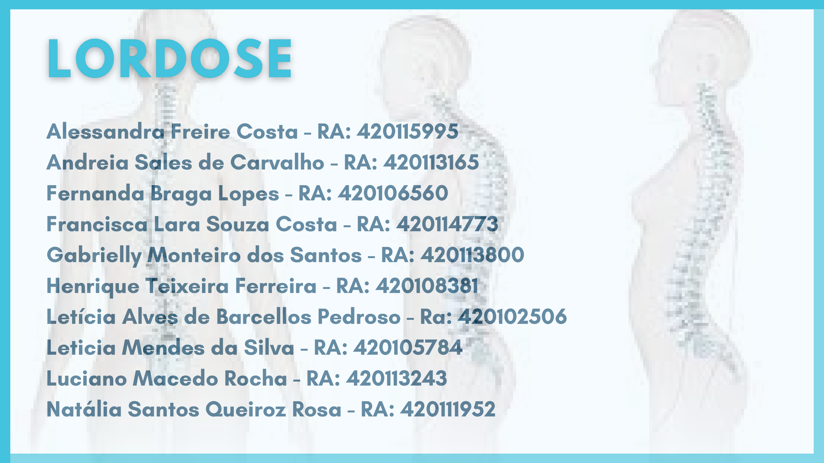 Alessandra Freire Costa - RA: 420115995 Andreia Sales de Carvalho - RA: 420113165 Fernanda Braga Lopes - RA: 420106560 Francisca Lara Souza Costa - RA: 420114773 Gabrielly Monteiro dos Santos - RA: 420113800 Henrique Teixeira Ferreira - RA: 420108381 Letícia Alves de Barcellos Pedroso - Ra: 420102506 Leticia Mendes da Silva - RA: 420105784 Luciano Macedo Rocha - RA: 420113243 Natália Santos Queiroz Rosa - RA: 420111952 CURVATURA INTERNA AUMENTADA DA ESPINHA COMUM NA REGIÃO LOMBAR, MAS EM CASOS RAROS TAMBÉM PODE AFETAR O PESCOÇO cervical: curvatura na região do pescoço; lombar: curvatura na região da cintura, formato de "C". HIPOLORDOSE E HIPERLORDOSE: Obesidade; Osteoporose; Acondroplasia; Espondilodiscites; Cifose torácica; Discite; Uso de sapato com salto. PRINCIPAIS: Dores nas costas e pescoço; Aumento na curvatura lombar ou cervical; Fraqueza na musculatura abdominal; Formigamento no corpo; Dificuldade para pegar peso. Os CD estão entre os primeiros em afastamento do trabalho por consequência de dores musculares causadas pela má postura; Prevalência alta de sintomas no pescoço e na região do ombro como também da região lombar de dentistas que trabalham em prática clínica; O dano fisiológico cumulativo pode conduzir a um dano ou uma inaptidão profissional. Avaliação clínica; Exame físico (avaliar se há dor, rigidez, espasmos); Exames de imagem Manter a coluna ereta o máximo possível; Ter postura ao sentar e caminhar; Dormir com posição adequada. Medicação; Fisioterapia; Pelve com bola; Abdominal Crunch; Extensão de quadril; Alongamentos; Perda de peso; Cirurgia A Hiperlordose é mais comum em mulheres; A mulher possui uma lordose lombar maior do que a do homem, pela presença de uma bacia mais larga; A hipolordose pode afetar tanto homens como mulheres, porém é mais comum entre os negros; No Brasil, há mais de 150 mil casos de lordose por ano; Medicamentos e exercícios são os maiores aliados no tratamento, e os casos cirúrgicos, raros; Durante a gestação a lordose lombar poderá ser mais pronunciada. https://drauziovarella.uol.com.br/doencas-e-sintomas/lordose/ https://www.itcvertebral.com.br/hiperlordose-e-hipercifose/ https://doctorshoes.com.br/blog/saude/o-que-e-lordose/ https://www.itcvertebral.com.br/lordose-tem-cura/ http://www.ortocenter.com.br/Como-prevenir-a-lordose https://blog.miotec.com.br/tratamentos-para-lordose/ http://saopietro.com.br/lordose-o-que-e-causas-sintomas-e-tratamento http://www.creb.com.br/ https://www.uol.com.br/vivabem/noticias/redacao/2019/12/17/lordose-e-curva-natural-da- regiao-lombar-saiba-quando-pode-ser-um-problema.amp.htm https://osteopatiasp.com.br/lordose/ https://drauziovarella.uol.com.br/doencas-e-sintomas/lordose/ https://www.itcvertebral.com.br/hiperlordose-e-hipercifose/ https://doctorshoes.com.br/blog/saude/o-que-e-lordose/ https://www.itcvertebral.com.br/lordose-tem-cura/ http://www.ortocenter.com.br/Como-prevenir-a-lordose https://blog.miotec.com.br/tratamentos-para-lordose/ http://saopietro.com.br/lordose-o-que-e-causas-sintomas-e-tratamento http://www.creb.com.br/ https://www.uol.com.br/vivabem/noticias/redacao/2019/12/17/lordose-e-curva-natural-da-regiao-lombar-saiba-quando-pode-ser-um-problema.amp.htm