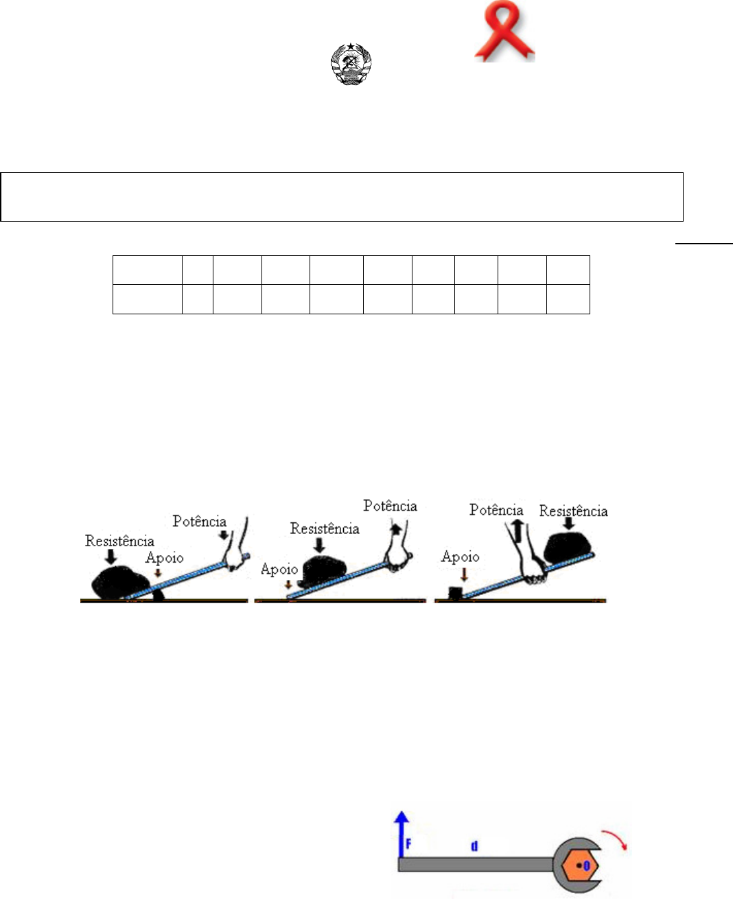Abuso Sexual nas Escolas Abuso Sexual nas Escolas Abuso Sexual nas Escolas Abuso Sexual nas Escolas Não dá para aceitar Por uma escola livre do SIDA República de Moçambique Física Ministério da Educação 1ª Época 10ª Classe / 2011 Conselho Nacional de Exames, Certificação e Equivalências 90 Minutos 1. A tabela corresponde ao movimento de um ponto material que se move em linha recta. V(m/s) 0 10 20 30 30 30 20 10 0 t(s) 0 1 2 3 4 5 6 7 8 a) Classifique o movimento nos intervalos (0-3)s e (3-5)s. b) Construa o gráfico vxt no intervalo (0-8)s. c) Qual é a distância percorrida pelo corpo no intervalo (0-3)s? Cotação (1,0) (1,0) (3,0) 2. A figura representa três tipos de alavanca. Copie para a sua folha de exame, a opção que melhor completa a seguinte afirmação: Da esquerda para a direita temos respectivamente alavancas... A inter-potente, inter-resistente, inter-fixa. B inter-resistente, inter-potente, inter-fixa. C inter-fixa, inter–resistente, inter-potente. (1,0) 3. Na figura, para fazer girar a porca é necessário um momento de 240 N.m. Se a força aplicada é F = 480N qual deve ser o valor do braço (d)? (1,0) 4. Copie para a sua folha de exame, a opção que melhor completa a seguinte afirmação: Uma panela possui cabos de madeira ou de plástico para evitar o aquecimento do cabo por... A condução. B irradiação. C convecção. Vire a folha (0,5) Esta prova contém 8 perguntas. Leia-a com atenção e responda na sua folha de exame. Na margem direita, está indicada entre parênteses, a cotação de cada pergunta, em valores. 2011/10ª Classe/ Exame de Física/1ª Época 5. Copie para a sua folha de exame, a opção que melhor completa a seguinte afirmação: Na cidade de Xai-Xai nas noites a temperatura por vezes baixa até 57,2 ºF. Na escala Celcius essa temperatura equivale a... A 12º C B 13º C C 14ºC D 15ºC (1,5) 6. A figura representa um circuito eléctrico formado por cinco lâmpadas de uma árvore de natal. O amperímetro acusa uma corrente de 2A. a) Calcule a resistência total do circuito. b) Determine o valor lido pelo voltímetro. c) Suponha que se queime a lâmpada L3. Quais as lâmpadas que permanecerão acesas? (1,5) (1,5) (1,0) 7. O gráfico mostra como varia a corrente eléctrica através de um condutor metálico quando nas suas extremidades se aplica uma d.d.p variável. Assinale com V as afirmações verdadeiras e com F as falsas. A O condutor a que este gráfico se refere, não obedece à lei de Ohm. B O condutor dissipa uma potência de 60 W quando a corrente é de 1A. C A tensão eléctrica é directamente proporcional à resistência do condutor. D A resistência deste condutor é de 60 Ω. E A potência dissipada no condutor é a mesma, qualquer que seja a tensão aplicada. (0,5) (1,0) (0,5) (1,0) (0,5) 8. A onda cujo perfil está representado na figura, propaga-se com uma frequência de 60 Hz. Calcule: a) a amplitude. b) o comprimento de onda. c) a velocidade da onda e o período. (0,5) (1,0) (2,0) FIM