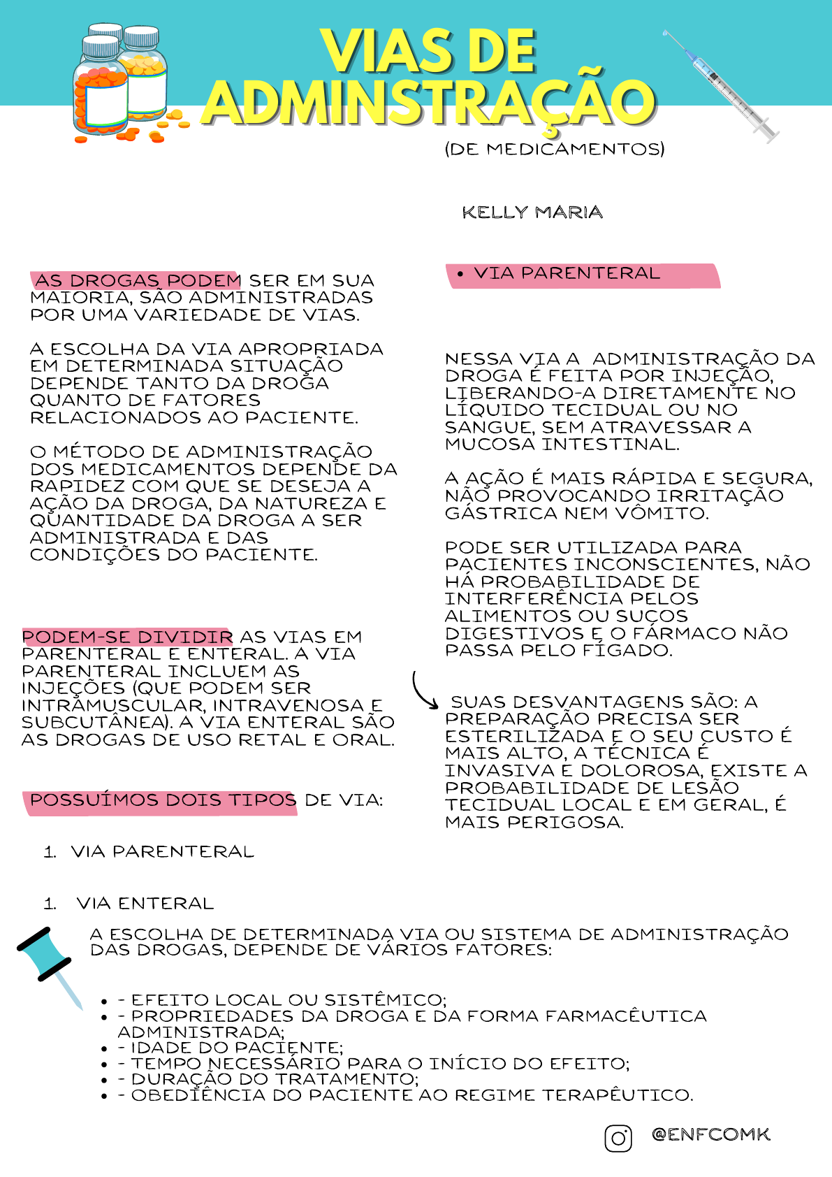 As drogas podem ser em sua maioria, são administradas por uma variedade de vias. A escolha da via apropriada em determinada situação depende tanto da droga quanto de fatores relacionados ao paciente. O método de administração dos medicamentos depende da rapidez com que se deseja a ação da droga, da natureza e quantidade da droga a ser administrada e das condições do paciente. KELLY MARIAKELLY MARIA (DE MEDICAMENTOS) Via Parenteral Nessa Via a administração da droga é feita por injeção, liberando-a diretamente no líquido tecidual ou no sangue, sem atravessar a mucosa intestinal. A ação é mais rápida e segura, não provocando irritação gástrica nem vômito. Pode ser utilizada para pacientes inconscientes, não há probabilidade de interferência pelos alimentos ou sucos digestivos e o fármaco não passa pelo fígado. Suas desvantagens são: a preparação precisa ser esterilizada e o seu custo é mais alto, a técnica é invasiva e dolorosa, existe a probabilidade de lesão tecidual local e em geral, é mais perigosa. vIA PARENTERAL vIA enteral Possuímos dois tipos de via: 1. 1. @enfcomk@enfcomk - Efeito local ou sistêmico; - Propriedades da droga e da forma farmacêutica administrada; - Idade do paciente; - Tempo necessário para o início do efeito; - Duração do tratamento; - Obediência do paciente ao regime terapêutico. a escolha de determinada via ou sistema de administração das drogas, depende de vários fatores: Podem-se dividir as vias em Parenteral e Enteral. A via Parenteral incluem as Injeções (que podem ser Intramuscular, Intravenosa e Subcutânea). A via Enteral são as drogas de uso Retal e Oral. VIAS DEVIAS DEVIAS DE ADMINSTRAÇÃOADMINSTRAÇÃOADMINSTRAÇÃO TIPOS DE PARENTERAL KELLY MARIAKELLY MARIA (DE MEDICAMENTOS) Intramuscular (IM): deposita a medicação profundamente em tecidos musculares esqueléticos como o deltoide, o tríceps, glúteo máximo, etc. A absorção é mais rápida por ser muito vascularizado, sendo menos dolorosa devido os músculos possuírem poucos nervos sensoriais. @enfcomk@enfcomk Intravenosa (IV): deve ser administrado lentamente durante várias horas em uma das veias superficiais e com monitorização das reações do paciente. O fármaco alcança diretamente a corrente sanguínea e os efeitos são produzidos imediatamente. Uma vez injetado um fármaco, não há maneira de retirá-lo. Constitui a via mais perigosa e, os órgãos vitais, como o coração, o cérebro, etc., são expostos a altas concentrações da droga. VIAS DEVIAS DEVIAS DE ADMINSTRAÇÃOADMINSTRAÇÃOADMINSTRAÇÃO TIPOS DE PARENTERAL KELLY MARIAKELLY MARIA (DE MEDICAMENTOS) * Subcutânea (SC): A absorção é mais lenta, pois a droga é depositada no tecido subcutâneo que é menos vascularizado, mas ricamente suprido por nervos (por isso, as drogas irritantes não podem ser administradas por essa via). intradérmica: permite que o medicamento entre em contato com a derme. É a via indicada para fins diagnósticos, como testes de alergia e reações para tuberculose; @enfcomk@enfcomk VIAS DEVIAS DEVIAS DE ADMINSTRAÇÃOADMINSTRAÇÃOADMINSTRAÇÃO VIA ENTERAL KELLY MARIAKELLY MARIA (DE MEDICAMENTOS) A via enteral ocorre quando o medicamento entra em contato com qualquer um dos segmentos do trato gastrointestinal. Este é composto pela boca, faringe, esôfago, estômago, intestino delgado, intestino grosso, reto e ânus. Oral: é o método mais seguro, mais conveniente, mais econômico, não necessita de ajuda, não é invasiva, e é quase sempre indolor. Podem ser administradas por via oral as formulações sólidas (pós, comprimidos, cápsulas, drágeas) e as formulações líquidas (elixires, xaropes, emulsões, misturas). Sublingual os medicamentos ao colocados debaixo da língua para serem absorvidos pelos pequenos vasos sanguíneos ali situados. Apenas as drogas lipossolúveis e não irritantes podem ser administradas por essa via. A absorção é relativamente rápida, podendo a ação ser produzida em poucos minutos. A principal vantagem é omitir a passagem pelo fígado. A maioria dos medicamentos não pode ser administrada por essa via porque a absorção é em geral incompleta e errática. TIPOS DE ENTERAL @enfcomk@enfcomk VIAS DEVIAS DEVIAS DE ADMINSTRAÇÃOADMINSTRAÇÃOADMINSTRAÇÃO KELLY MARIAKELLY MARIA (DE MEDICAMENTOS) Retal essa via é utilizada quando o paciente apresenta vômitos ou se encontra inconsciente. A absorção é mais lenta, irregular e, com frequência, imprevisível. A administração, utilizando- se de supositórios, tem por objetivo deixar o fármaco livre do metabolismo de primeira passagem, no fígado, mas a absorção retal costuma ser irregular e incompleta e muitos fármacos provocam irritação da mucosa retal. @enfcomk@enfcomk VIAS DEVIAS DEVIAS DE ADMINSTRAÇÃOADMINSTRAÇÃOADMINSTRAÇÃO