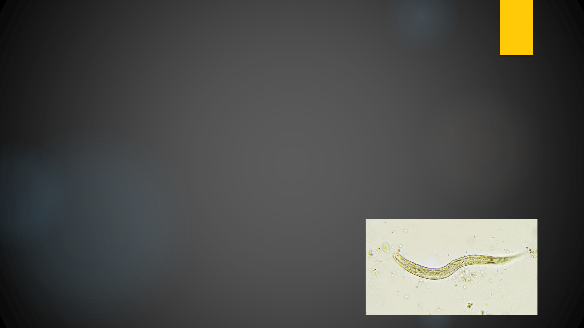 ESTRONGILOIDÍASE STRONGYLOIDES STERCORALIS TAXONOMIA Reino: Animalia; Filo: Namathelminthes; Classe: Nematoda; Ordem: Rhabiditida; Família: Strongyloididae; Gênero: Strongyloides (52 espécies); Espécie: Strongyloides Stercoralis. Distribuição Geográfica Stongyloides stercolares (Bavary,1876); Agente etiológico da Estrongiloidose; Strongiloides fuelleborni , presente na África e Ásia; Parasita macacos. MORFOLOGIA Cinco fases distintas: Fêmea partenogenética; Ovos; Larva rabditóide; Larva filarióide; Fêmea e macho de vida livre. Fêmea Partenogenética 2,0 mm de comprimento por 0,04 mm de diâmetro; Vivem na mucosa duodenal; Extremidade anterior arredondada(abertura bocal, esôfago e intestino); Órgãos reprodutivos: vulva, vagina, útero (1fileira de ovos); Extremidade posterior afilada(ânus); 30 a 40 ovos por dia. Ovos São elípticos, de parede final e transparente; 0,05mm de comprimento por 0,03mm de largura; 0,07mm de comprimento por 0,04 de largura (fêmea de vida livre). Larvas Rabditóides 250 µm de comprimento por 15 de espessura; Esôfago, vestíbulo bucal (vb) curto, intestino, primórdio genital (pg), cauda pontiaguda; Apresentam cutícula fina e hialina. Larvas Filarióides 500 µm de comprimento por 10 de largura; Apresentam esôfago, vestíbulo bucal (vb) curto e intestino terminado em ânus, um pouco distante da extremidade posterior; A porção anterior é ligeiramente afilada; Posterior afina-se gradualmente, terminando em duas pontas, conhecida como cauda entalhada(ca). Fêmea de vida livre 0,8 a 1,2mm de comprimento por 0,05 a 0,07 de largura; aspecto fusiforme, com extremidade anterior arredondada e posterior afiada; Aparelho digestivo simples, com boca (bo) ; esôfago curto, intestino simples; terminando no ânus; Aparelho genital contendo ovários, ovidutos, vulva(vu) e útero(ut) divergente, contendo até 28 ovos. Macho de vida livre Mede 0,7mm de comprimento por 0,04mm de largura; Aspecto fusiforme, com extremidade anterior arredondada e posterior recurvada ventral mente.. Boca(bo) , esôfago(es), intestino(in) terminando em cloaca(cl); Aparelho genital contendo testículos, vesícula seminal, canal deferente e canal ejaculador, que se abre na cloaca; Apresenta dois pequenos espículos, auxiliares na cópula. CICLO DE VIDA SINTOMAS Lesões cutâneas; Lesões pulmonares; Lesões intestinais. TRANSMISSÃO Heteroinfecção: Penetração da larva fêmea através da pele- pés descalços na terra molhada; Auto- infecção externa: Penetração da larva na região perianal de indivíduos infectados; Auto- infecção interna: As larvas podem se desenvolver no interior do intestino e penetrar nas mucosas do íleo ou do cólon. DIAGNÓSTICO Parasitológico de fezes; Através de fluídos corpóreos; Teste sorológico. TRATAMENTO Albendazol. PREVENÇÃO Higiene individual e coletiva; Educação ambiental; Saneamento básico; Lavar bem os alimentos. REFERÊNCIAS https://www.ebah.com.br/content/ABAAAAIBAAI/trab alho-strongyloides-stercoralis http://www.geocities.ws/ceueterra/strongyloides.htm Parasitose Dinamica/David Pereira Neves.-3.ed.-São Paulo:Atheneu,2009