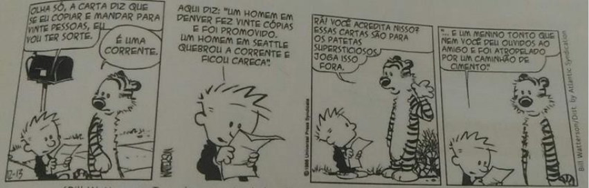 GRAMÁTICA 1 Sabemos que frase é a unidade de texto que numa situação de comunicação é capaz de transmitir um pensamento completo. A oração é o enunciado que se organiza em torno de um verbo. Leia a tira a seguir para responder às questões de 1 a 3. 1. Qual dos enunciados a seguir é uma frase e também uma oração a) Rá! b) Você acredita nisso? 2. Leia o trecho da fala de Calvin no 1º quadrinho: “A carta diz que se eu copiar e mandar para vinte pessoas, eu vou ter sorte”. a) Quantas orações há nessa frase? Lembre-se que cada verbo (ou locução verbal) indica a existência de uma oração. _____________________________________________________________________ b) Destaque os verbos ou locuções verbais existentes na frase supracitada. _____________________________________________________________________ 3. Leia estes dois enunciados: Um homem em Seattle quebrou a corrente e ficou careca. Essas cartas são para os patetas supersticiosos. a) Qual dos enunciados acima é um período simples? ________________________________________________________________________________ b) por que o outro enunciado é um período composto? ________________________________________________________________________________ 4. Leia o poema de Mário Quintana e responda: a) Qual é o assunto central do segundo verso do poema? ________________________________________________________________________________ b) O que se afirma a respeito dele? 5. Leia a tira abaixo. (Disponível em: https://docplayer.com.br/72172534-A-producao-de-significados-no-genero-tira-em-quadrinhos-um-estudo-da-multifuncionalidade-dos-usos-discursivos-do-e.html). a) No 2º quadrinho da tira, identifique o sujeito destas orações. ______________________________________________________________________________ b) Na oração “está fora da garantia”, no segundo quadrinho, o sujeito está implícito. Considerando apenas o contexto desse quadrinho, quem você imaginou que fosse o sujeito? c) Entretanto, quando lemos o último quadrinho, descobrimos a quem se refere a oração “está fora da garantia”. A quem se refere? ______________________________________________________________________________ 6. Você deverá pesquisar: 02 orações com exemplo de sujeito simples; 02 orações com exemplo de sujeito Composto; 02 orações com exemplo de sujeito oculto; 02 orações com exemplo de sujeito Indeterminado. 7. Indique o sujeito e o predicado das orações que você pesquisou na questão anterior.