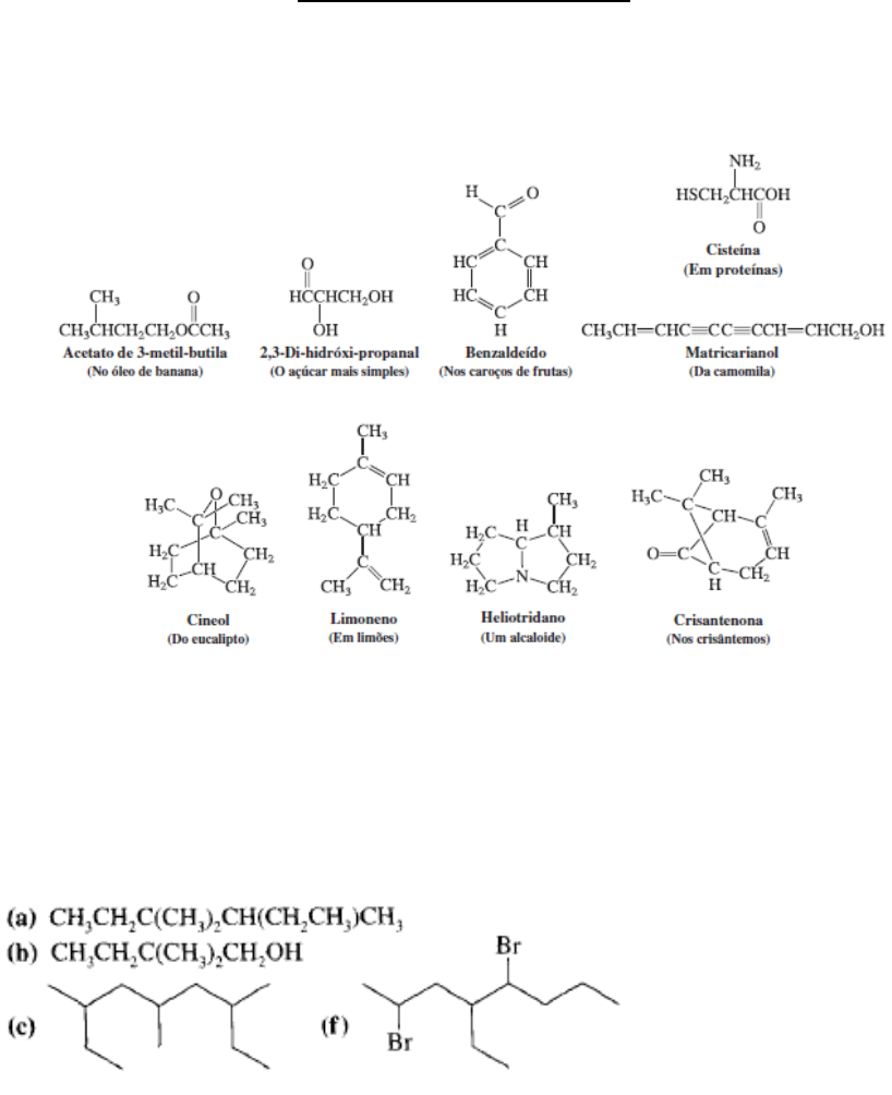 Prova 1 de Química Orgânica Questão 1 - Para cada um dos seguintes compostos de ocorrência natural, identifique a(s) classe(s) de compostos a que pertence e trace um círculo em volta de todos os grupos funcionais. (2,0) Questão 2 - Explique o tipo de hibridização apresentado pelo carbono no etano (C2H6), eteno (C2H4), etino (C2H2) e 1-2 propadieno (C3H4). Desenhe as moléculas destes hidrocarbonetos indicando os ângulos esperados de ligação e o formato geométrico da estrutura molecular. (2,0) Questão 3 – Dê os nomes IUPAC para cada um dos seguintes compostos: (2,0) Questão 4 - Desenhe as duas conformações do cis-1-cloro-2-metilciclohexano. Qual é a mais estável? Qual a menos estável? (2,0) Questão 5 – O iodo é capaz de reagir com o metano em condições propícias para formação de radicais, formando o iodo-metano e o iodeto de hidrogênio. Dê a equação geral da reação e escreva um mecanismo para este processo que inclua as etapas de iniciação, de propagação e de terminação. (2,0)