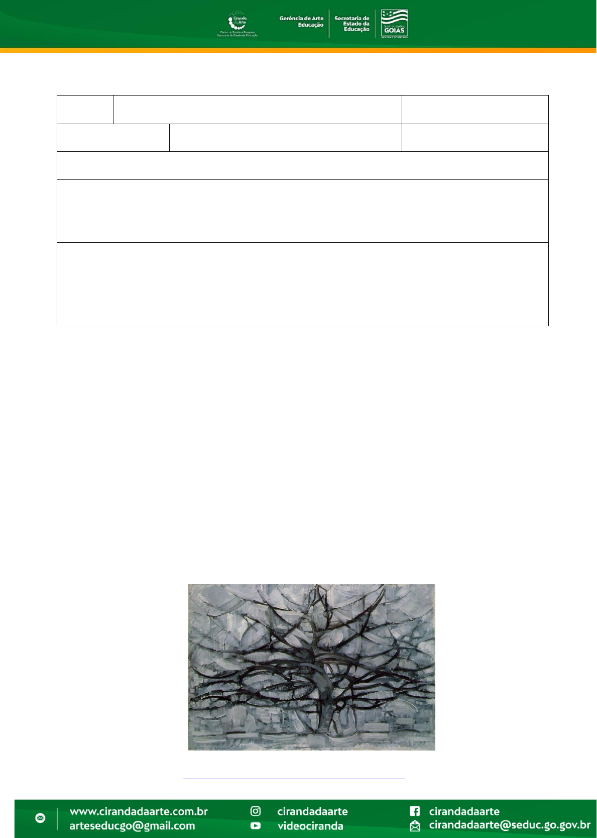 ATIVIDADE ARTE – ARTES VISUAIS Nome: Data: ___/___/2020 Unidade Escolar: Ano: 4º Componente Curricular: ARTE/ARTES VISUAIS Objeto de Conhecimento/Conteúdo: Elementos das Linguagens: Elementos constitutivos das artes visuais Contextos e Práticas: Patrimônio cultural material e imaterial Formas distintas das artes visuais tradicionais e contemporâneas locais, regionais e nacionais. Habilidades: (GO-EF04AR02-A) Explorar, reconhecer e produzir criativamente os elementos constitutivos das artes visuais, tais como: o ponto, a linha, a forma, a cor, o espaço, o movimento, a textura, os planos, a perspectiva, como componentes fundamentais para a composição e a criação artística em contextos variados e significativos, utilizando diferentes suportes e ferramentas. ATIVIDADE 003 Lembra-se da aula anterior? Você estudou sobre o elemento da linguagem visual LINHA! E dos artistas, se você conseguiu fazer a pesquisa sobre: Piet Mondrian, Joan Miró e Romero Britto... das obras de qual deles você mais gostou? Por quê? _________________________________________________________________________________ _________________________________________________________________________________ _________________________________________________________________________________ Hora de conhecer mais uma obra dos artistas! Observe nas pinturas abaixo o uso das linhas. Figura 1 – Mondrian - The Gray Tree, 1911 Acesso: https://www.todoestudo.com.br/artes/piet-mondrian (acesso 06/04/2020) https://www.todoestudo.com.br/artes/piet-mondrian https://www.todoestudo.com.br/artes/piet-mondrian https://www.todoestudo.com.br/artes/piet-mondrian https://www.todoestudo.com.br/artes/piet-mondrian https://www.todoestudo.com.br/artes/piet-mondrian Figura 2 – Joan Miró - O carnaval de Arlequim (1924-1925) Fonte: https://www.todamateria.com.br/joan-miro/ (acesso: 06/04/2020) Figura 3 – Romero Britto – Abraço, 2007 Fonte: https://www.culturagenial.com/romero-britto-obras-biografia/ (acesso 06/04/2020) A) Observe atentamente as figuras 1, 2 e 3 e descreva as imagens e figuras que você consegue identificar: FIGURA 1: __________________________________________________________________ ___________________________________________________________________________ ___________________________________________________________________________ FIGURA 2: __________________________________________________________________ ___________________________________________________________________________ ___________________________________________________________________________ FIGURA 3: __________________________________________________________________ ___________________________________________________________________________ ___________________________________________________________________________ https://www.todamateria.com.br/joan-miro/ https://www.todamateria.com.br/joan-miro/ https://www.todamateria.com.br/joan-miro/ https://www.todamateria.com.br/joan-miro/ https://www.todamateria.com.br/joan-miro/ https://www.culturagenial.com/romero-britto-obras-biografia/ https://www.culturagenial.com/romero-britto-obras-biografia/ https://www.culturagenial.com/romero-britto-obras-biografia/ https://www.culturagenial.com/romero-britto-obras-biografia/ https://www.culturagenial.com/romero-britto-obras-biografia/ https://www.culturagenial.com/romero-britto-obras-biografia/ https://www.culturagenial.com/romero-britto-obras-biografia/ https://www.culturagenial.com/romero-britto-obras-biografia/ B) Escolha dois objetos de locais diferentes da sua casa (por exemplo: um da cozinha = jarra/panela/torneira da pia e outro do seu quarto = cadeira/guarda roupas/cama) e faça desenhos de observação no espaço abaixo, preste atenção aos formatos das linhas e use cores. C) De acordo com o estilo de Romero Britto, usando muitas linhas e cores, faça o desenho do seu brinquedo favorito! Coloque um título no seu trabalho artístico.