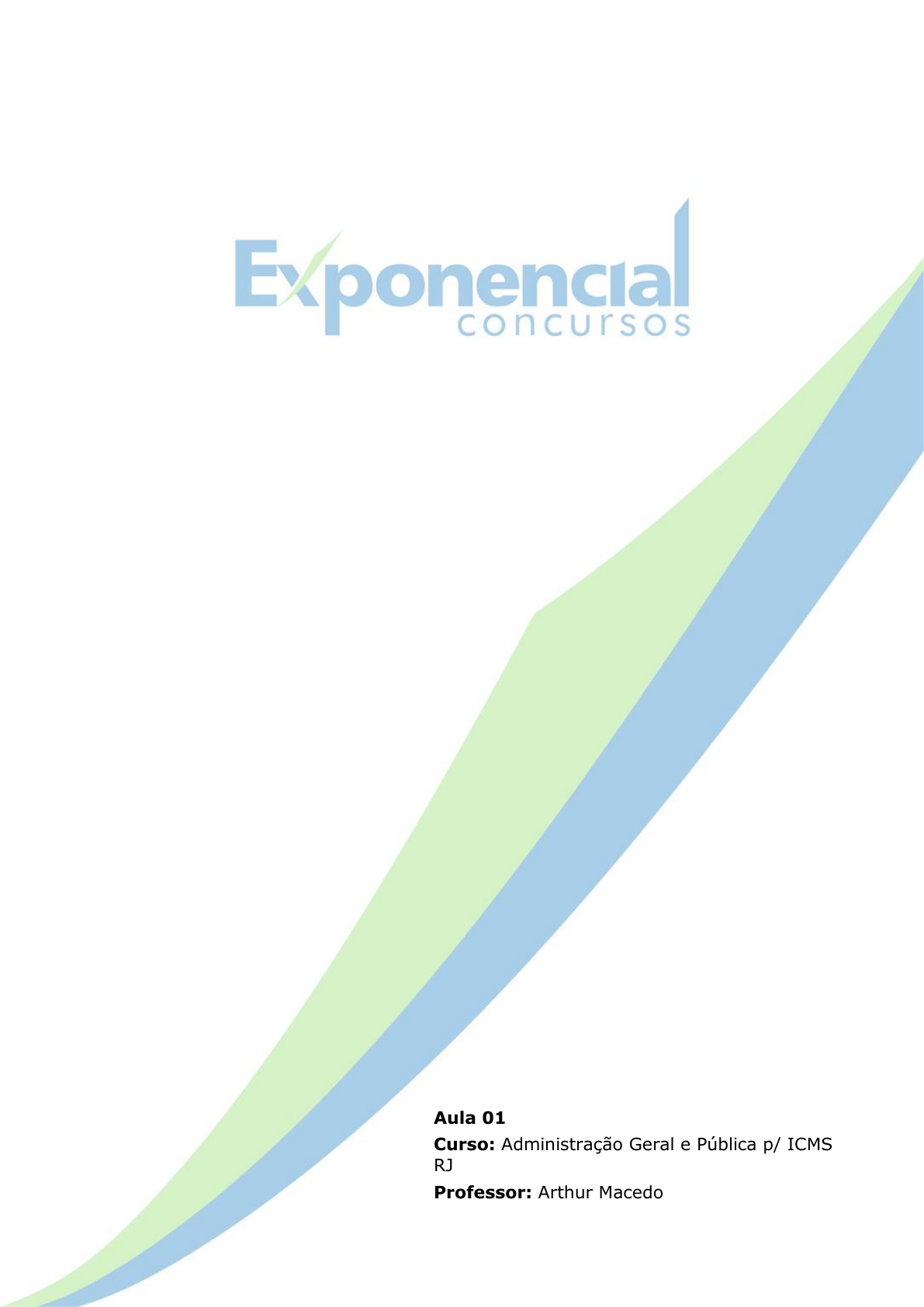 Curso: Administração Geral e Pública p/ ICMS RJ Teoria e Questões comentadas Prof. Arthur Macedo - Aula 01 Prof. Arthur Macedo 1 de 40 www.exponencialconcursos.com.br Aula 01 Curso: Administração Geral e Pública p/ ICMS RJ Professor: Arthur Macedo D ire ito s au to ra is r es er va do s (L ei 9 61 0/ 98 ). P ro ib id a a re pr od uç ão , v en da o u co m pa rt ilh am en to d es te a rq ui vo . U so in di vi du al . Curso: Administração Geral e Pública p/ ICMS RJ Teoria e Questões comentadas Prof. Arthur Macedo - Aula 01 Prof. Arthur Macedo 2 de 40 www.exponencialconcursos.com.br Assunto Página 1- Introdução 03 2- Era Clássica 04 3- Era Neoclássica 14 4- Processos gerenciais 21 5- Resumo da evolução do conhecimento administrativo 23 6- Questões comentadas 24 7- Lista de exercícios 34 8- Gabarito 40 Olá, futuros auditores e auditoras! Vamos começar nossa Aula 01 do curso de Administração Geral e Pública para o ICMS-RJ. Faremos um apanhado histórico do pensamento administrativo. Como todo estudo histórico tende a ser cansativo, vamos usar e abusar dos esquemas para facilitar a sua vida. Também trataremos, no último tópico da aula, sobre os processos gerenciais nas organizações. São temas que vocês vão assimilar com tranquilidade, principalmente depois de fixar o conteúdo com os exercícios. Qualquer dúvida, estou à disposição para ajudá-los! Estão prontos? Simbora!!! Abraços, Arthur Macedo Aula 01 – Natureza e evolução do conhecimento administrativo. Processos gerenciais e as relações com os fatores humanos, tecnológicos e econômicos. D ire ito s au to ra is r es er va do s (L ei 9 61 0/ 98 ). P ro ib id a a re pr od uç ão , v en da o u co m pa rt ilh am en to d es te a rq ui vo . U so in di vi du al . Curso: Administração Geral e Pública p/ ICMS RJ Teoria e Questões comentadas Prof. Arthur Macedo - Aula 01 Prof. Arthur Macedo 3 de 40 www.exponencialconcursos.com.br Administrar é tarefa do ser humano mesmo antes da noção de civilização. É algo natural, mas que precisou ser formatada e modernizada através dos tempos, de acordo com a evolução do homem e do meio. Para que chegássemos à maturidade estrutural do estudo da administração, esta sofreu influência desde os filósofos gregos, passando pela igreja católica, as organizações militares, e, principalmente, a revolução industrial e os economistas liberais do século XVIII. Bom, de acordo com Chiavenato (2000), um dos grandes estudiosos brasileiros contemporâneos da ciência da administração, a principal tarefa da administração é a de "interpretar os objetivos propostos pela organização e transformá-los em ação organizacional por meio do planejamento, organização, direção e controle de todos os esforços realizados em todas as áreas e em todos os níveis da organização, a fim de alcançar tais objetivos da maneira mais adequada à situação". Vamos ver dois esquemas com as funções básicas da administração, ou ciclo administrativo (o famoso PODC), e as cinco variáveis principais da teoria geral da administração: AS CINCO VARIÁVEIS BÁSICAS DA TEORIA GERAL DA ADMINISTRAÇÃO Funções Básicas da Administração Planejar Organizar Dirigir Controlar Tarefas Estrutura TecnologiaPessoas Ambiente 1- INTRODUÇÃO D ire ito s au to ra is r es er va do s (L ei 9 61 0/ 98 ). P ro ib id a a re pr od uç ão , v en da o u co m pa rt ilh am en to d es te a rq ui vo . U so in di vi du al . Curso: Administração Geral e Pública p/ ICMS RJ Teoria e Questões comentadas Prof. Arthur Macedo - Aula 01 Prof. Arthur Macedo 4 de 40 www.exponencialconcursos.com.br (FCC - Analista Judiciário - TRE/BA - 2003) As funções administrativas são: a) direção, controle, investigação e liderança b) previsão, investigação, liderança e motivação c) coordenação, previsão, planejamento e controle d) planejamento, organização, direção e controle e) organização, coordenação, investigação e previsão. Resolução: Achou fácil a questão? Mas é assim mesmo que nossa banca costuma cobrar quando se trata de funções administrativas. No máximo, o que pode ocorrer é uma "floreada" no enunciado e nas assertivas, mas não vai fugir muito disso. Resposta da questão: alternativa D. Com esse breve entendimento, vamos partir para o estudo histórico do pensamento administrativo, passando pelas eras clássica e neoclássica - desde a administração científica até a teoria. Por fim, voltaremos ao "PODC" e veremos os processos gerenciais e as relações com os fatores humanos, tecnológicos e econômicos. 2.1. Administração Científica A escola da Administração Científica foi desenvolvida pelo norte- americano Frederick Taylor, no final do século XIX, com o surgimento de grandes organizações e o aumento da complexidade das atividades por elas executadas. Tinha ênfase nas tarefas e a preocupação de eliminar o desperdício e elevar a produtividade mediante a aplicação de técnicas de engenharia industrial. Administração Científica Ênfase nas tarefas Eliminar o desperdício Elevar a produtuvidade 2- ERA CLÁSSICA D ire ito s au to ra is r es er va do s (L ei 9 61 0/ 98 ). P ro ib id a a re pr od uç ão , v en da o u co m pa rt ilh am en to d es te a rq ui vo . U so in di vi du al . Curso: Administração Geral e Pública p/ ICMS RJ Teoria e Questões comentadas Prof. Arthur Macedo - Aula 01 Prof. Arthur Macedo 5 de 40 www.exponencialconcursos.com.br Num primeiro momento, Taylor voltou-se para a racionalização do trabalho, determinando um padrão médio de produtividade dos operários (a "mais-valia"), o estudo dos tempos e movimentos, e ocorria a divisão de responsabilidades, conforme esquemas a seguir: Já num segundo momento, Taylor preocupou-se em definir os princípios da administração, que, segundo ele, eram quatro: Gerentes: - Planejar - Supervisionar Trabalhadores de linha de produção: Executar as tarefas O b je ti v o s d o