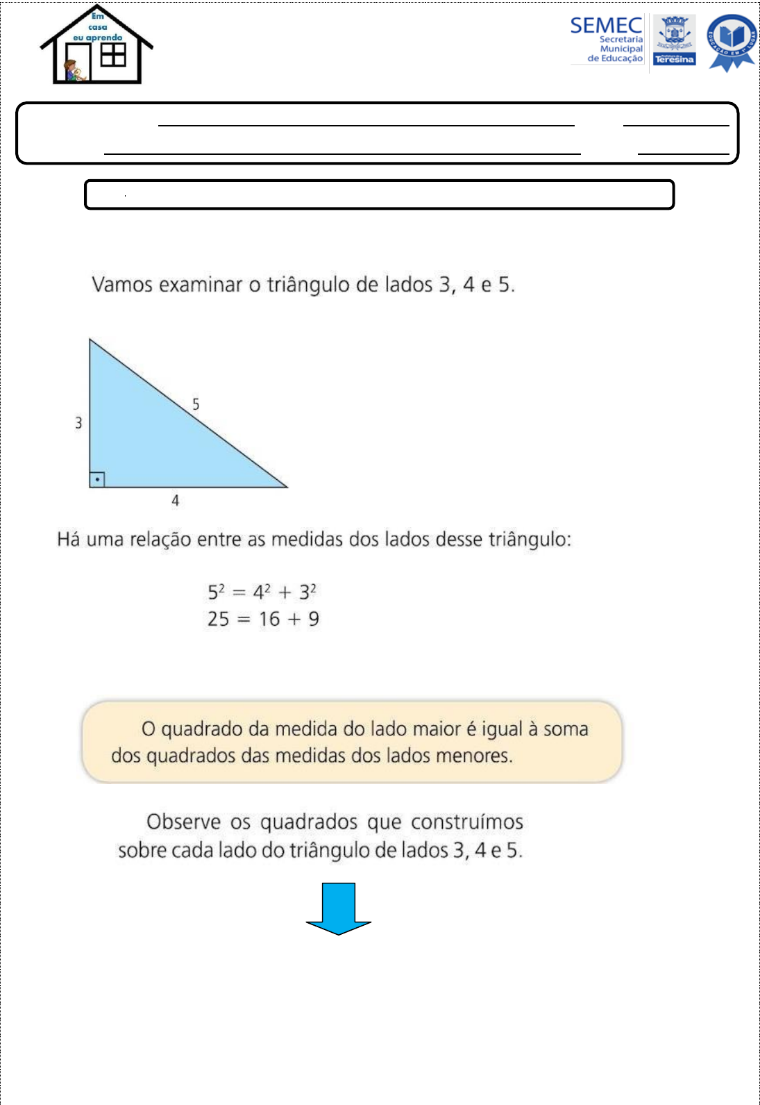 Escola Municipal Turno: Aluno (a): Turma: ATIVIDADE – TEOREMA DE PITÁGORAS O Teorema de Pitágoras tem muitas aplicações. Veja o exemplo: Responda as seguintes questões no caderno: 01. Um suporte de prateleira foi projetado com a forma de um triângulo retângulo como mostra a figura abaixo. Qual deve ser a medida (x) da barra de sustentação dessa prateleira? A) 30 cm B) 40 cm C) 50 cm D) 70 cm 02. A figura mostra um edifício que tem 15m de altura. Qual é o comprimento da escada que está encostada na parte superior do prédio? A) 30 m. B) 15 m. C) 17 m. D) 20 m. 03. Um bambu partiu-se a uma altura de 4m do chão, e a parte de cima, ao cair, tocou o chão, a uma distância de 3m da base do bambu. Qual era a altura do bambu antes de partir-se? A) 7m B) 5m C) 8m D) 9m 04. Quantos metros de fio são necessários para “puxar luz” de um poste de 6m de altura até a caixa de luz que está ao lado da casa e a 8m da base do poste? A)10m B)12m C)14m D)20m 05. Qual é o valor de h? A) 1,8m B) 2,0m C) 2,4m D) 2,8m 06. Durante um incêndio em um edifício residencial, os bombeiros utilizaram uma escada Magirus de 10m para atingir a janela de um dos apartamentos incendiados. A escada estava colocada a 1m do chão, sobre um caminhão que se encontrava afastado 6m do edifício. Qual é a altura desse apartamento em relação ao chão? A) 7m B) 8m C) 9m D) 10m 07. Na situação do esquema da figura, deseja-se construir uma estrada que ligue a cidade A à estrada BC, com o menor comprimento possível. Essa estrada medirá em quilômetros: A) 24 B) 28 C) 30 D) 32 E) 40 08. Observe na figura os três quadrados identificados por I , II e III. Se a área do quadrado I é 36cm² e área do quadrado II é 100cm² qual é, em centímetros quadrados, a área do quadrado III? A) 64 B) 81 C) 49 D) 60 E) 80