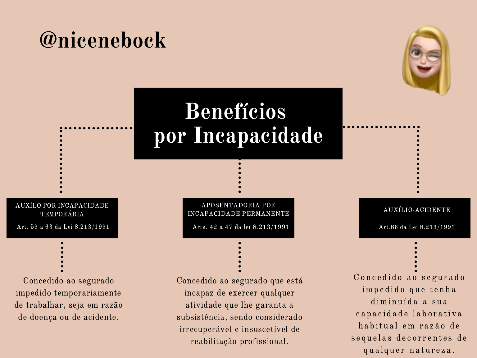 Benefícios por Incapacidade @nicenebock AUXÍLO POR INCAPACIDADE TEMPORÁRIA Art. 59 a 63 da Lei 8.213/1991 Concedido ao segurado impedido temporariamente de trabalhar, seja em razão de doença ou de acidente. APOSENTADORIA POR INCAPACIDADE PERMANENTE Arts. 42 a 47 da lei 8.213/1991 Concedido ao segurado que está incapaz de exercer qualquer atividade que lhe garanta a subsistência, sendo considerado irrecuperável e insuscetível de reabilitação profissional. AUXÍLIO-ACIDENTE Art.86 da Lei 8.213/1991 C o n c e d i d o a o s e g u r a d o i m p e d i d o q u e t e n h a d i m i n u í d a a s u a c a p a c i d a d e l a b o r a t i v a h a b i t u a l e m r a z ã o d e s e q u e l a s d e c o r r e n t e s d e q u a l q u e r n a t u r e z a . Auxílio por incapacidade temporária @nicenebock Doença que não possui relação com o trabalho. NATUREZA PREVIDENCIÁRIA – B31 Não há estabilidade após o retorno ao emprego, bem como o empregador não é obrigado a depositar o FGTS enquanto o trabalhador ficar afastado recebendo o benefício; NATUREZA ACIDENTÁRIA – B91 Decorre de acidente de trabalho ou doença profissional Há estabilidade por 12 meses após retorno ao emprego, bem como o empregador é obrigado a depositar o FGTS . C o n c e d i d o a o s e g u r a d o q u e e s t á i n c a p a z d e e x e r c e r q u a l q u e r a t i v i d a d e q u e l h e g a r a n t a a s u b s i s t ê n c i a , s e n d o c o n s i d e r a d o i r r e c u p e r á v e l e i n s u s c e t í v e l d e r e a b i l i t a ç ã o p r o f i s s i o n a l . I m p o r t a n t e Aposentadoria por incapacidade permanente @nicenebock O a p o s e n t a d o p o r i n v a l i d e z p o d e s e r c o n v o c a d o a q u a l q u e r m o m e n t o p a r a a v a l i a ç ã o d a s c o n d i ç õ e s q u e e n s e j a r a m a c o n c e s s ã o d o b e n e f í c i o , a e x c e ç ã o d e a l g u m a s h i p ó t e s e s : 1- Segurados que, após completarem 55 anos de idade E quando decorridos 15 anos da data da concessão do benefício (ou do auxílio-doença que o precedeu); 2- Após completarem 60 anos de idade; 3- Pessoa portadora de HIV/Aids. E x i g e - s e , p a r a c o n c e s s ã o d o a u x í l i o - a c i d e n t e , a e x i s t ê n c i a d e l e s ã o , d e c o r r e n t e d e a c i d e n t e d e t r a b a l h o , q u e i m p l i q u e r e d u ç ã o d a c a p a c i d a d e p a r a o l a b o r h a b i t u a l m e n t e e x e r c i d o . O n í v e l d o d a n o e , e m c o n s e q u ê n c i a , o g r a u d o m a i o r e s f o r ç o , n ã o i n t e r f e r e m n a c o n c e s s ã o d o b e n e f í c i o , o q u a l s e r á d e v i d o a i n d a q u e m í n i m a a l e s ã o . I m p o r t a n t e Auxílio-acidente @nicenebock C o n c e d i d o a o s e g u r a d o i m p e d i d o q u e t e n h a d i m i n u í d a a s u a c a p a c i d a d e l a b o r a t i v a h a b i t u a l e m r a z ã o d e s e q u e l a s d e c o r r e n t e s d e q u a l q u e r n a t u r e z a .