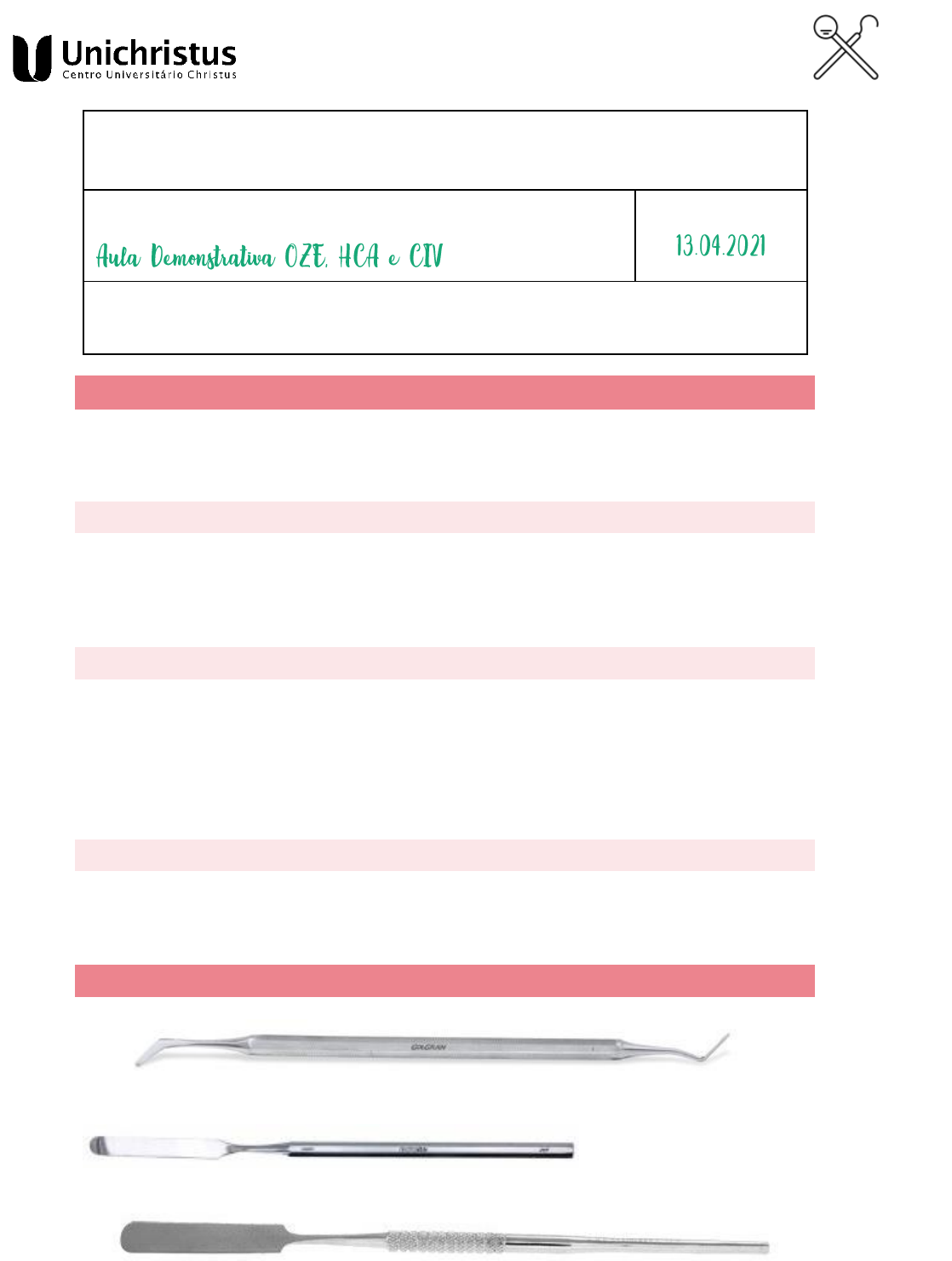 CURSO DE ODONTOLOGIA Aluna: Camila Mourão de Figueiredo Lima ATIVIDADE REALIZADA: Data: Professor(a): Camila Carvalho, Daniela Bezerra, Mayra Moura, Vilana Araújo, Breno Benevides e Jiovanne Neri. OBJETIVO Demonstrar a manipulação dos materiais que fazem parte da proteção do complexo dentino-pulpar. Foi apresentado três situações: 1° S ITUAÇÃO – CAPEAMENTO PULPAR D IRETO Paciente chegou ao posto de saúde para realizar uma restauração, pois apresentava uma uma cárie muito profunda. E durante a remoção da lesão de cárie, o cirurgião-dentista acabou chegando à polpa, ocorrendo uma exposição pulpar. 2° SITUAÇÃO – CAPEAMENTO PULPAR INDIRETO Paciente chegou à unidade de saúde sentindo um pouco de incômodo, dor passageira ao estímulo gelado e quando comia alimentos doces. O quadro era de uma cavidade extensa e com cárie. Quando o cirurgião dentista foi remover o tecido cariado, percebeu que era uma cavidade muito profunda porém, sem exposição pulpar. O profissional também optou por deixar a dentina afetada. 3° SITUAÇÃO - Paciente com lesão de cárie na oclusal e quando o cirurgião-dentista estava removendo a lesão cariosa, percebeu que ficou com a cavidade profunda. Tratamento expectante INTRUMENTOS UTILIZADOS Espátula N°1 Espátula N°24 Espátula N°36 Portifólio Pré Clínica I Espátula de HCA Seringa Centrix Placa de vidro Verniz MOMENTO PRÁTICA CASO 1 – Capeamento Direto Aplicar o hidróxido de cálcio (PA) em pasta (pó + água destilada) ou apenas o pó diretamenta na exposição pulpar, com o auxílio de uma espátula ou porta amálgama. Deve espalhar apenas na região de exposição pulpar; Unir a pomada base e catalisadora, para formar o Cimento de Hidróxido de Cálcio, sua manipulação com a Espátula N°24; Aplicar o Cimento de Hidróxido de Cálcio na cavidade, uma fina camada, com o aplicador de HCA; Após foi aplicado como material restaurador provisório, o Óxido de Zinco e Eigenol (OZE); Para a preparação do OZE (com a espátula N° 24 para tirar o excesso do dosador de pó), efetuar a manipulação na placa de vidro com o auxílio da espátula N°36 ou N°24; Utilizar a espátula N°1 para aplicar o OZE na cavidade do dente. Esperar de 45 a 60 dias para o retorno do paciente. CASO 2 – Capeamento Indireto No momento que o cirurgião-dentista estava retirando a lesão cariada, ele deixou a dentina afetada para não expor a polpa e para que ocorra uma remineralização da d. afetada; Aplicar o Cimento de Hidróxido de Cálcio (catalizador + base) para estimular a remineralização da dentina; Para inserir o Cimento de Hidróxido de Cálcio, apenas no fundo da cavidade, utilizar a Espátula de HCA; Após esse processo, fazer a preparação do Cimento de Ionômero de Vidro (Vidrion R). Aplicar o pó e as gotas (bem dosadas) na placa de vidro e efetuar a mistura até incorporar todo o pó e líquido sem perder o brilho; Antes de inserir o CIV, aplicar o Condicionamento ácido (Ác. Poliacrílico) para limpar a cavidade e deixar o cálcio do dente mais livres para reagir com o CIV; Aplicar o CIV na cavidade com o auxílio de Espátula N°1 ou Seringa Centrix; Após esse processo, aplicar um tipo de verniz (esmalte de unha) para proteger o CIV de sinérise ou embebição; Jatinho de ar para secar o verniz Esperar 45 dias para o retorno do paciente. CASO 3 – restauração definitiva direto Será utilizado o CIVMR como base da restauração (sua manipulação deve ser de acordo com o fabricante) com o auxílio da Seringa Centrix; Aplicar o primer com micro brush Jogar o ar Fazer a polimerização Realizar a manipulação do CIVMR (pó + líquido, até a sua aglutinação) Aplicar o CIVMR na cavidade apenas como base Polimerizar por 40 segundos E depois, realizar o protocolo para a aplicação de resina composta.
