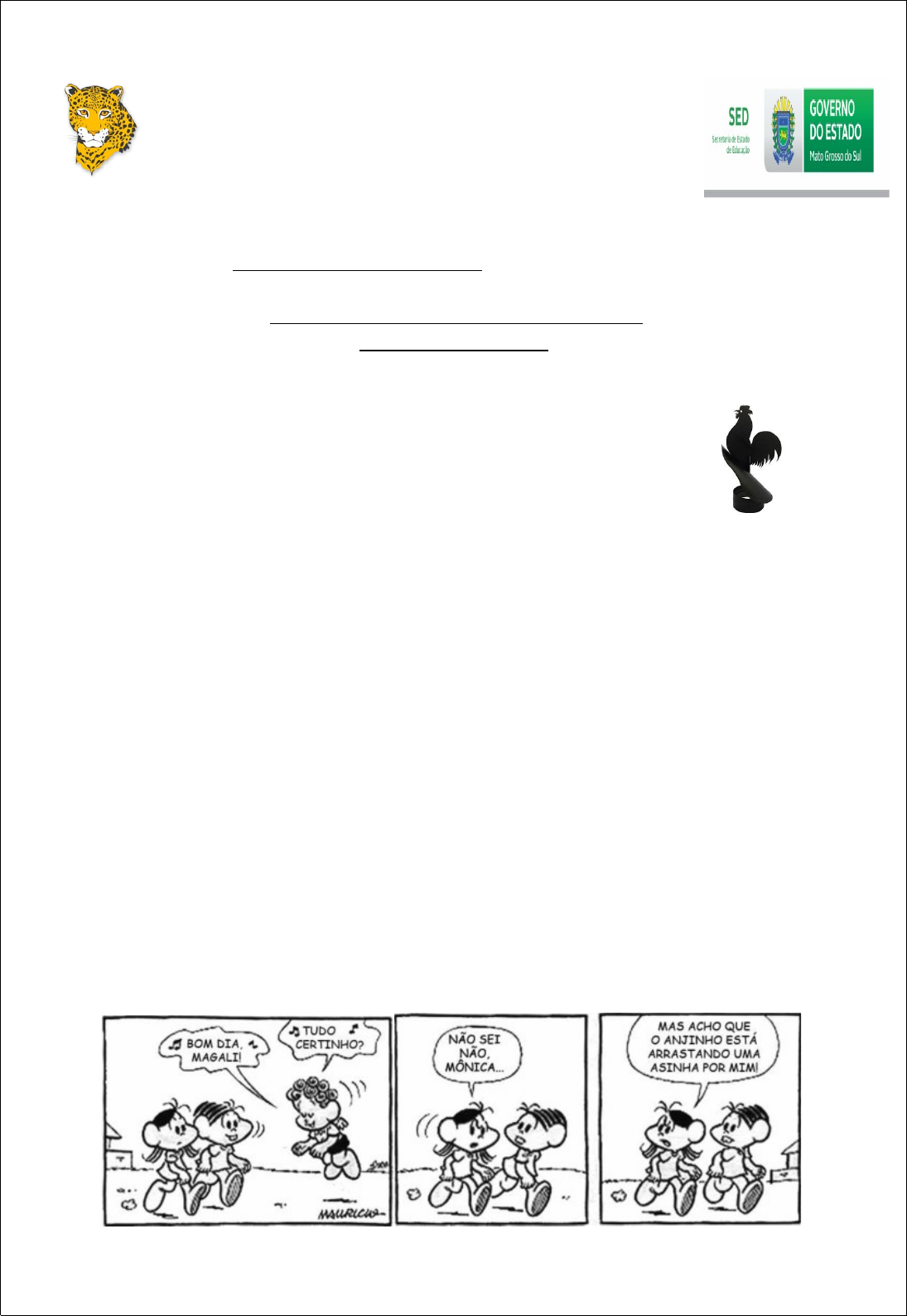1 Escola Estadual Maria Corrêa Dias Anastácio/MS,____de__________ de 2021. Professor:____________________________________________________ Aluno:________________________________________ 6º ano (EF) Blog da escola: www.eemcd.blogspot.com.br AVALIAÇÃO DIAGNÓSTICA 2021 Língua Portuguesa (Reforço Digital – RJ). Leia o texto a seguir e responda. Galo de campina O galo de campina, conhecido na Amazônia por tangará, pertence à família do cardeal. Suas penas são escuras, mas a cabeça e o pescoço são vermelhos. Alimenta-se de sementes, frutinhas e insetos. Vive em bandos nas caatingas do Nordeste e no Brasil Central, do mesmo jeito que outro pássaro, o currupião. Os dois são considerados as mais belas aves da região. O galo de campina não canta quando está engaiolado. Só canta em liberdade, numa certa época do ano, e de manhã bem cedinho. Em Alagoas, onde ele tem fama de cantor, é treinado e vendido a preços muito elevados. Secretaria da Educação/FDE. Ler e escrever: livro de textos do aluno. São Paulo, 2008. 01) De acordo com o texto, o galo de campina tem fama de cantor A) no Brasil Central. B) na Amazônia. C) no Nordeste. D) em Alagoas. (SAERJ). Leia o texto abaixo. SOUZA, Mauricio de. Mônica tem uma novidade. Porto Alegre: L&PM.1984. p. 81. 02-No último quadrinho, a expressão “arrastando uma asinha” sugere que o anjinho A) arrasta as asas no chão. B) bate suas asas no ar. C) está apaixonado pela menina. D) está com a asinha quebrada. (SAERO). Leia o texto abaixo. Quem ama vacina Terezinha Vieira da Rocha* O que você, mamãe, que acaba de trazer ao mundo um ser tão especial, seu filho, precisa saber sobre vacinas. Tomar vacina dói? Sim. Dói, mas é uma dor muito pequena se comparada ao trauma de uma internação por doenças que podem ser evitadas com a vacina. Trabalho e não tenho tempo de levar meu filho para vacinar. O ideal é que você, mamãe, esteja com seu bebê, principalmente no momento da 1ª vacina. Ele sentirá mais seguro no seu colo, e as informações passadas a você, sobre as vacinas pelos profissionais de saúde, são muito importantes, mas, se ficar difícil para você compartilhar com seu filho este momento, peça a um parente, vizinho, ou a uma pessoa de sua confiança para levá-lo ao Centro de Saúde mais perto de sua casa. O importante é que no dia marcado sua criança receba as vacinas de acordo com o calendário vacinal. Se no dia marcado for Sábado, Domingo ou feriado, leve-o um dia antes ou um dia depois. Disponível em: <http://www.pbh..gov.br/smsa/biblioteca/saudedigital/dezembro/folder.html>. 03-Esse texto foi escrito para A) filhos. B) mães. C) médicos. D) pais. (SAEMI - PE). Leia o texto abaixo. Piçanho-barreteiro, um passarinho prevenido Quando captura uma presa esse passarinho a espeta com seu bico num espinho de um arbusto. Arrasador, ele também atravessa insetos sobre arames farpados. Desse modo, cria sua própria despensa, recorrendo a ela para se abastecer de acordo com a sua necessidade. CUNHA, M. Recordes dos animais – fatos e curiosidades. São Paulo: Girassol. p. 101, 2009. 04-De acordo com esse texto, o que faz o passarinho ser prevenido? A) Andar sobre arames farpados. B) Capturar apenas os insetos. C) Espetar os insetos com o bico. D) Guardar alimentos para depois. (SAEPE). Leia o texto abaixo. Conto de todas as cores Eu já escrevi um conto azul, vários até. Mas este é um conto de todas as cores. Porque era uma vez um menino azul, uma menina verde, um negrinho dourado e um cachorro com todos os tons e entretons do arco-íris. Até que apareceu uma Comissão de Doutores – os quais, por mais que esfregassem os nossos quatro amigos, viram que não adiantava. E perguntaram se aquilo era de nascença ou se... — Mas nós não nascemos – interrompeu o cachorro. – Nós fomos inventados! QUINTANA, Mário. A vaca e o hipogrifo. 3 ed. Porto Alegre, L&P, 1979. 05-Nesse texto, o narrador é um A) cachorro. B) doutor. C) escritor. D) menino. 1