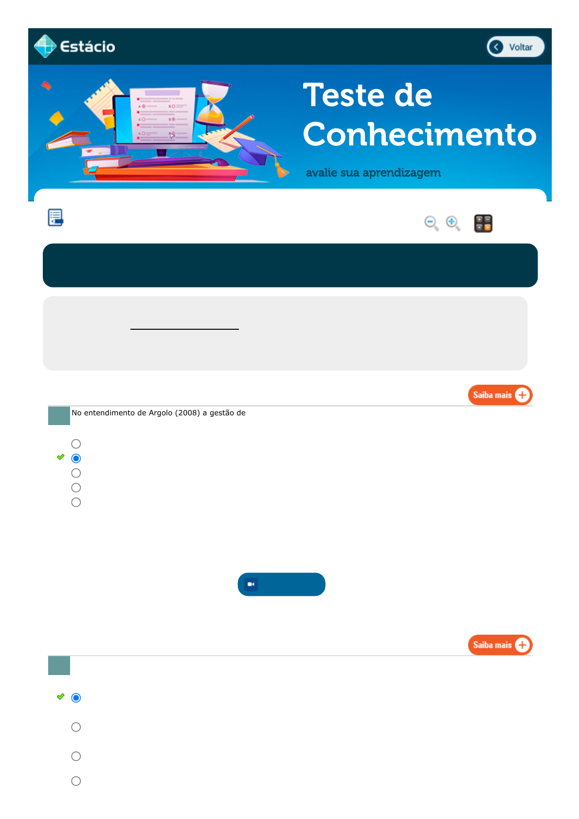 19/04/2021 Estácio: Alunos https://simulado.estacio.br/alunos/ 1/5 Teste de Conhecimento avalie sua aprendizagem No entendimento de Argolo (2008) a gestão de Desempenho /Potencial é um processo ligado ao âmbito da _______________. Referente ao cargo de trainee podemos afirmar que: PLANEJAMENTO DE RECURSOS HUMANOS Lupa Calc. GST1726_A5_201908194596_V1 Aluno: JÉSSICA BOAVENTURA Matr.: 201908194596 Disc.: PLANEJ.RECUR.HUM 2021.1 EAD (GT) / EX Prezado (a) Aluno(a), Você fará agora seu TESTE DE CONHECIMENTO! Lembre-se que este exercício é opcional, mas não valerá ponto para sua avaliação. O mesmo será composto de questões de múltipla escolha. Após responde cada questão, você terá acesso ao gabarito comentado e/ou à explicação da mesma. Aproveite para se familiarizar com este modelo de questões que será usado na sua AV e AVS. 1. Gestão de clima organizacional Gestão de pessoas Área de treinamento e desenvolvimento Gestão de remuneração Área de recrutamento e seleção Explicação: o entendimento de Argolo (2008) a gestão de Desempenho /Potencial é um processo ligado ao âmbito da Gestão de Pessoas Gabarito Comentado 2. Costuma ter duração de 1 a 3 anos, período em que o funcionário tem um tutor, recebe treinamentos e participa de cursos voltados à gestão de sua carreira, conhecimento de processos de uma ou mais áreas da empresa e à gerência de pessoas. É o procedimento que consiste no provimento de informação a uma pessoa sobre o desempenho, conduta ou eventualidade executada por ela que objetiva reprimir, reorientar e/ou estimular uma ou mais ações determinadas executadas anteriormente. É um estudante complementando sua formação profissional e não um profissional já pronto para atuar no mercado. Dessa forma, esse profissional deve contemplar essa peculiaridade no tratamento das relações entre ele e a empresa, no qual é orientado para a elaboração das atividades a serem executadas. As habilidades consideradas inatas podem ser desenvolvidas caso haja motivação e com a aplicação de técnicas apropriadas utilizando teorias apenas práticas e disciplinar. javascript:voltar(); javascript:voltar(); javascript:duvidas('246730','7499','1','3735165','1'); javascript:duvidas('1161437','7499','2','3735165','2'); javascript:diminui(); javascript:aumenta(); javascript:calculadora_on(); 19/04/2021 Estácio: Alunos https://simulado.estacio.br/alunos/ 2/5 ROMEU, GERENTE DE RH DA FISH LTDA., SOLICITOU À ÁREA DE TECNOLOGIA DA EMPRESA O DESENVOLVIMENTO DE UM BANCO DE DADOS PARA UTILIZAR NA GESTÃO DE DESEMPENHO DA EMPRESA. VOCÊ CONSIDERA QUE ROMEU AGIU CORRETAMENTE POR QUE: XAVIER, O GERENTE DE RH DA CIA. TALENTO LTDA., DURANTE UMA REUNIÃO COM GESTORES DA ÁREA DE PRODUÇÃO DA EMPRESA APRESENTOU O PROGRAMA DE GESTÃO DE DESEMPENHO QUE ESTAVA SENDO IMPLANTADO NA EMPRESA. MARQUE ENTRE AS ALTERNATIVAS ÀQUELA QUE VOCÊ CONSIDERA A QUE MELHOR DEFINE UM PROGRAMA DESSE TIPO: Deve ser contemplado como um procedimento didático que conduz o aluno a situar, observar e aplicar criteriosa e reflexivamente, princípios e referenciais teóricos-práticos assimilados através do curso, numa visão multidisciplinar, sem perder de vista a realidade na qual se encontra inserido. Explicação: O cargo de trainee costuma ter duração de 1 a 3 anos, período em que o funcionário tem um tutor, recebe treinamentos e participa de cursos voltados à gestão de sua carreira, conhecimento de processos de uma ou mais áreas da empresa e à gerência de pessoas. Ao término do período, o funcionário terá um cargo mais alto e consequente maior remuneração se comparado a um empregado/ funcionário semelhante que não tenha participado do processo. 3. A REALIDADE DAS ORGANIZAÇÕES NO MUNDO CORPORATIVO EXIGE QUE A EMPRESA ESTEJA SE ATUALIZANDO NO USO DE NOVAS TECNOLOGIAS NA ADMINISTRAÇÃO DE SEUS RECURSOS HUMANOS ESSE BANCO DE DADOS VAI SER USADO PARA OS GERENTES CONTROLAREM MELHOR SEUS SUBORDINADOS E, ASSIM, PODER RECOMPENSÁ-LOS OU PUNI-LOS DE ACORDO COM SEUS RESULTADOS ESSE BANCO DE DADOS VAI SER USADO PELA ÁREA DE REMUNERAÇÃO DA EMPRESA PARA ESTABELECER NOVOS PATAMARES SALARIAIS EM FUNÇÃO DO ALCANCE DAS METAS ORGANIZACIONAIS ESSE BANCO DE DADOS VAI SER USADO PARA GERAR UM MAPA DE TALENTOS E DE POTENCIAIS, ONDE OS CRITÉRIOS DO DESEMPENHO SUPERIOR FICAM MAIS CLAROS E TRANSPARENTES PARA TODOS OS ENVOLVIDOS NO PROCESSO EM EXPERIÊNCIAS ANTERIORES OS RESULTADOS NÃO FORAM SATISFATÓRIOS DEVIDO A NÃO SE TER DESENVOLVIDO ESSE BANCO DE DADOS QUE POSSIBILITARIA O CONTROLE DO PESSOAL OPERACIONAL DAS ÁREAS FINS DA EMPRESA Explicação: ROMEU, GERENTE DE RH DA FISH LTDA., SOLICITOU À ÁREA DE TECNOLOGIA DA EMPRESA O DESENVOLVIMENTO DE UM BANCO DE DADOS PARA UTILIZAR NA GESTÃO DE DESEMPENHO DA EMPRESA. VOCÊ CONSIDERA QUE ROMEU AGIU CORRETAMENTE PORQUE ESSE BANCO DE DADOS VAI SER USADO PARA GERAR UM MAPA DE TALENTOS E DE POTENCIAIS, ONDE OS CRITÉRIOS DO DESEMPENHO SUPERIOR FICAM MAIS CLAROS E TRANSPARENTES PARA TODOS OS ENVOLVIDOS NO PROCESSO. 4. A ORGANIZAÇÃO, CONTROLE E ACOMPANHAMENTO DAS ATIVIDADES DESENVOLVIDAS POR MEIO DA ESQUEMATIZAÇÃO DE FEEDBACK DAS CHEFIAS, AOS SEUS SUBORDINADOS, DO ALCANCE DAS METAS ORGANIZACIONAIS O PLANEJAMENTO, ORGANIZAÇÃO E CONTROLE DAS ATIVIDADES E DA MELHORIA DOS RECURSOS MATERIAIS DA ORGANIZAÇÃO POR MEIO DA AQUISIÇÃO DE MAQUINÁRIO E A INFORMATIZAÇÃO DOS PROCESSOS ADMINISTRATIVOS O PLANEJAMENTO, ORGANIZAÇÃO, CONTROLE E ACOMPANHAMENTO DAS ATIVIDADES DE RECURSOS HUMANOS, NOTADAMENTE LIGADAS AO ALCANCE DAS METAS E DIRETRIZES ESTABELECIDAS PELA ORGANIZAÇÃO A ESTRUTURAÇÃO, IMPLANTAÇÃO E ORGANIZAÇÃO DE UM SISTEMA DE AVALIAÇÃO DE DESEMPENHO QUE POSSA FORNECER SUBSÍDIOS ÀS CHEFIAS PARA VERIFICAR SE OS OBJETIVOS ORGANIZACIONAIS ESTÃO SENDO ALCANÇADOS O PLANEJAMENTO, ACOMPANHAMENTO E AVALIAÇÃO DO DESEMPENHO DAS PESSOAS COM O INTUITO DE ESTIMULAR O ALCANCE DE METAS ORGANIZACIONAIS POR MEIO DO DESENVOLVIMENTO DOS 