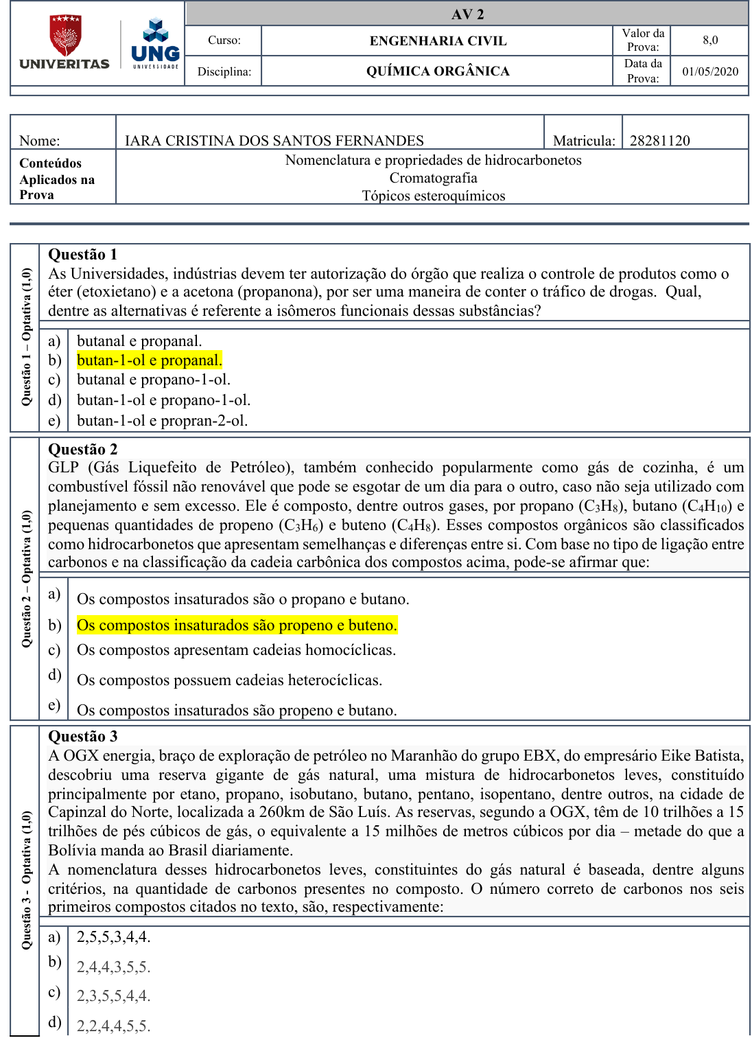 AV 2 Curso: ENGENHARIA CIVIL Valor da Prova: 8,0 Disciplina: QUÍMICA ORGÂNICA Data da Prova: 01/05/2020 Nome: IARA CRISTINA DOS SANTOS FERNANDES Matricula: 28281120 Conteúdos Aplicados na Prova Nomenclatura e propriedades de hidrocarbonetos Cromatografia Tópicos esteroquímicos Q ue st ão 1 – O pt at iv a (1 ,0 ) Questão 1 As Universidades, indústrias devem ter autorização do órgão que realiza o controle de produtos como o éter (etoxietano) e a acetona (propanona), por ser uma maneira de conter o tráfico de drogas. Qual, dentre as alternativas é referente a isômeros funcionais dessas substâncias? a) butanal e propanal. b) butan-1-ol e propanal. c) butanal e propano-1-ol. d) butan-1-ol e propano-1-ol. e) butan-1-ol e propran-2-ol. Q ue st ão 2 – O pt at iv a (1 ,0 ) Questão 2 GLP (Gás Liquefeito de Petróleo), também conhecido popularmente como gás de cozinha, é um combustível fóssil não renovável que pode se esgotar de um dia para o outro, caso não seja utilizado com planejamento e sem excesso. Ele é composto, dentre outros gases, por propano (C3H8), butano (C4H10) e pequenas quantidades de propeno (C3H6) e buteno (C4H8). Esses compostos orgânicos são classificados como hidrocarbonetos que apresentam semelhanças e diferenças entre si. Com base no tipo de ligação entre carbonos e na classificação da cadeia carbônica dos compostos acima, pode-se afirmar que: a) Os compostos insaturados são o propano e butano. b) Os compostos insaturados são propeno e buteno. c) Os compostos apresentam cadeias homocíclicas. d) Os compostos possuem cadeias heterocíclicas. e) Os compostos insaturados são propeno e butano. Q ue st ão 3 - O pt at iv a (1 ,0 ) Questão 3 A OGX energia, braço de exploração de petróleo no Maranhão do grupo EBX, do empresário Eike Batista, descobriu uma reserva gigante de gás natural, uma mistura de hidrocarbonetos leves, constituído principalmente por etano, propano, isobutano, butano, pentano, isopentano, dentre outros, na cidade de Capinzal do Norte, localizada a 260km de São Luís. As reservas, segundo a OGX, têm de 10 trilhões a 15 trilhões de pés cúbicos de gás, o equivalente a 15 milhões de metros cúbicos por dia – metade do que a Bolívia manda ao Brasil diariamente. A nomenclatura desses hidrocarbonetos leves, constituintes do gás natural é baseada, dentre alguns critérios, na quantidade de carbonos presentes no composto. O número correto de carbonos nos seis primeiros compostos citados no texto, são, respectivamente: a) 2,5,5,3,4,4. b) 2,4,4,3,5,5. c) 2,3,5,5,4,4. d) 2,2,4,4,5,5. AV 2 Curso: ENGENHARIA CIVIL Valor da Prova: 8,0 Disciplina: QUÍMICA ORGÂNICA Data da Prova: 01/05/2020 e) 2,3,4,4,5,5. Q ue st ão 4 - O pt at iv a (1 ,0 ) Questão 4 As expressões abaixo correspondem a hidrocarbonetos bastante conhecidos. • CH4; • C2H6; • C3H8. Esses hidrocarbonetos são classificados como: a) Alcanos. b) Cicloalcanos. c) Cicloalcenos. d) Alcenos. e) Alcinos. Q ue st ão 5 – O pt at iv a (1 ,0 ) Questão 5 Analise qual(is) dentre as estruturas a seguir apresenta (m) isomeria geométrica (I) (II) (III) (IV) (V) a) I, III e V b) I e III c) II e III d) II, III e V e) I, IV e V Q ue st ão 6 - O pt at iv a (1 ,0 ) Questão 6 O petróleo é um líquido viscoso, menos denso que a água e formado por uma mistura complexa de compostos orgânicos, principalmente hidrocarbonetos (compostos cujas moléculas são formadas somente por átomos de carbono e de hidrogênio) associados a pequenas quantidades de outras classes de compostos que contém nitrogênio, oxigênio e enxofre. Analise a estrutura do hidrocarboneto ramificado e assinale a alternativa referente a nomenclatura correta deste composto. AV 2 Curso: ENGENHARIA CIVIL Valor da Prova: 8,0 Disciplina: QUÍMICA ORGÂNICA Data da Prova: 01/05/2020 a) 2-etil-3,5-dimetilheptano. b) 2-isobutil-4-metilhexano. c) 3,5,6-trimetiloctano. d) 2-etil-4,5-dimetilheptano. e) 3,4,6-trimetiloctano. Q ue st ão 7 - D is cu rs iv a (1 ,0 ) Questão 7 Dê o nome da seguinte substância de acordo com o sistema IUPAC: 4-metil-1- hapteno Q ue st ão 8 - D is cu rs iv a ( 1, 0) Questão 8: Informe qual a substância presente na mistura que migra mais lentamente. Justifique RESPOSTA No método de separação da cromatografia, as substâncias que são migram mais rapidamente pela fase móvel são as que possuem maior afinidade com o solvente da fase móvel e menor afinidade com a fase estacionária. AV 2 Curso: ENGENHARIA CIVIL Valor da Prova: 8,0 Disciplina: QUÍMICA ORGÂNICA Data da Prova: 01/05/2020 No caso a fase estacionária é formada por água e celulose, substâncias polares e com capacidade de fazer ligações de hidrogênio. Portanto a substância de migração mais lenta será a que possuir estas mesmas características e interagir de forma mais eficiente com a fase estacionária, ou seja, aquela que for a mais polar e que apresentar mais hidroxilas: A Capsorubina. Q ue st ão 9 - D is cu rs iv a ( 1, 0 ) Questão 9: Informe qual(is) o(s) carbono(s) quiral(is) das figuras 1, 2, 3 e 4 Q ue st ão 1 0 - D is cu rs iv a ( 1, 0) Questão 10: A seguir são apresentadas as estruturas do ácido maleico e ácido fumárico, são estruturas que apresentam a mesma fórmula molecular. O que faz com que uma seja diferente da outra? Justifique. AV 2 Curso: ENGENHARIA CIVIL Valor da Prova: 8,0 Disciplina: QUÍMICA ORGÂNICA Data da Prova: 01/05/2020 O ácido maleico e o ácido fumárico são isômeros geométricos ou diastereoisômeros cis-trans, o que resulta em propriedades físicas e químicas diferentes. Por exemplo, o ácido maleico possui as duas carboxilas no mesmo plano e, devido a isso, ele é capaz de sofrer desidratação intramolecular, ou seja, suas moléculas se rearranjam liberando uma molécula de água e formando o anidrido maleico. Isso já não acontece com o ácido fumárico, porque suas carboxilas estão em lados opostos e, por causa desse impedimento espaci